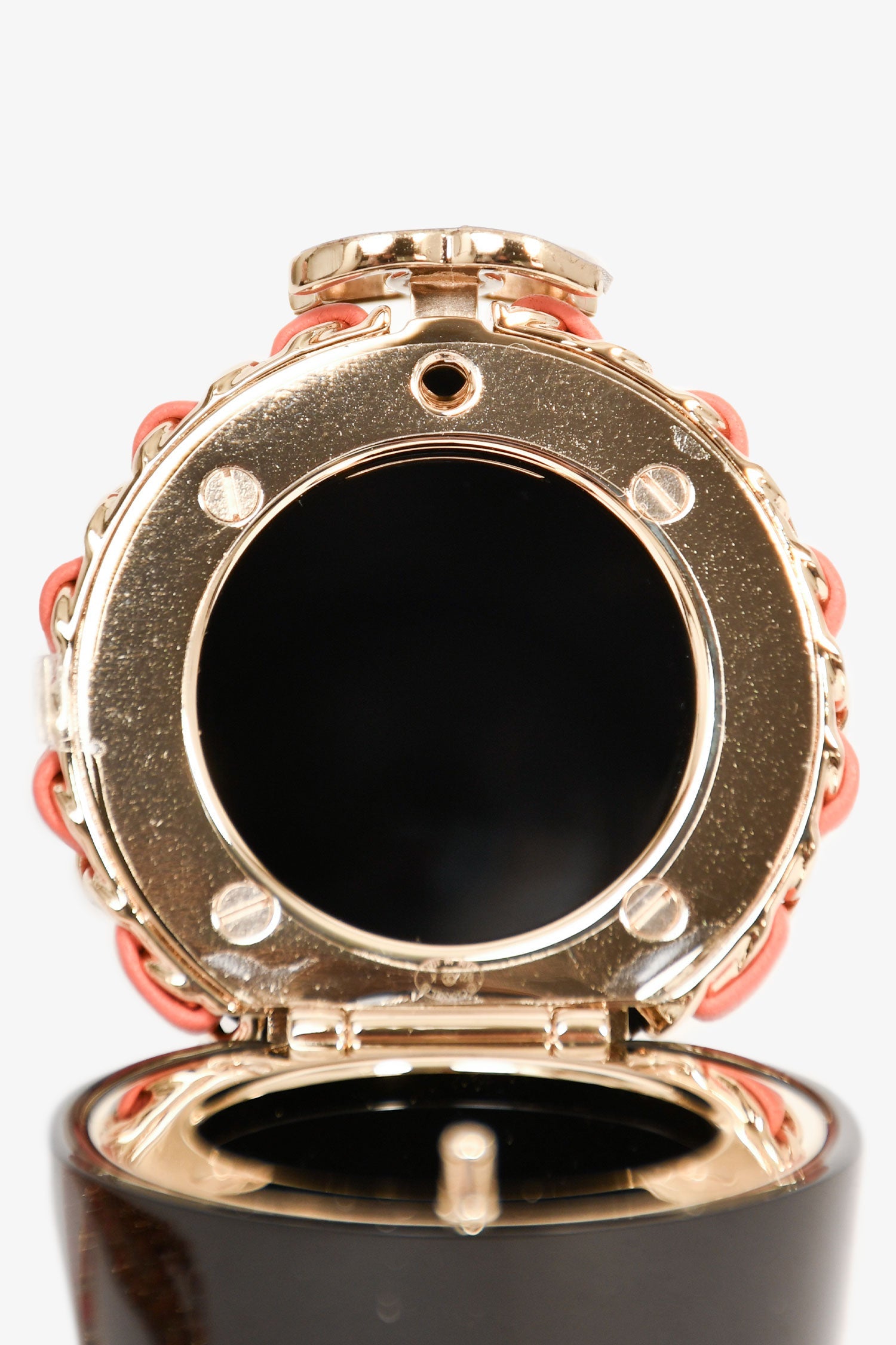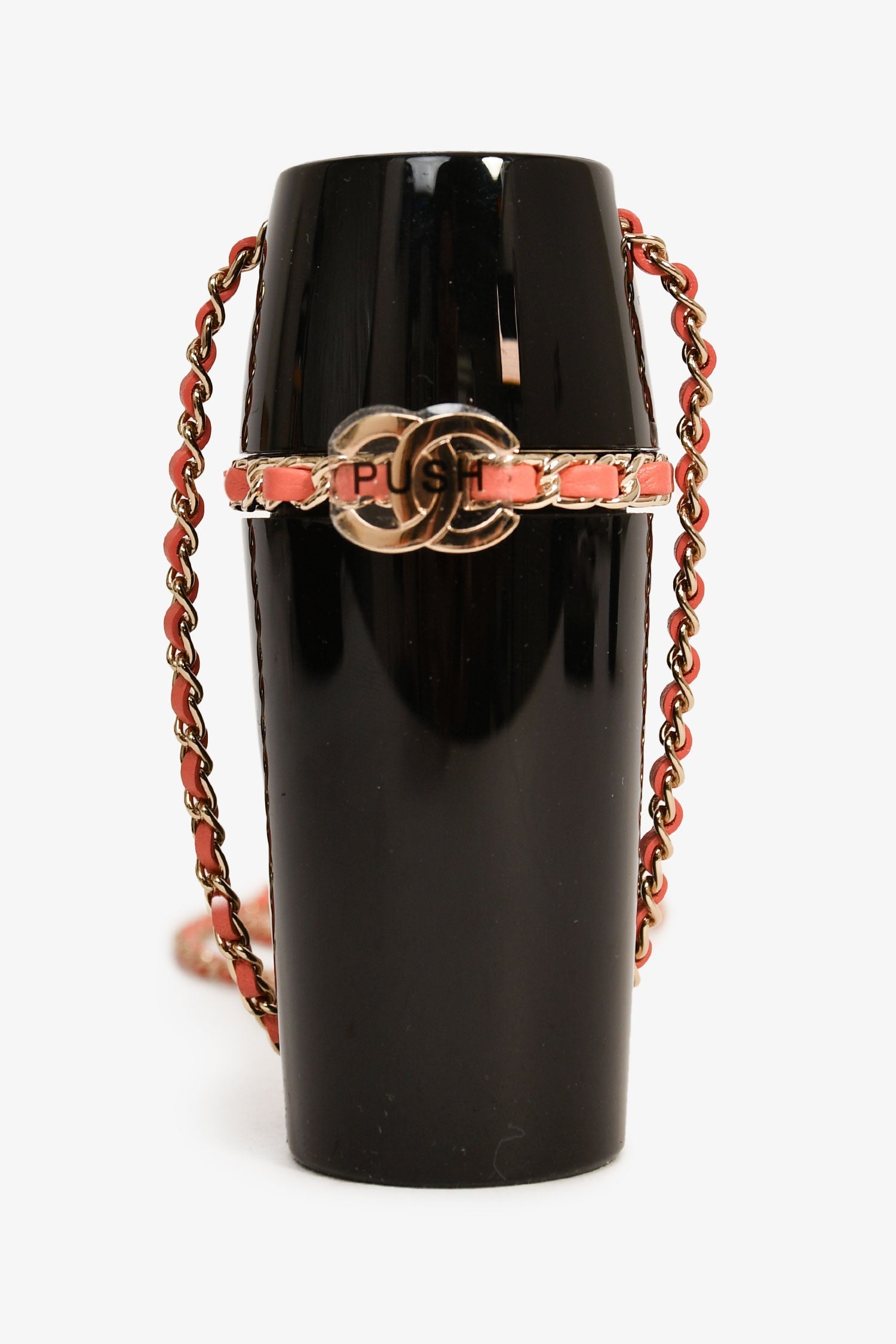 Pre-Loved Chanel™ Black Lucite Leather Pink Chain Trim Lipstick Case Necklace. Flip-cap with a push lock closure. Lucite exterior. Gold-tone hardware.