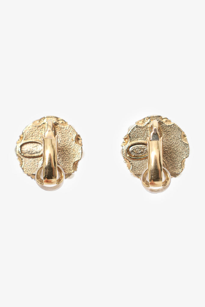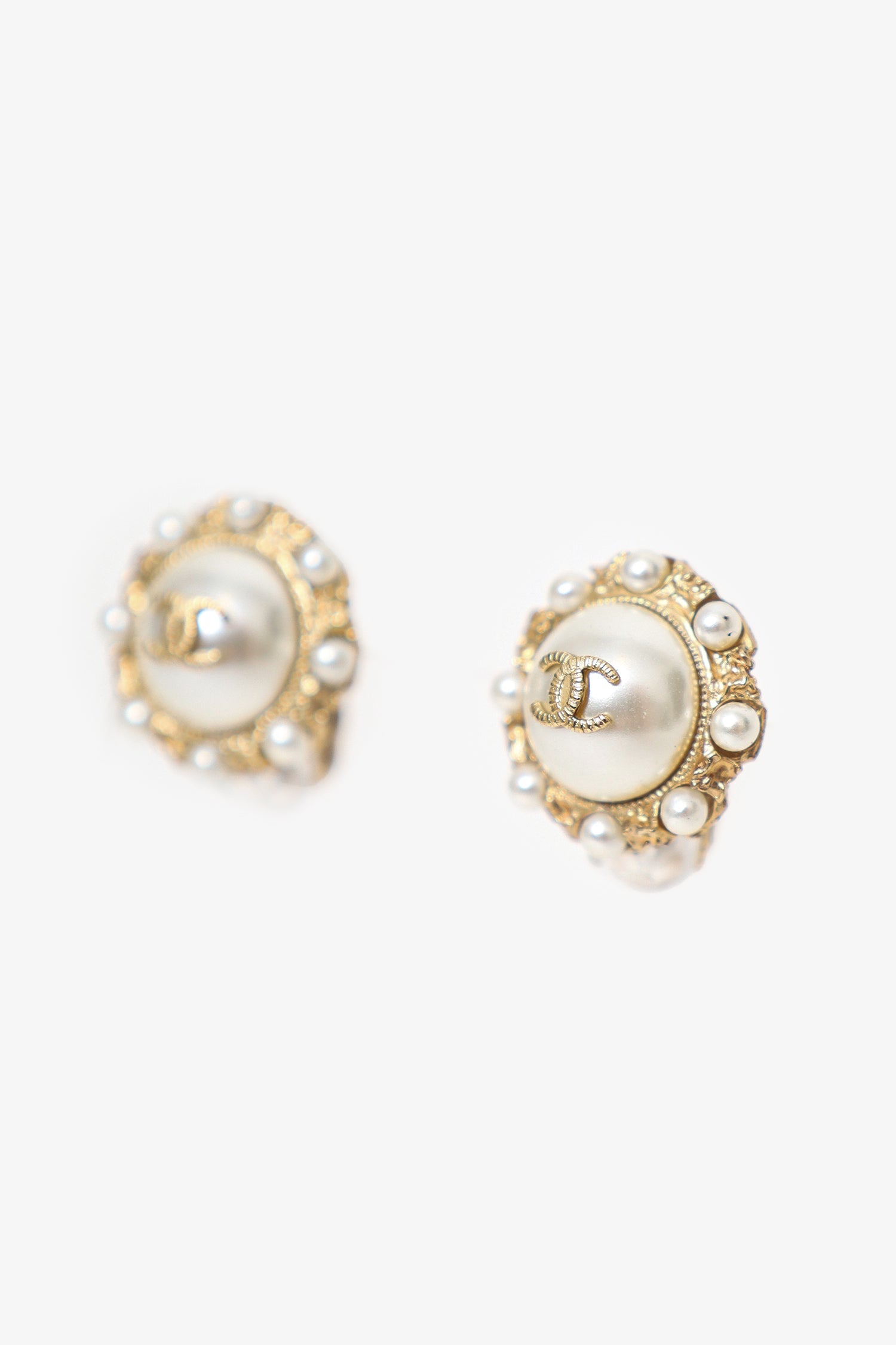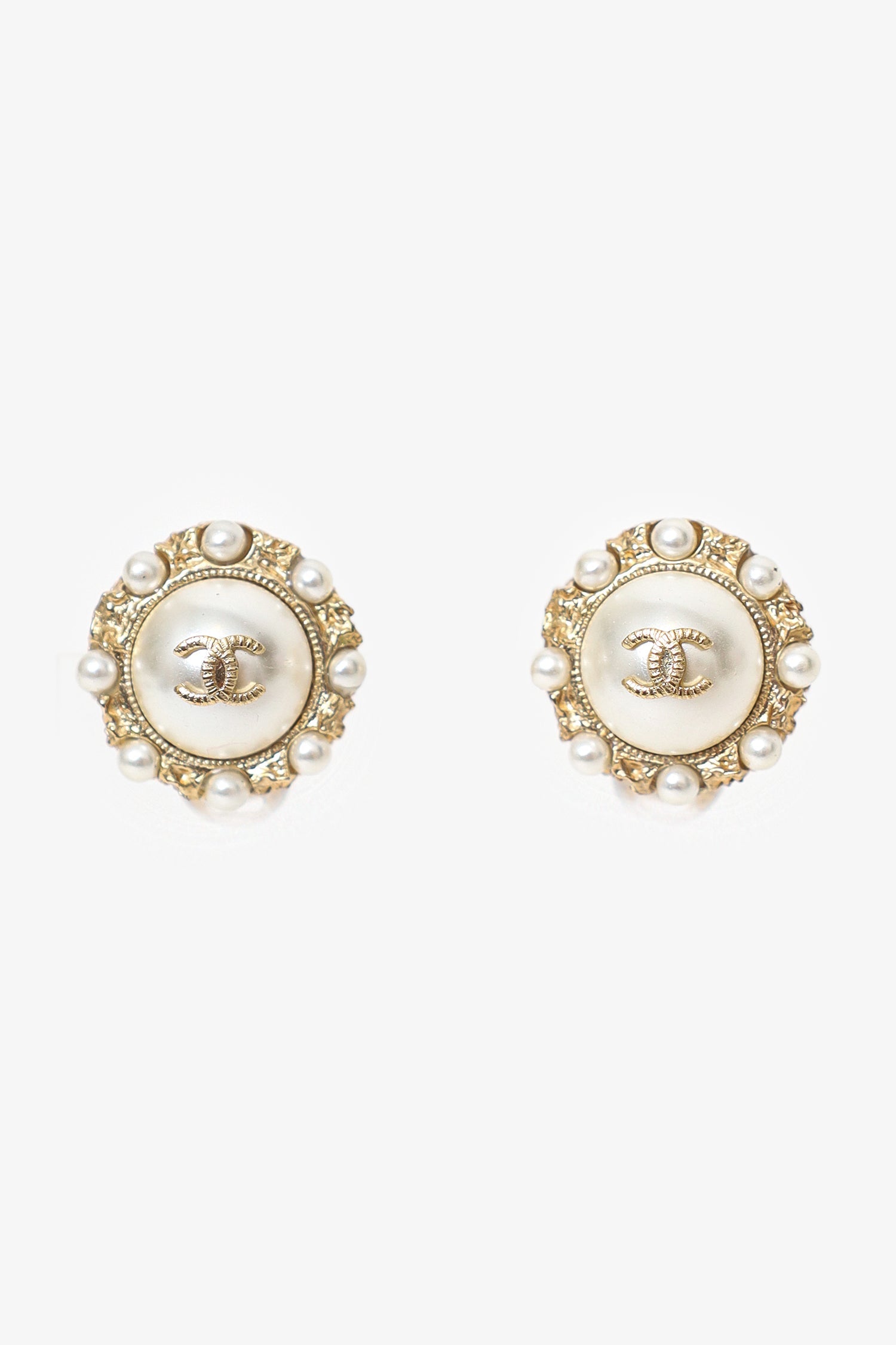 Pre-Loved Chanel™ Gold Tone Faux Pearl CC Logo Stud Earrings. Rear clip-on backing. Gold-tone hardware.