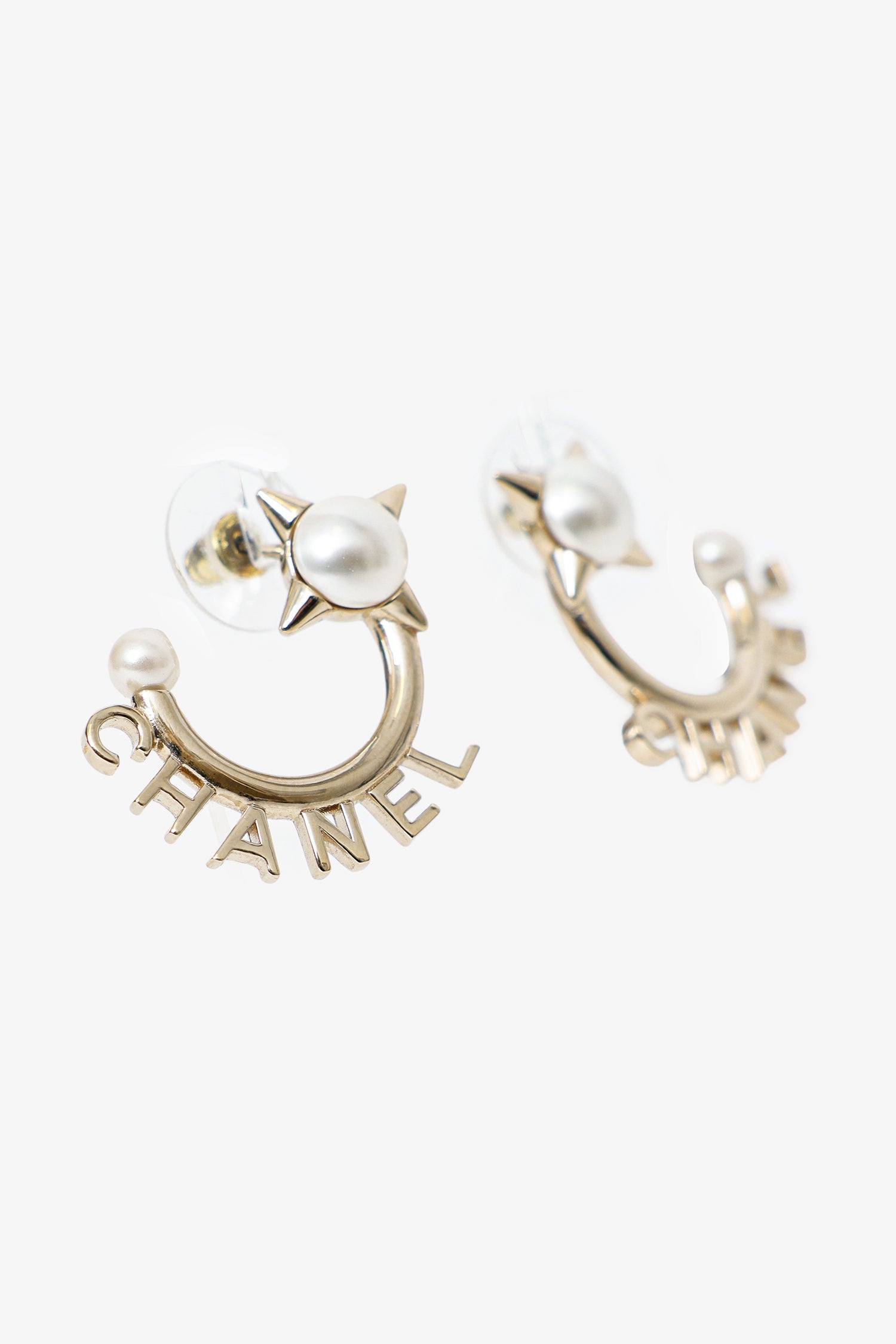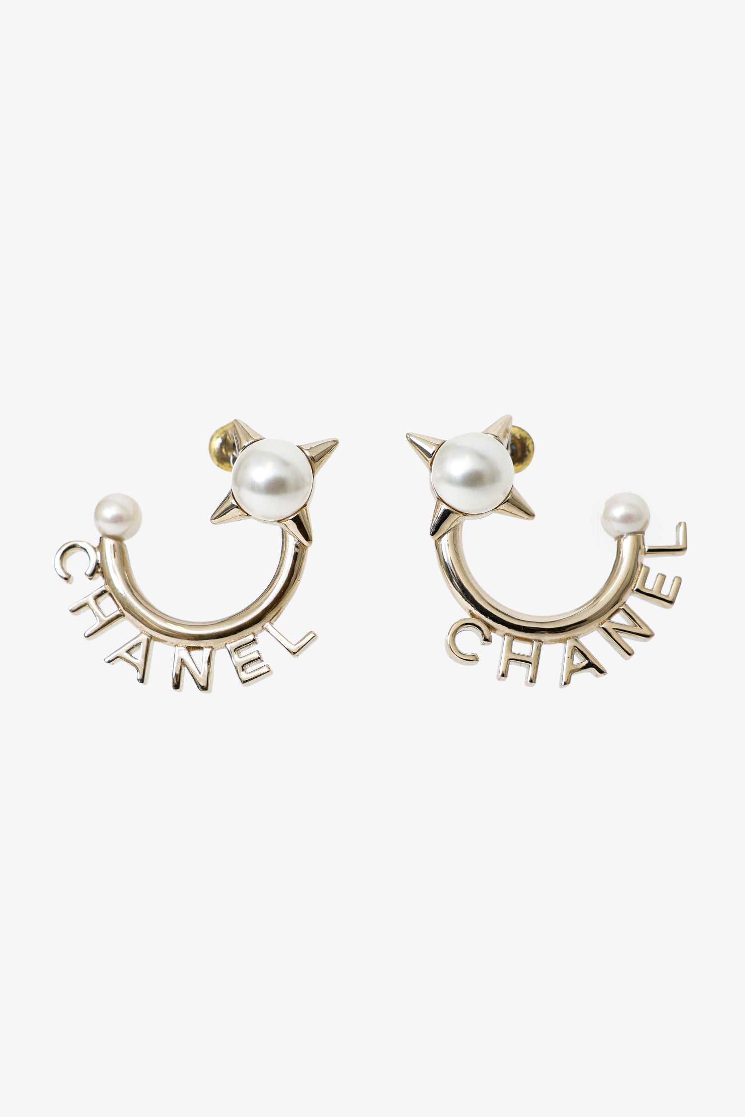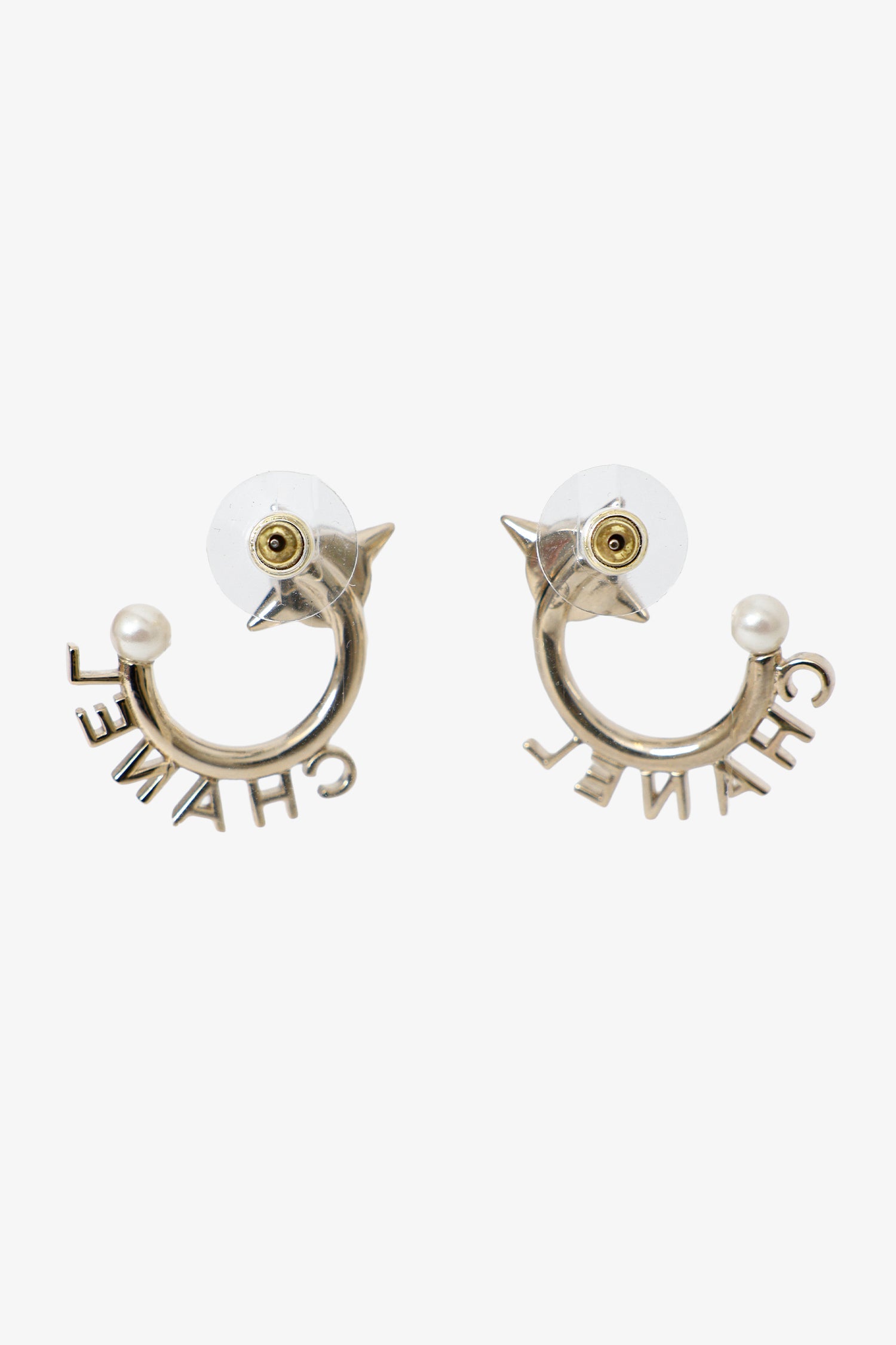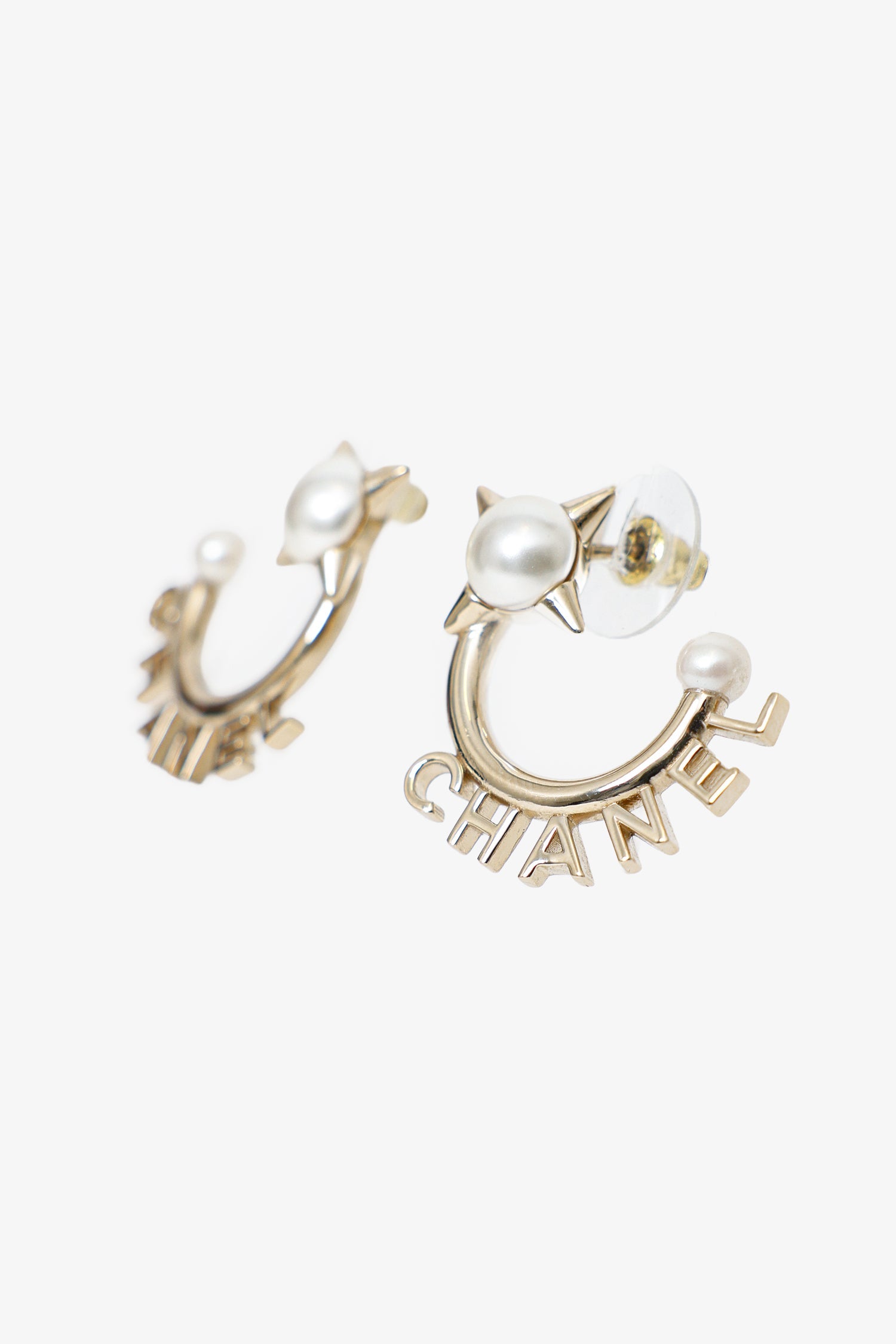 Pre-Loved Chanel™ Gold Tone Pearl Logo Hoop Earrings. Rear push-pin backing. Gold-tone hardware.