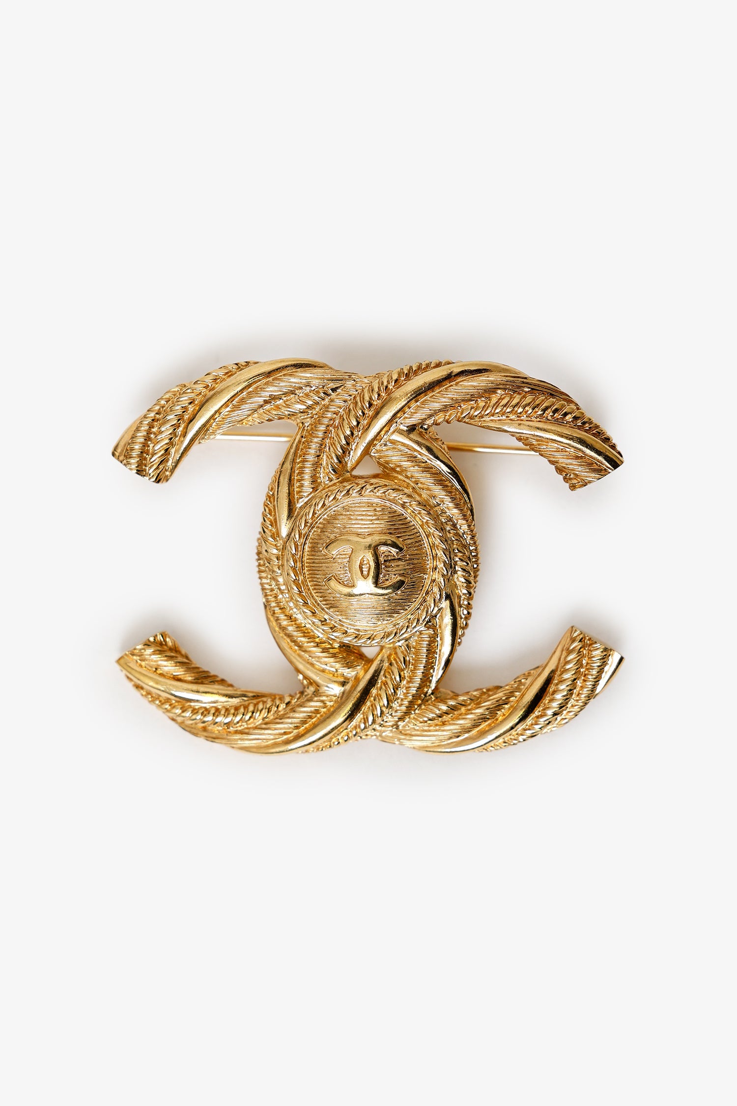 Pre-Loved Chanel™ Gold Tone Twisted CC Brooch. Rear turn-lock push-pin closure.