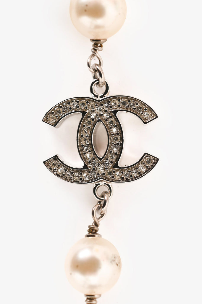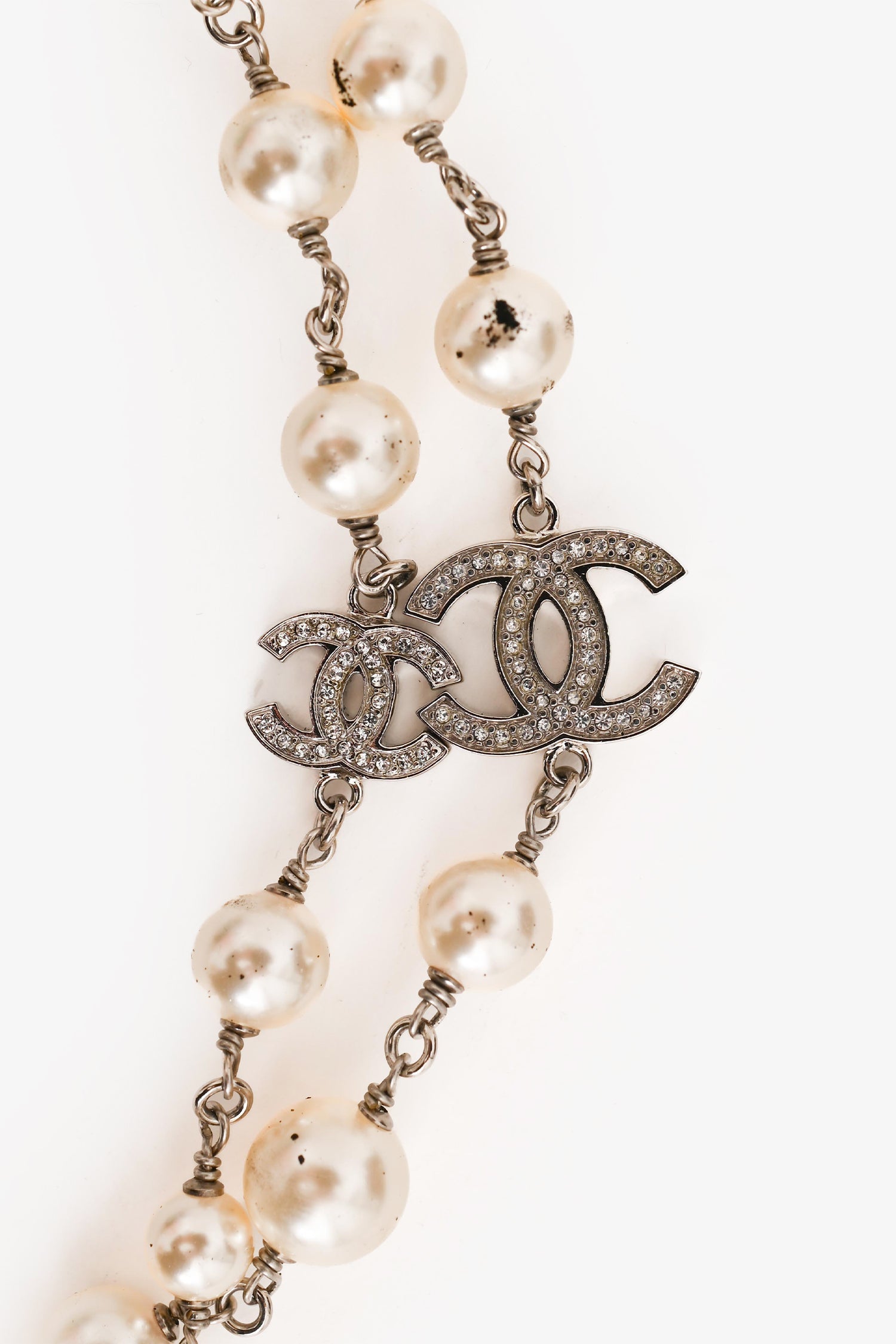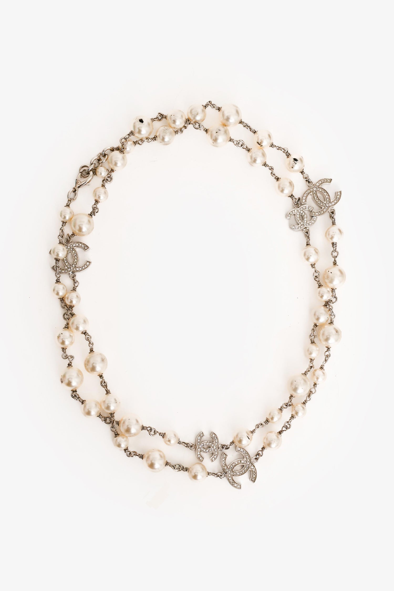 Pre-Loved Chanel™ Silver Pearl Crystal CC Necklace. Adjustable with lobster clasp closure.