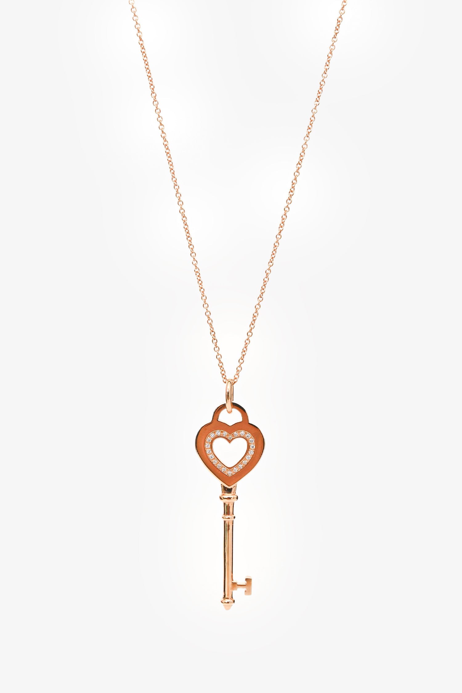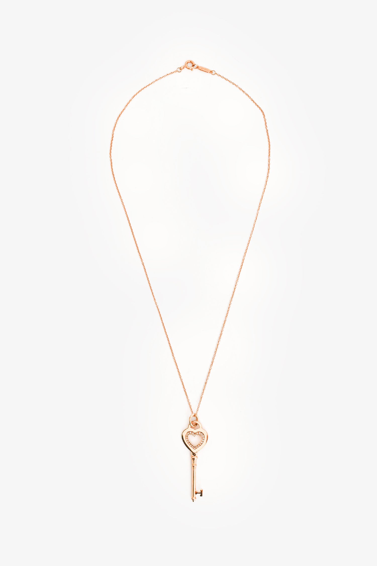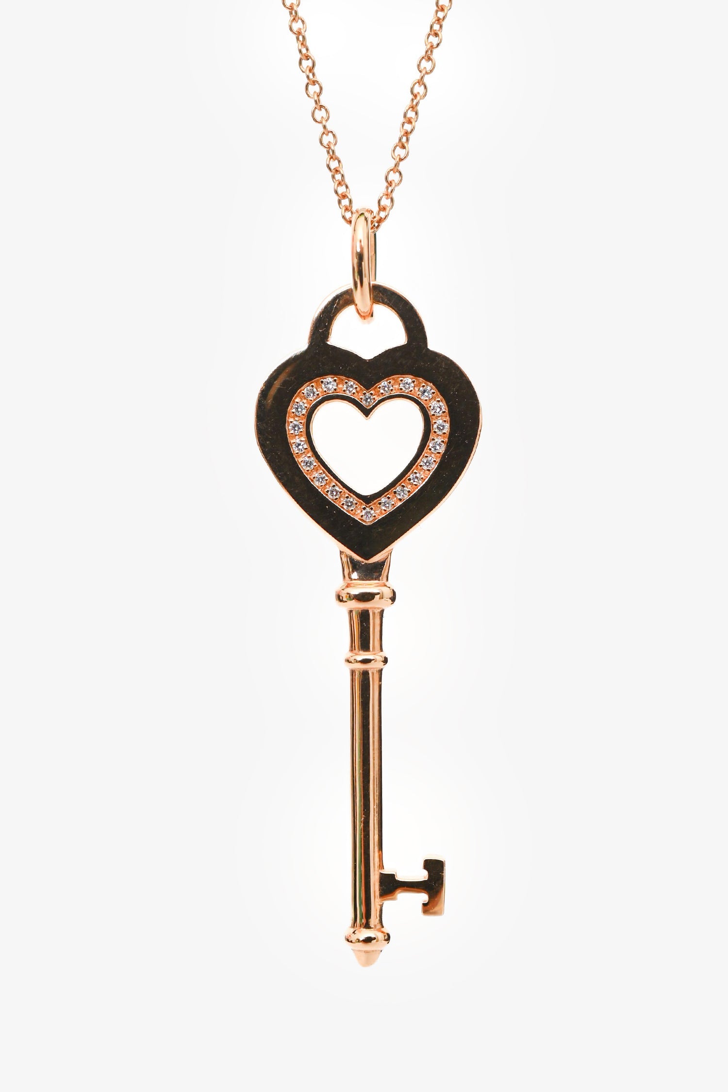 Tiffany & Co. 18K Rose Gold Diamond Heart Key Necklace. Spring ring closure.