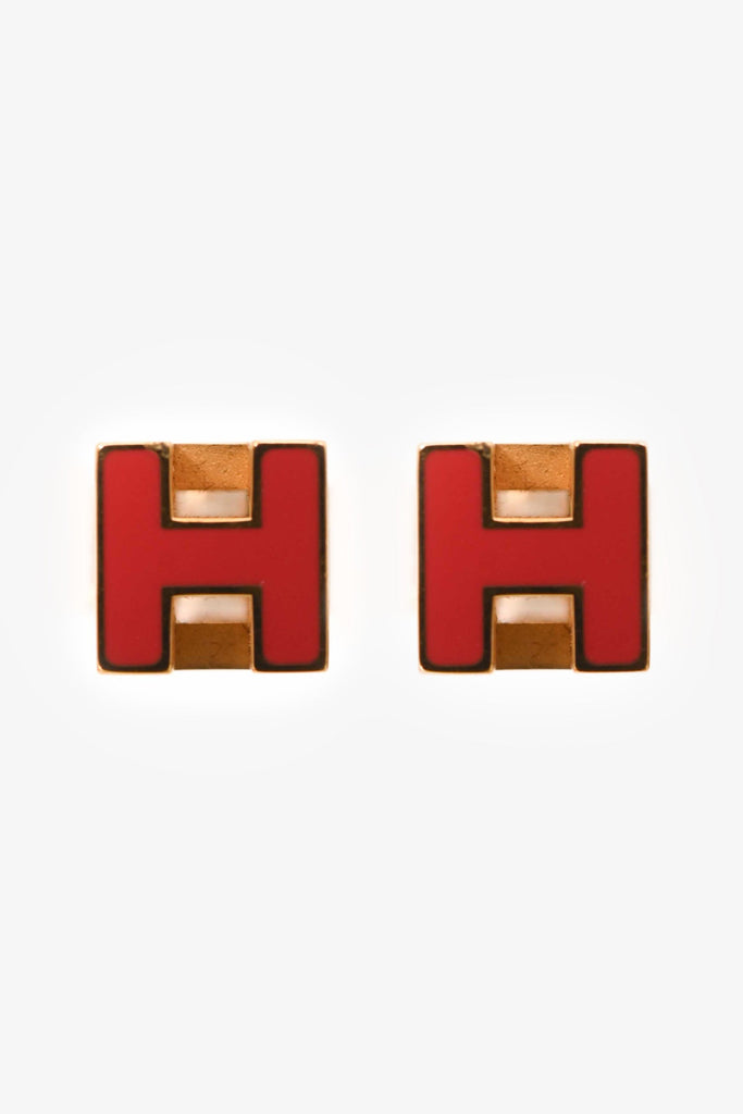 Hermès Gold Tone Metal/Red Enamel H Cube Earrings