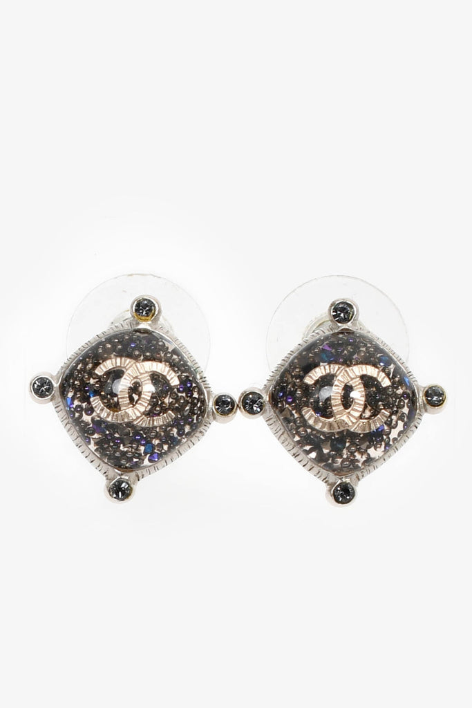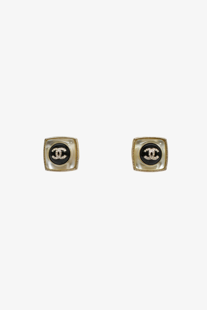 Chanel™ 2022 Champagne Gold Toned Black Crystal CC Square Stud Earrings