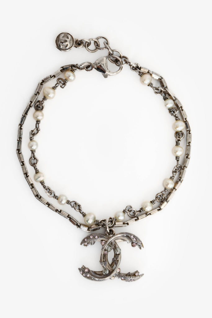 Pre-Loved Chanel™ 2013 Silver Toned Faux Pearl Stationed CC Bracelet