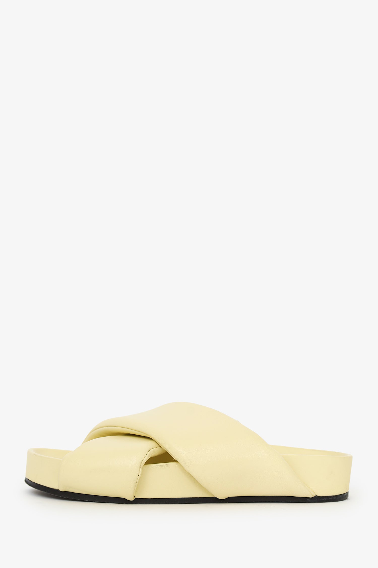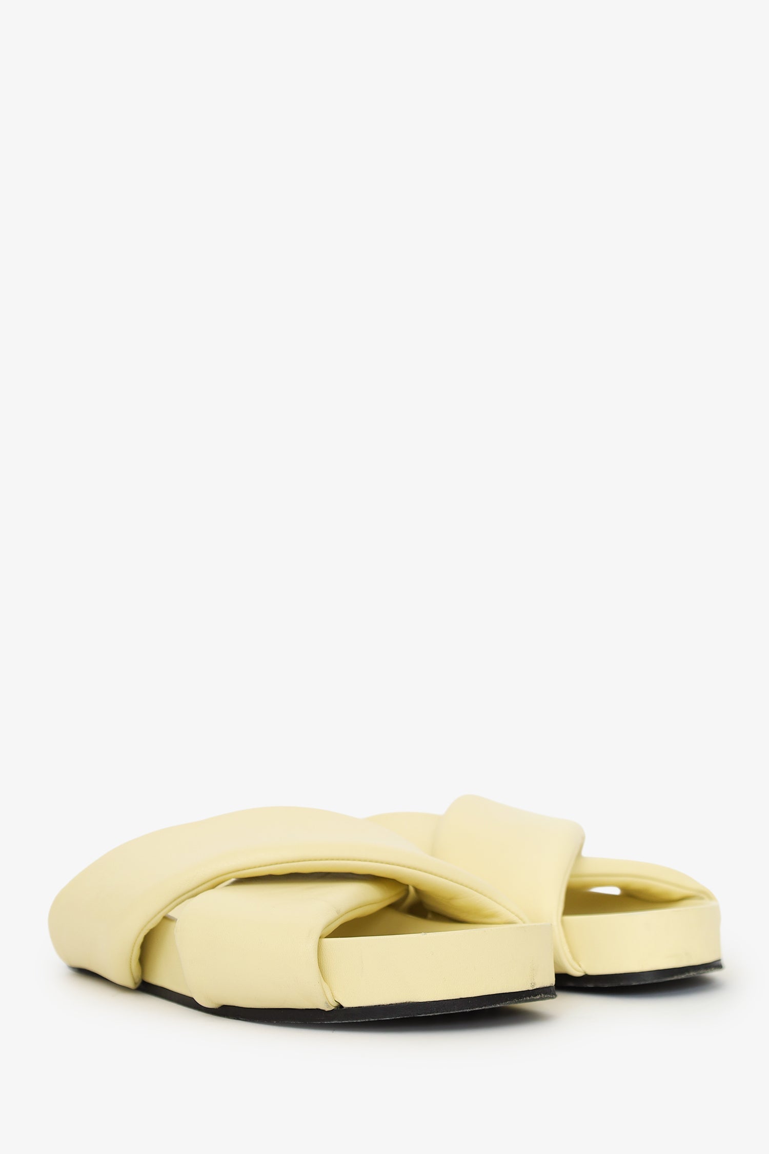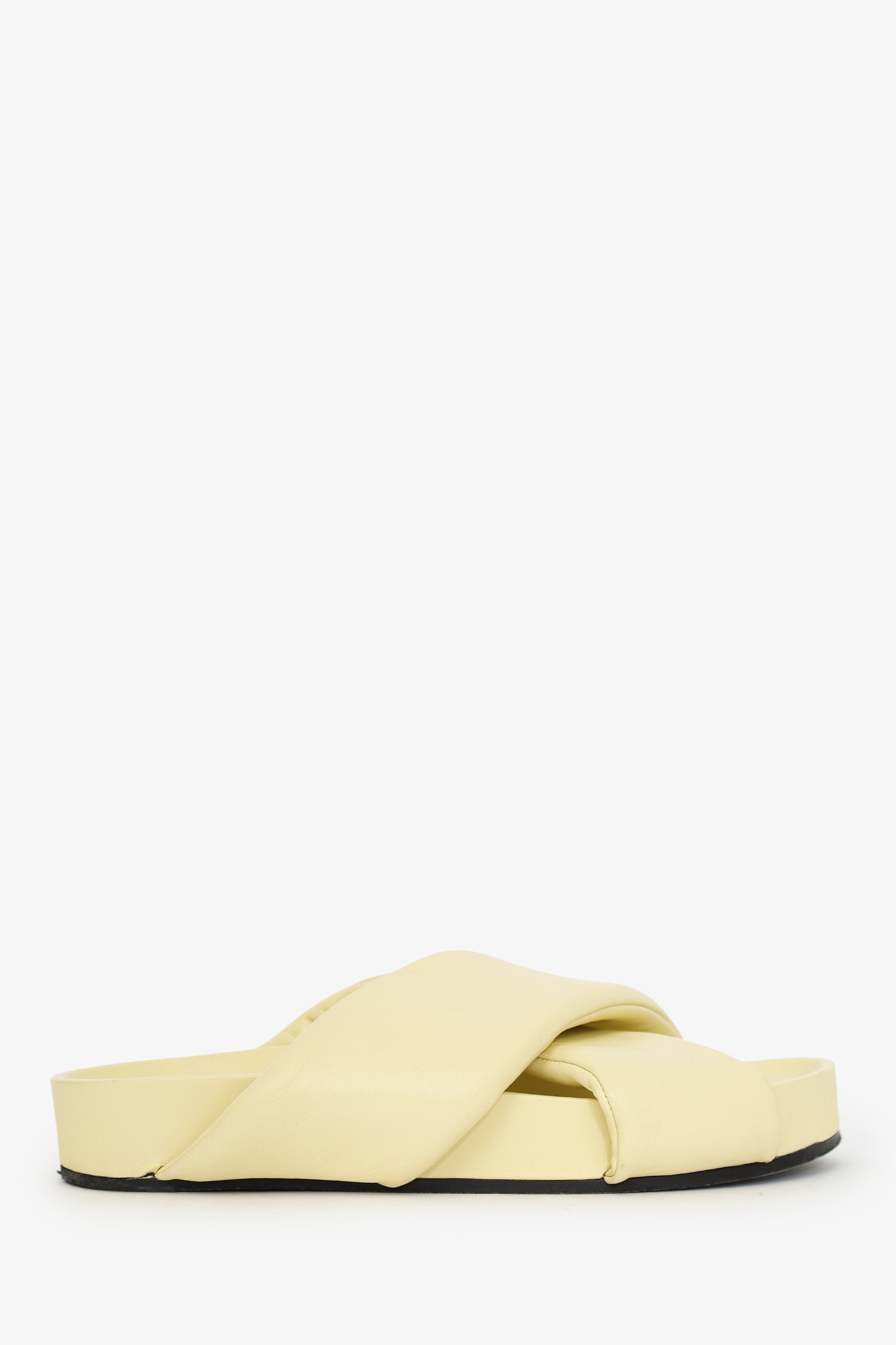 Jil Sander Yellow Padded Leather Criss-cross Sandals. Slip-on. Open round toe. Tonal stitching.