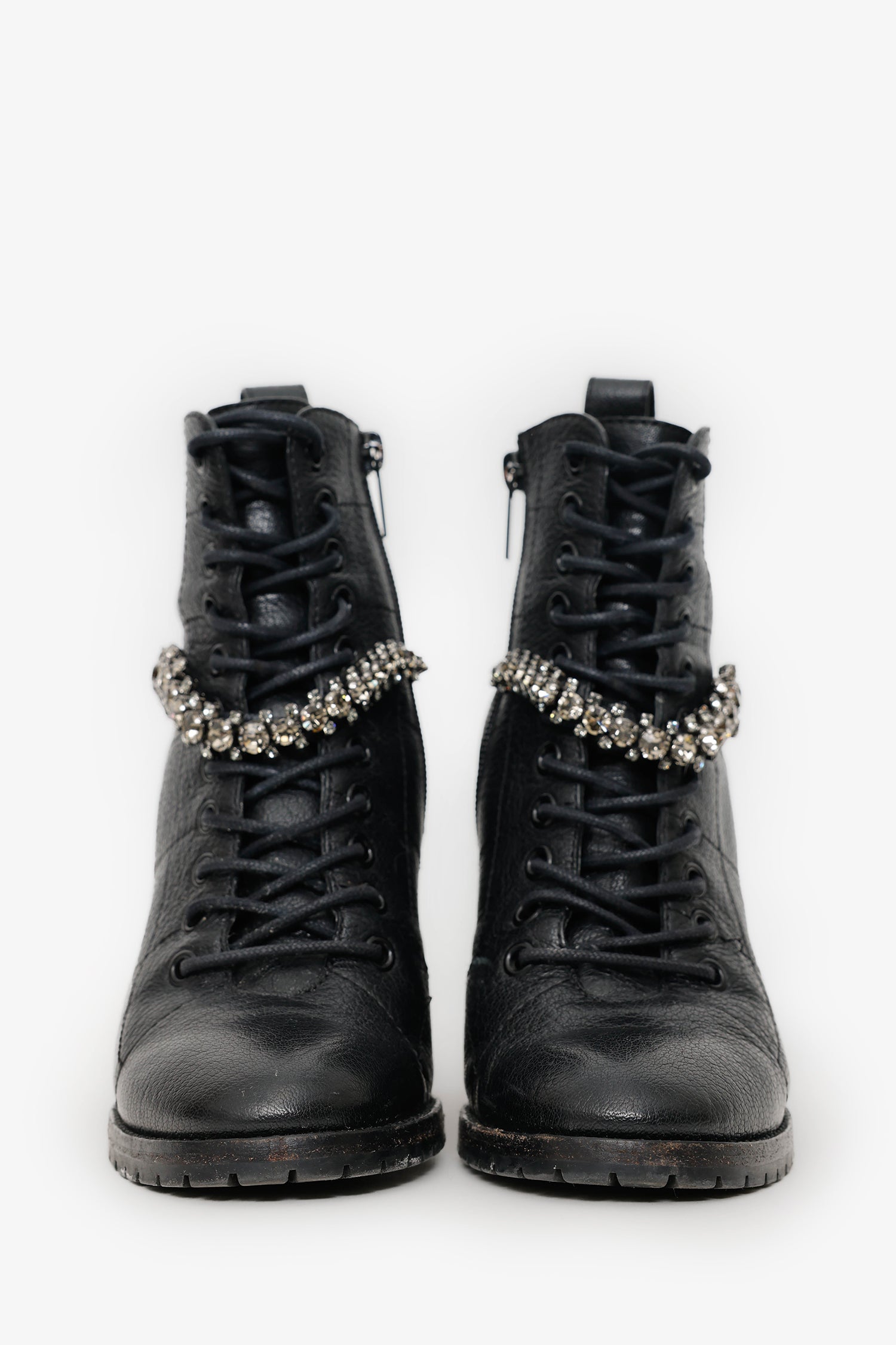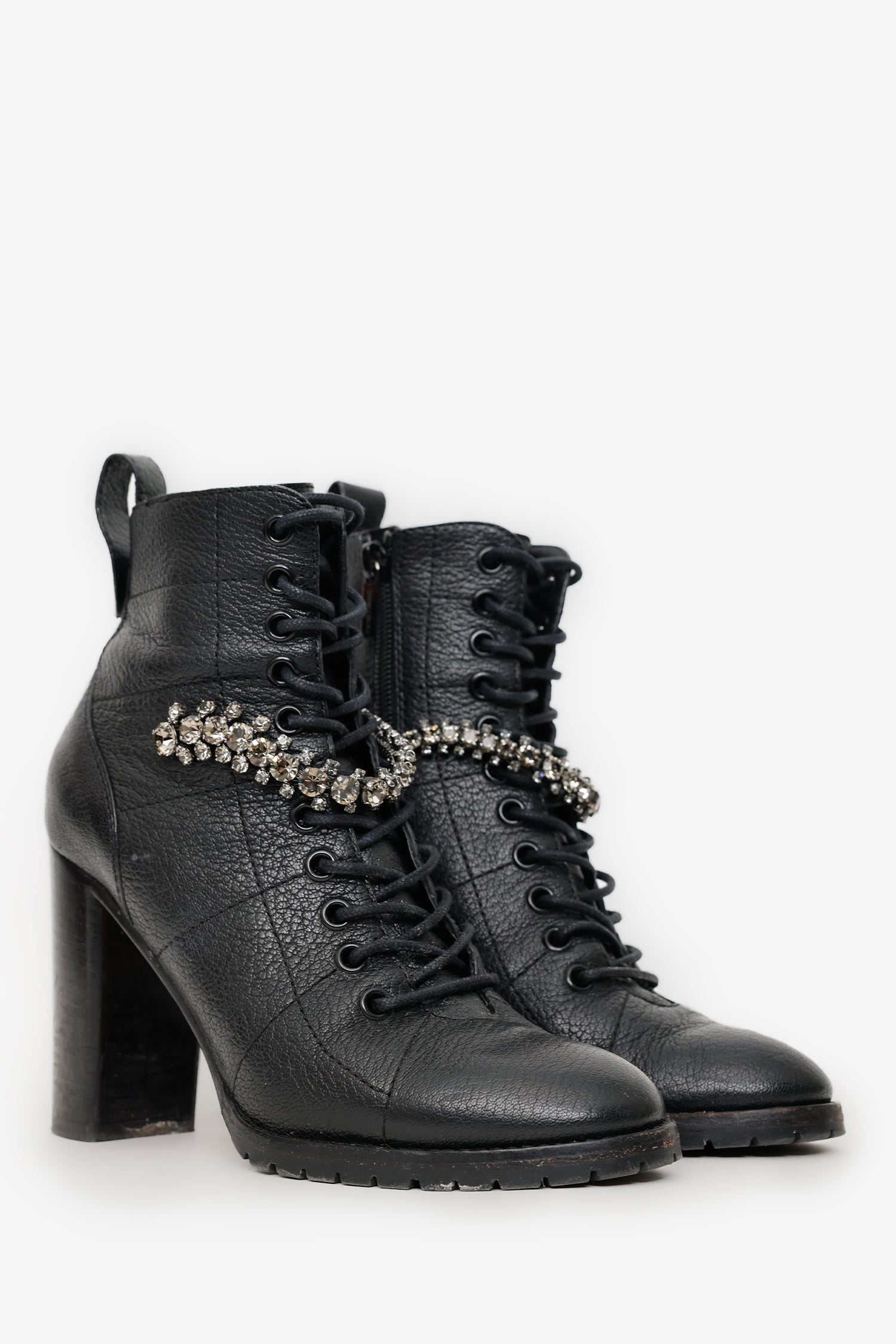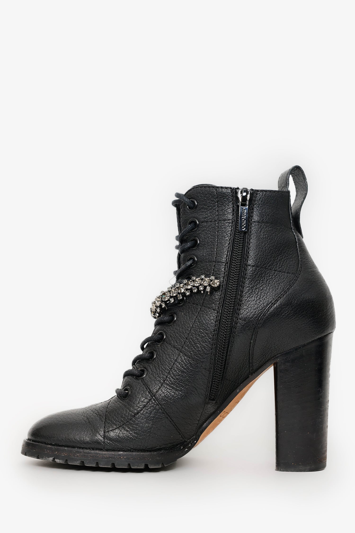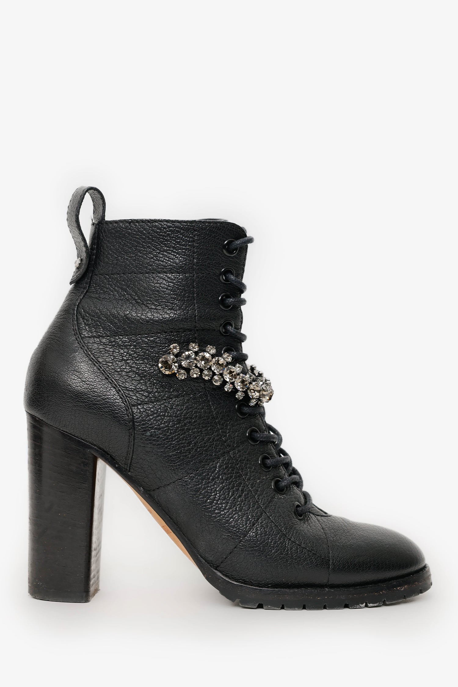 Jimmy Choo Black Leather Jewel 'Cruz' Combat Boots. Round neckline. Side zip closure. Rear pull tab. Block heel. Lined interior. Silver-tone hardware. Tonal stitching.