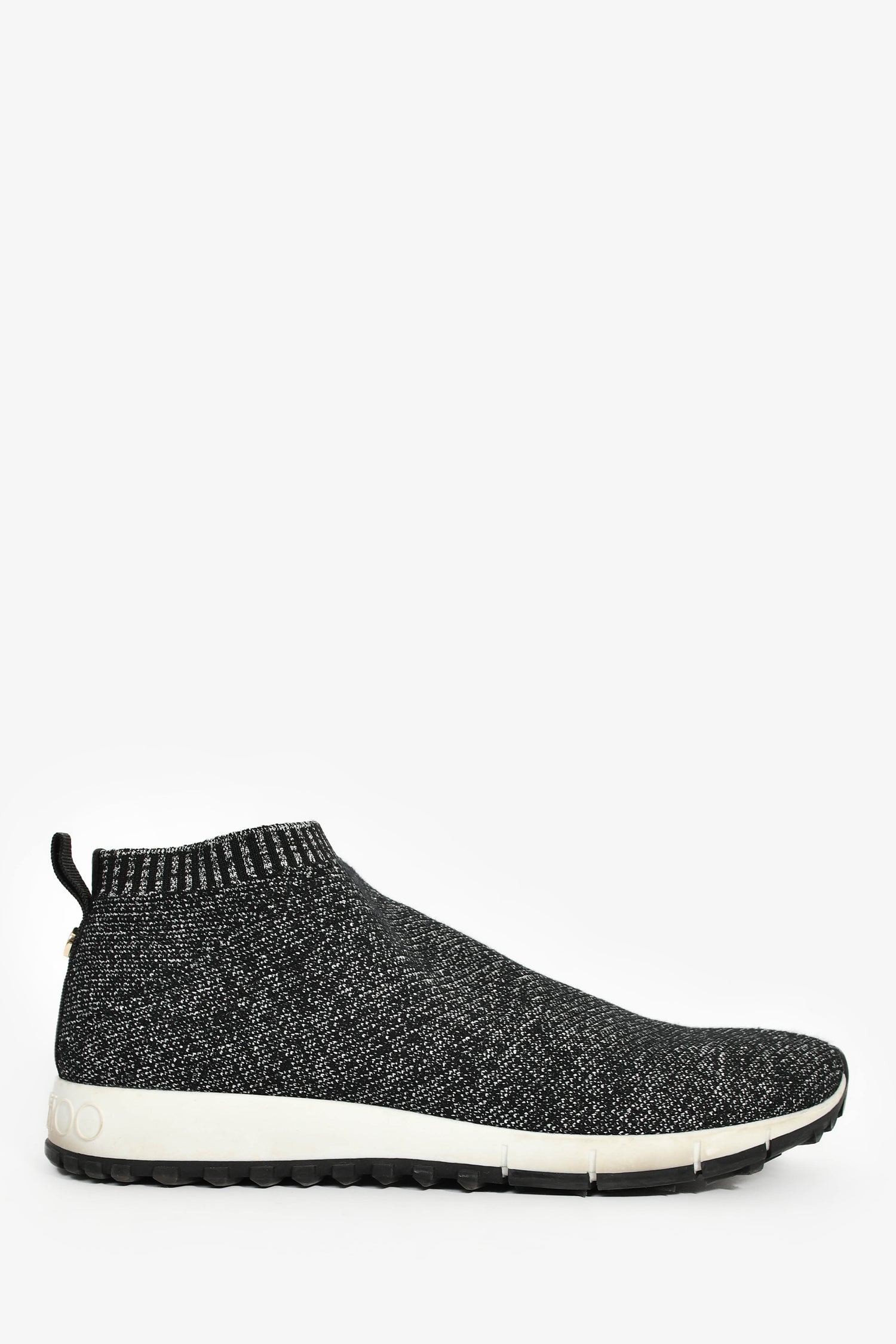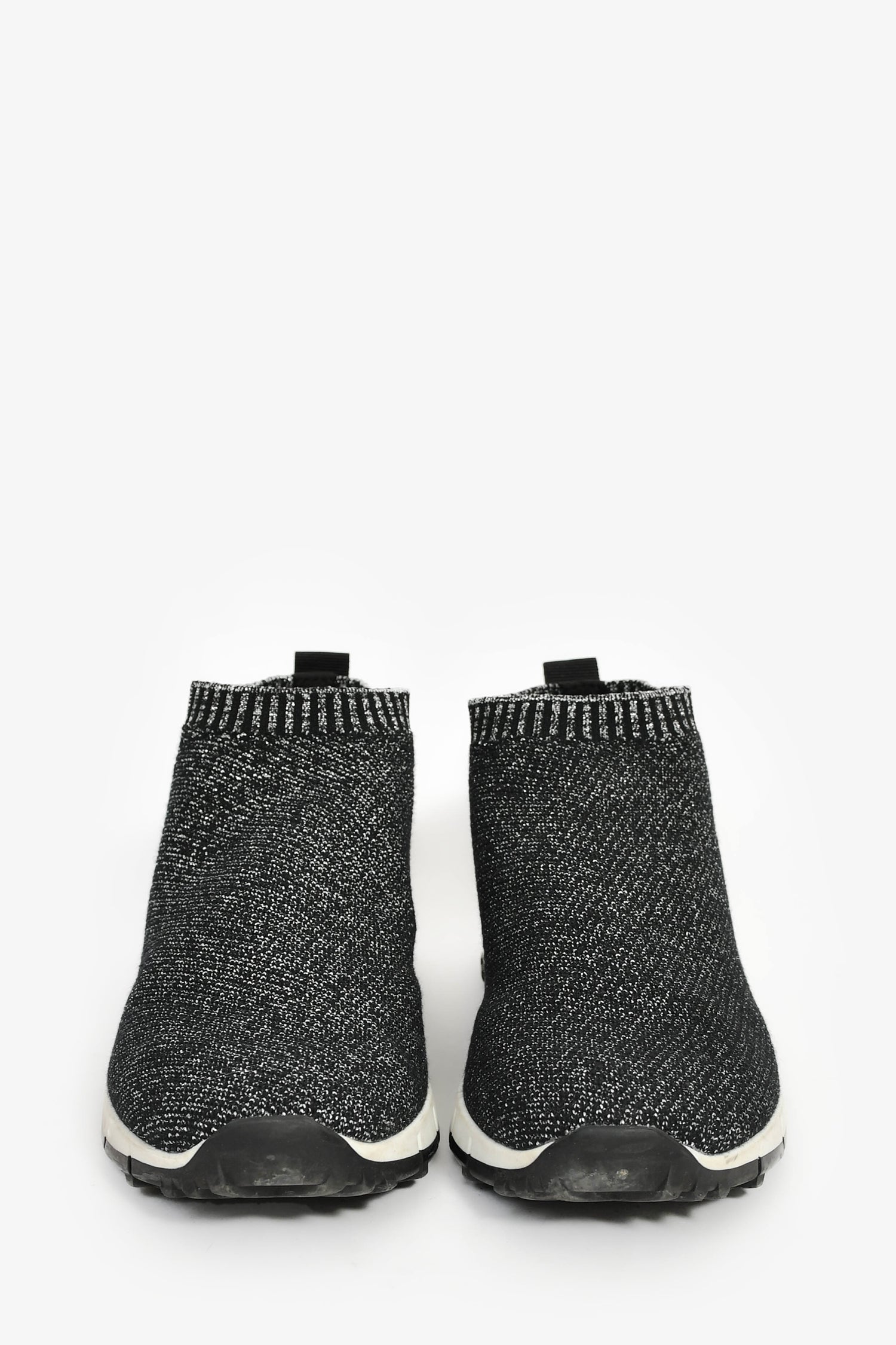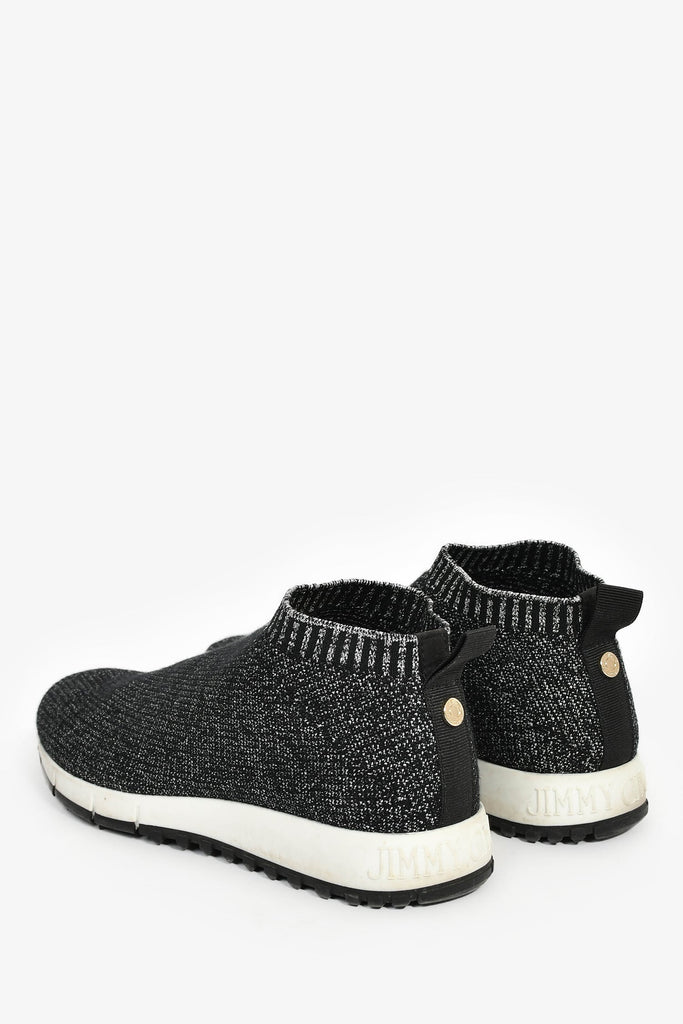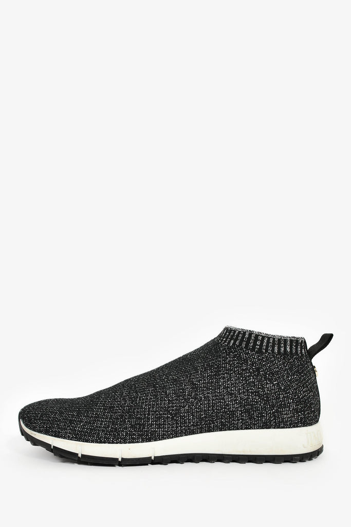 Jimmy Choo Black/Metallic Shimmer Crochet Knit Rubber Sole Sneakers. Slip-on. Almond toe. Tonal stitching.