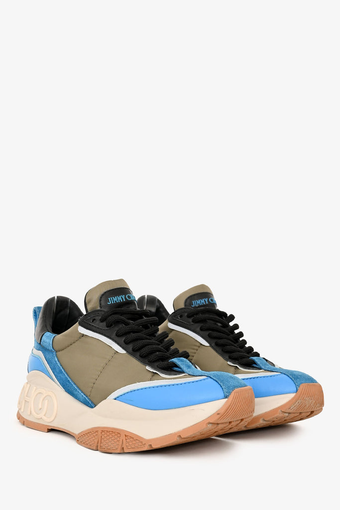 Jimmy Choo Blue/Green Leather Raine Sneakers. Slip-on. Round toe. Front lace-up closure. Tonal stitching.