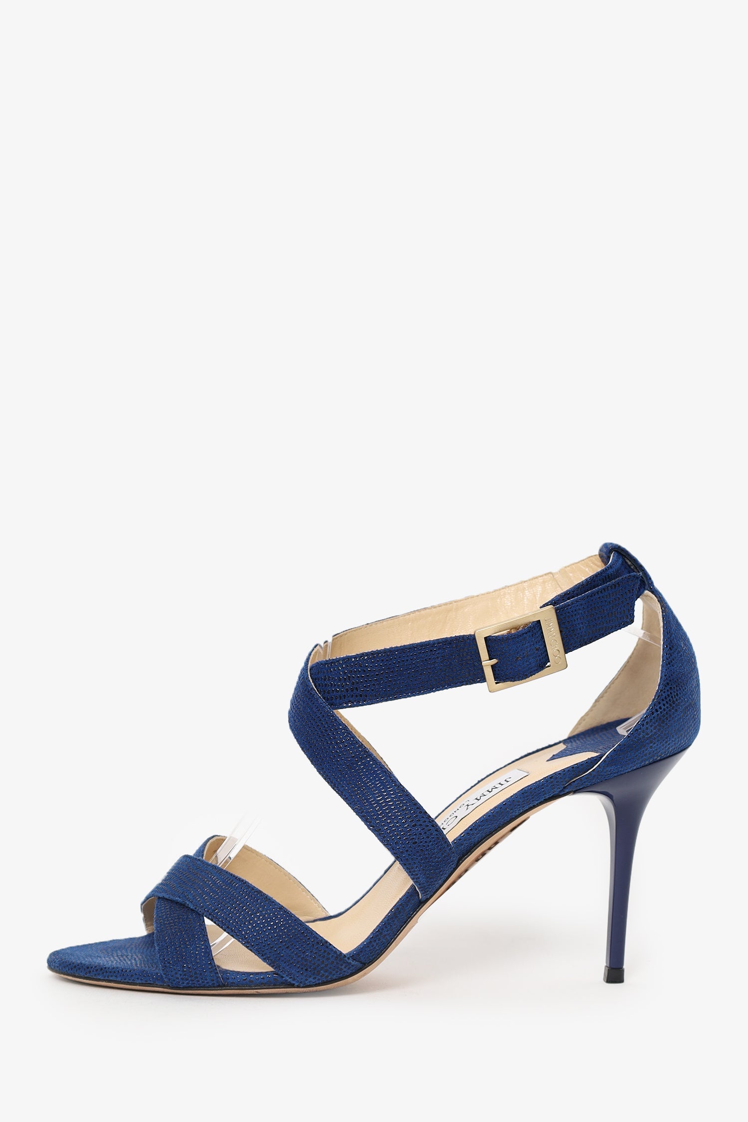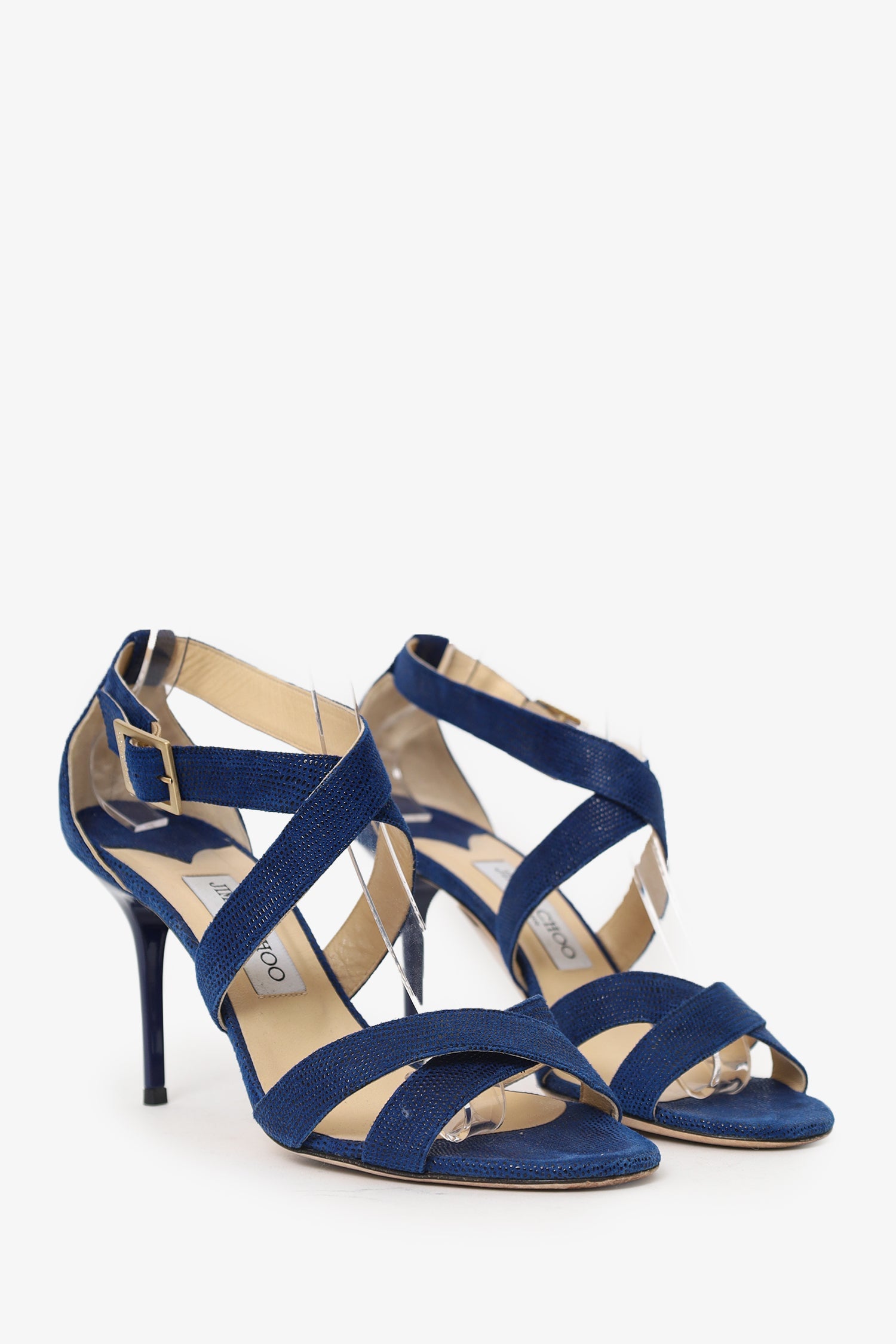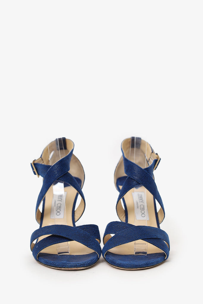 Jimmy Choo Blue Lizard Strappy Heels. Slip-on. Open-round toe. Adjustable side pull-through buckle closure. Gold-tone hardware. Tonal stitching.