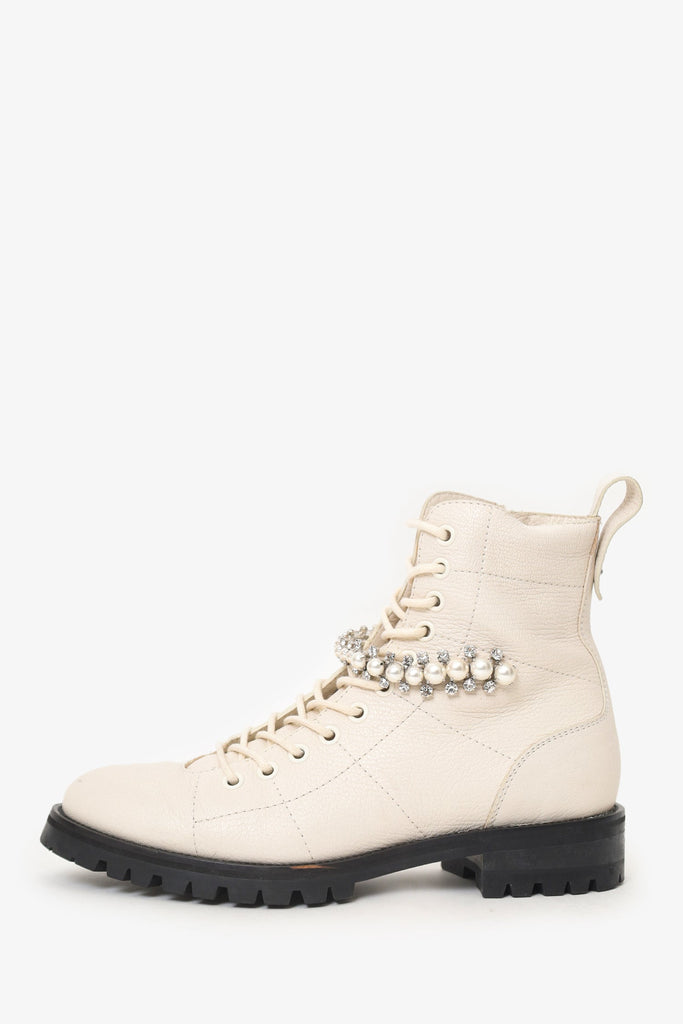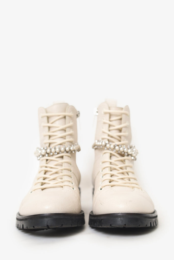 Jimmy Choo Cream Leather Crystal Embellishments Combat Boots Size 37