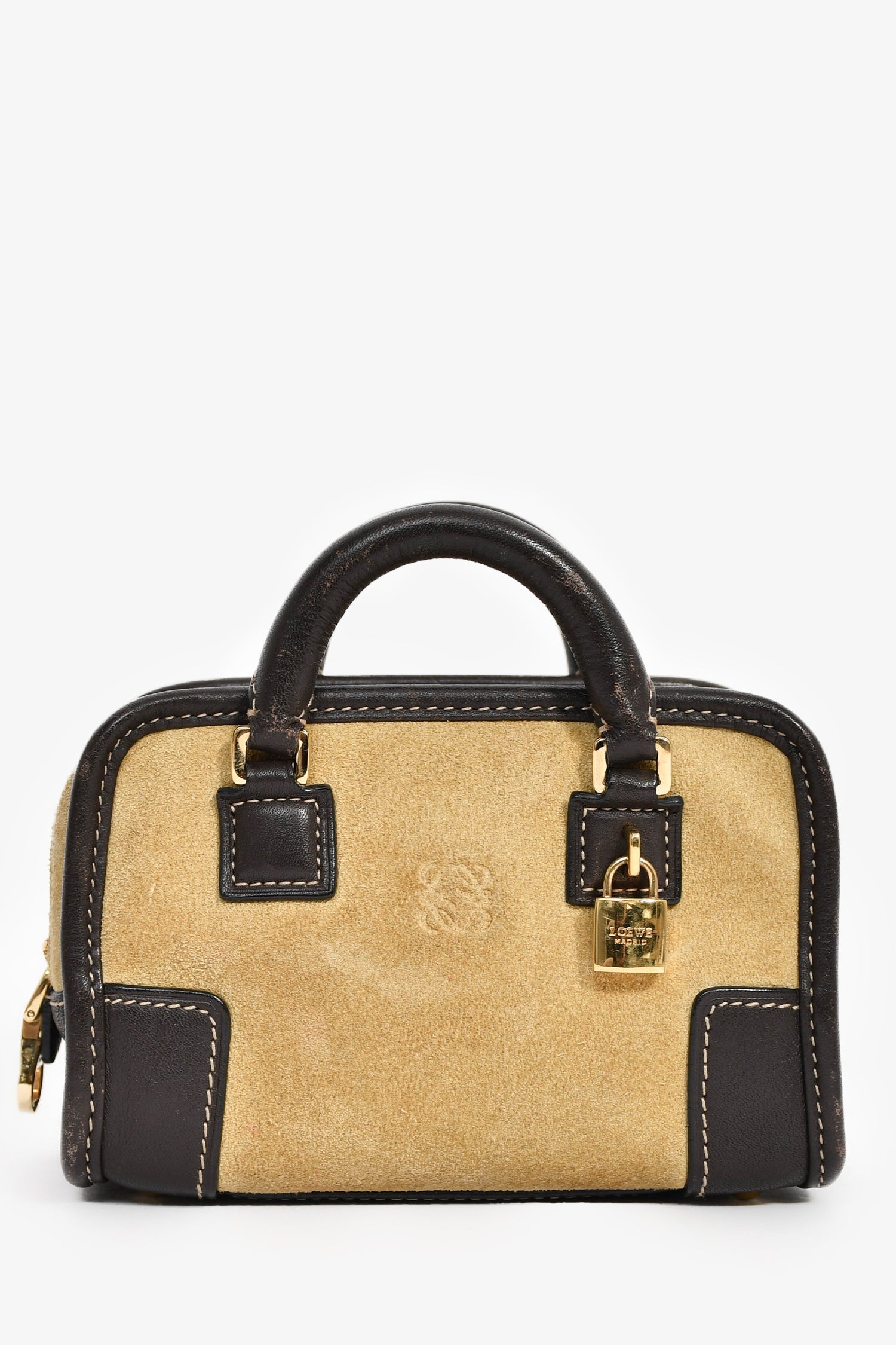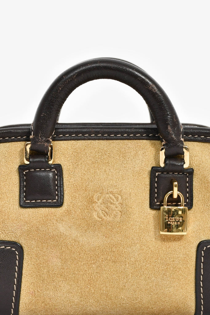 Loewe 2010 Beige/Brown Suede 'Mini Amazona' Crossbody Bag. Top zip closure. Twin top handles. Detachable strap. Single interior compartment with 2 wall slip pocket. Protective base studs. Leather-lined interior. Gold-tone hardware. Contrast stitching.