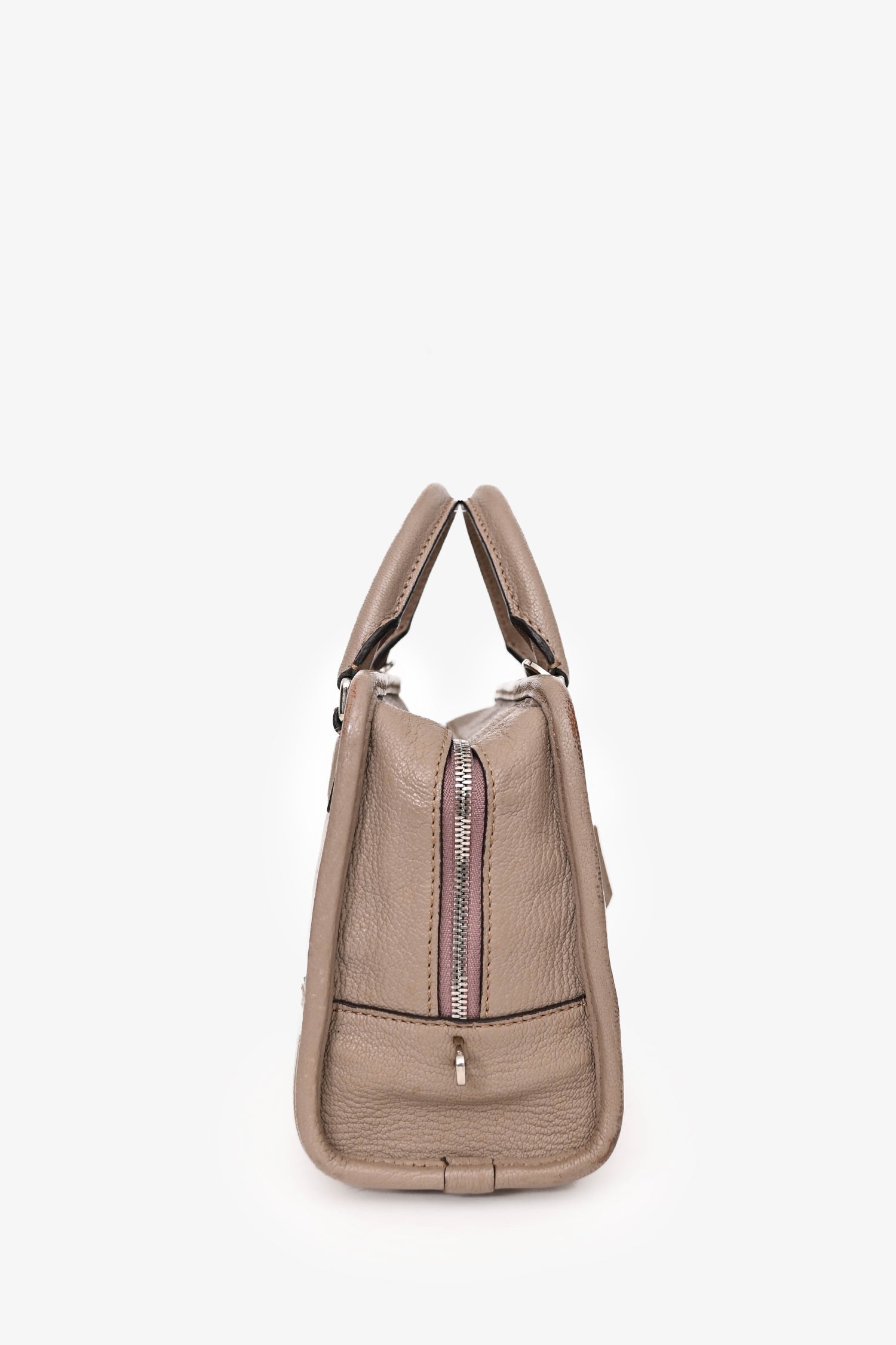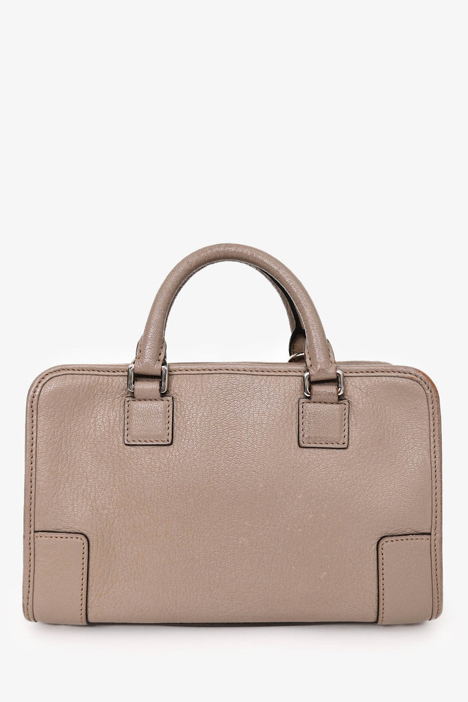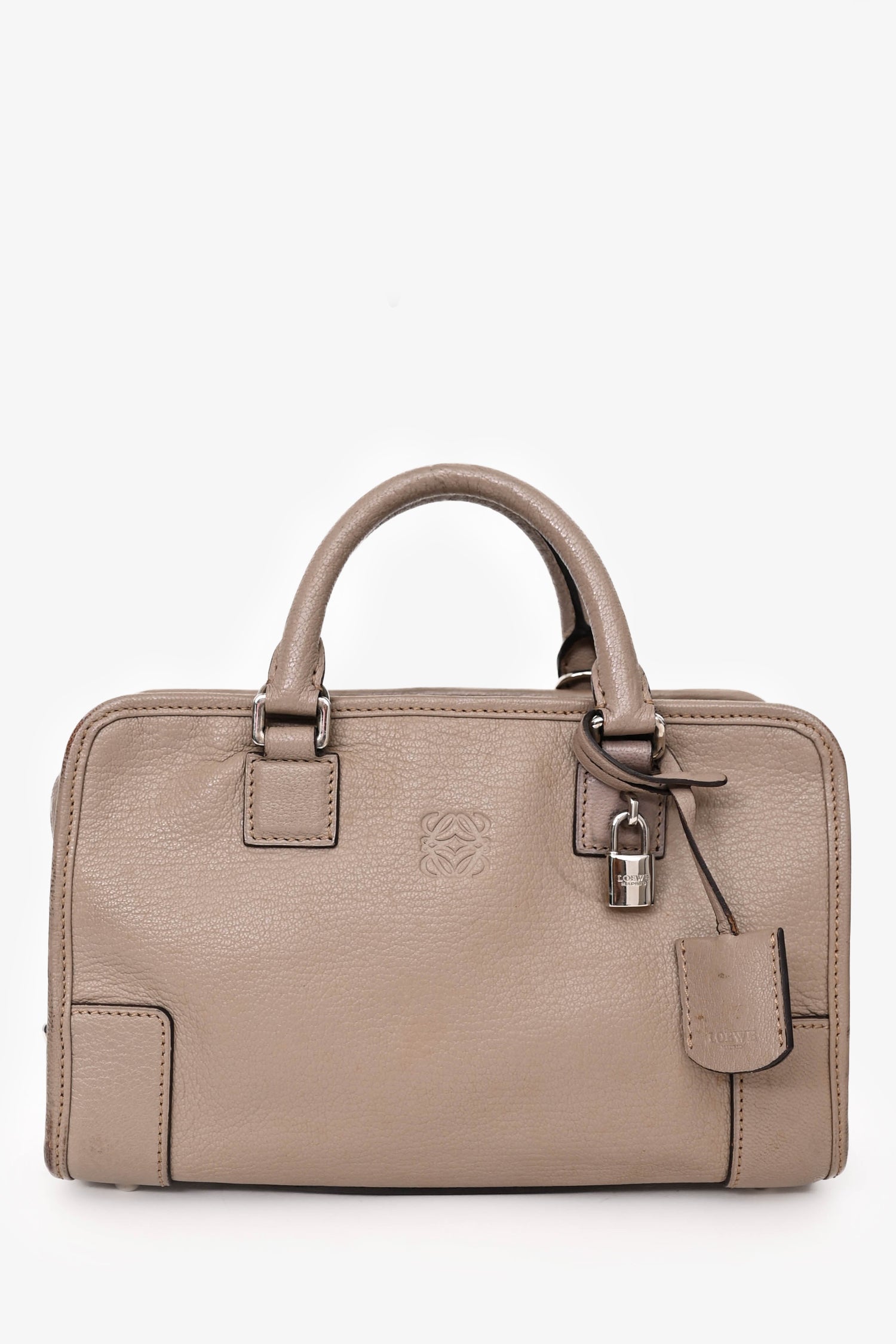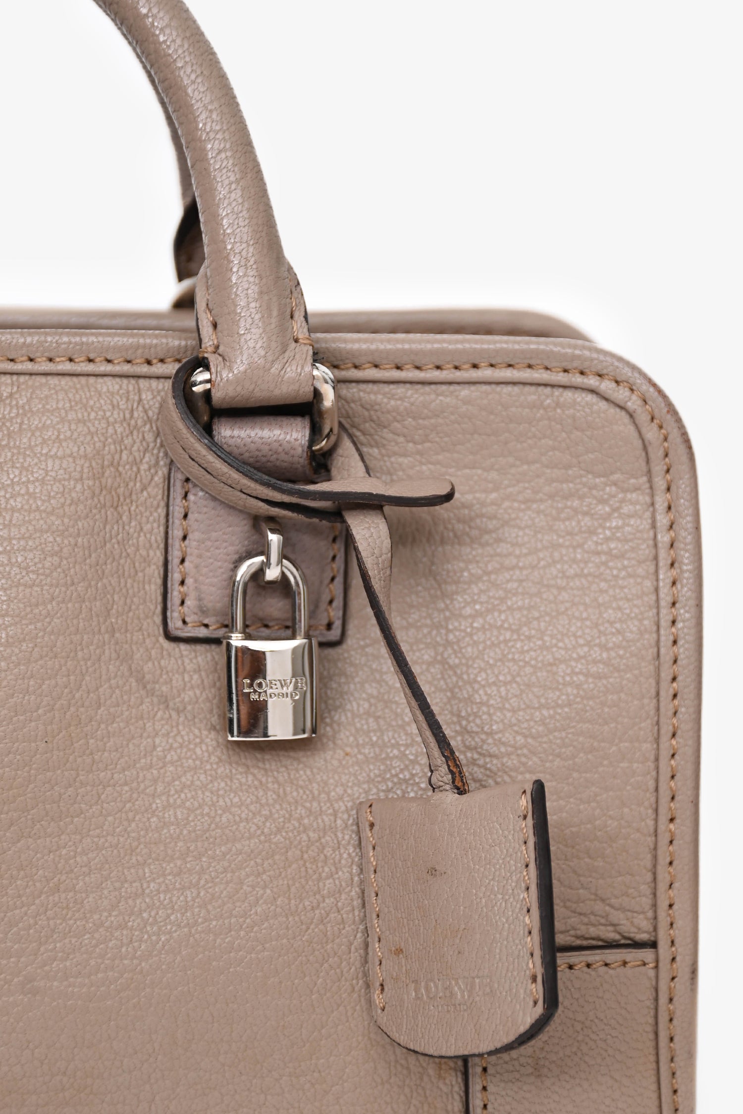 Loewe 2013 Taupe Leather Amazona 23 Bag with Strap. Top zipper closure. Leather interior with zipper pocket closure, and two slip pockets. Leather charm detailing. Silver-tone hardware. Lock charm detail. Adjustable shoulder strap. Four bottom studs. Tonal stitching.