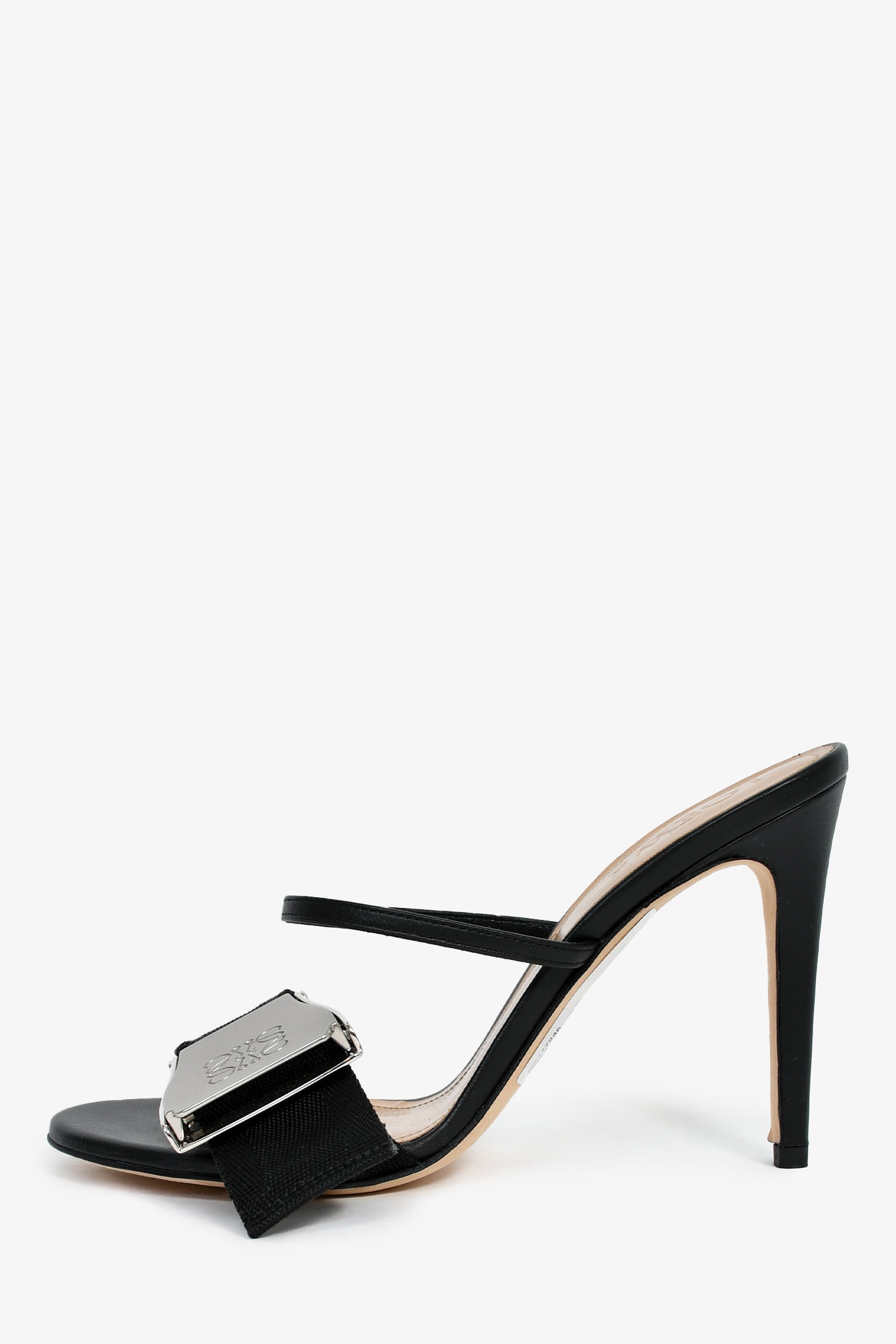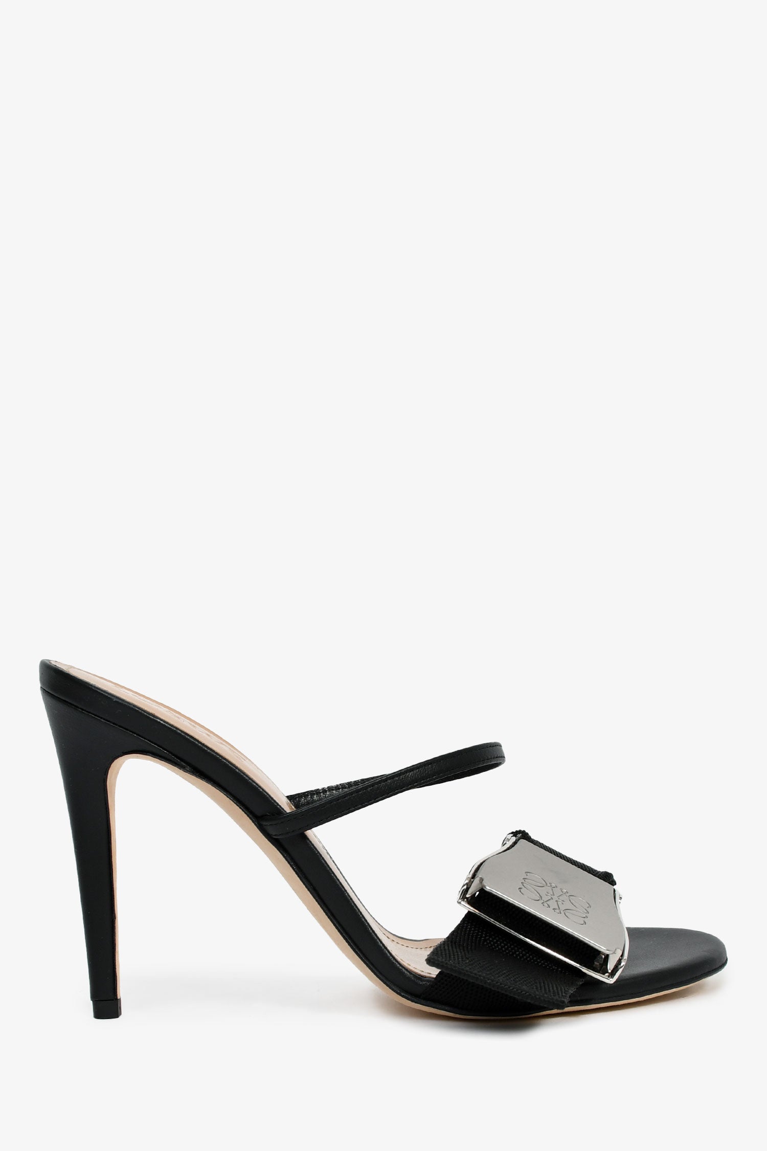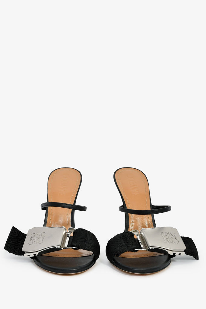 Loewe Black Leather Buckle Anagram Detail Heeled 'Safety Belt 100' Sandals. Slip-on. Open toe. Silver-tone hardware. Tonal stitching.