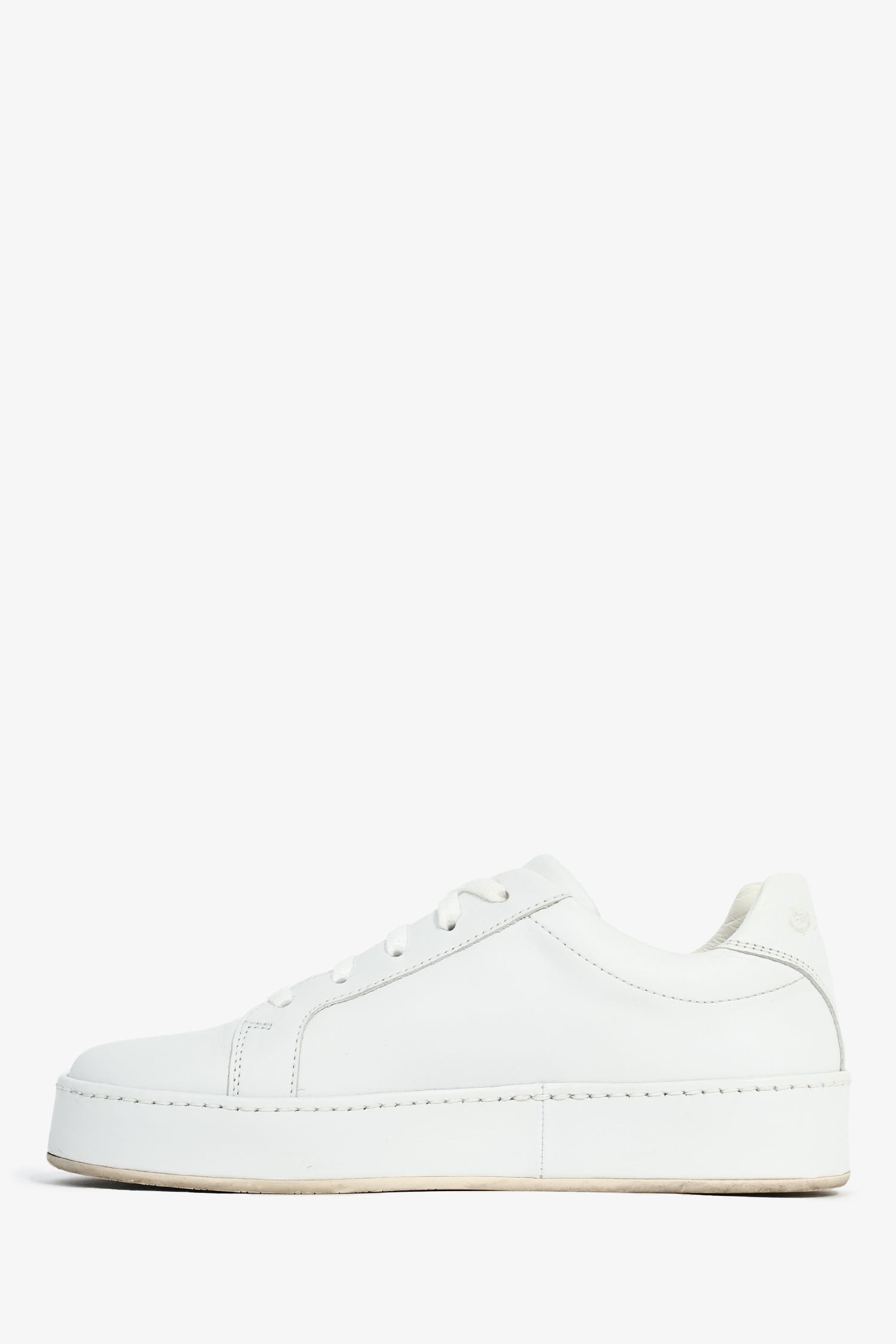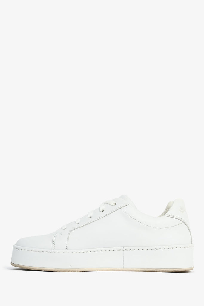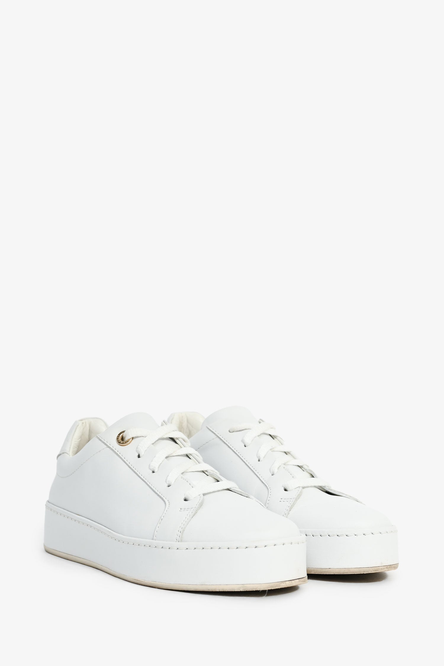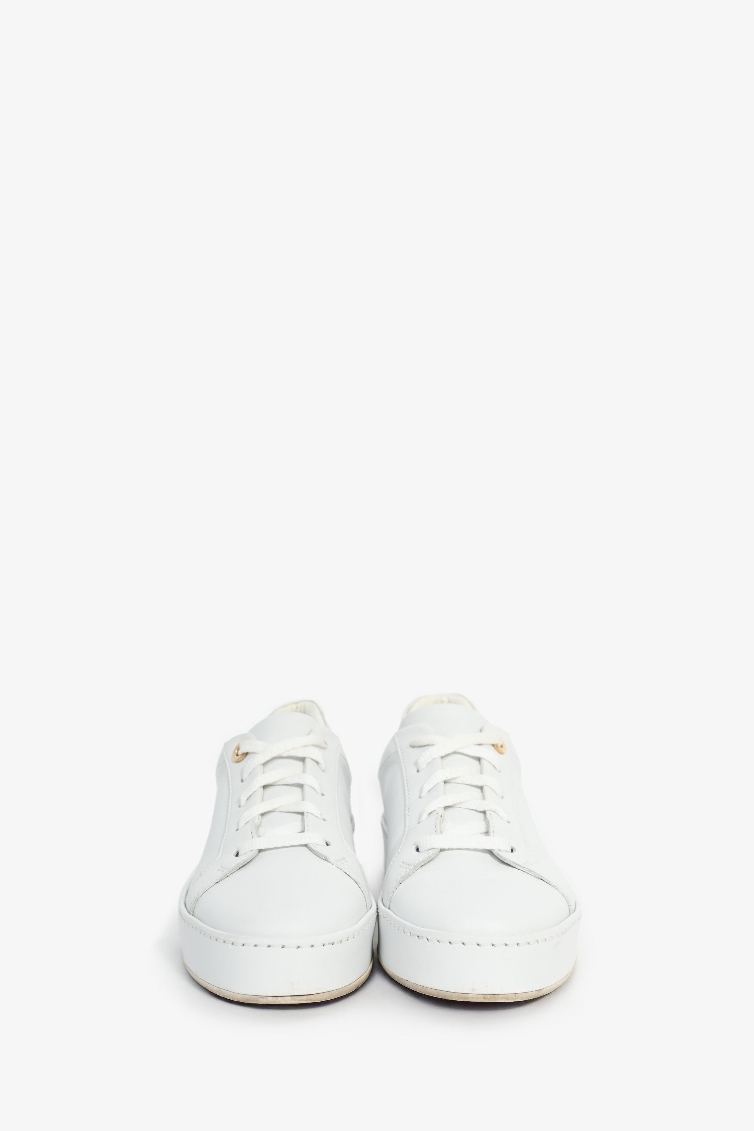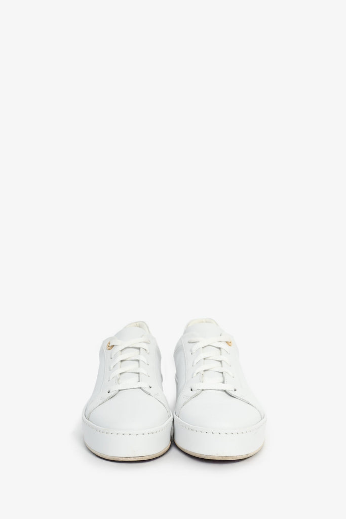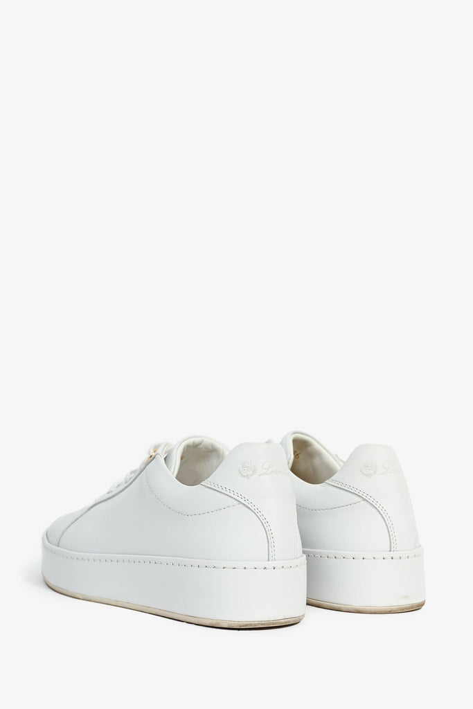 Loro Piana White Leather Sneakers. Almond toe. Front lace-up closure. Gold-tone hardware. Tonal stitching