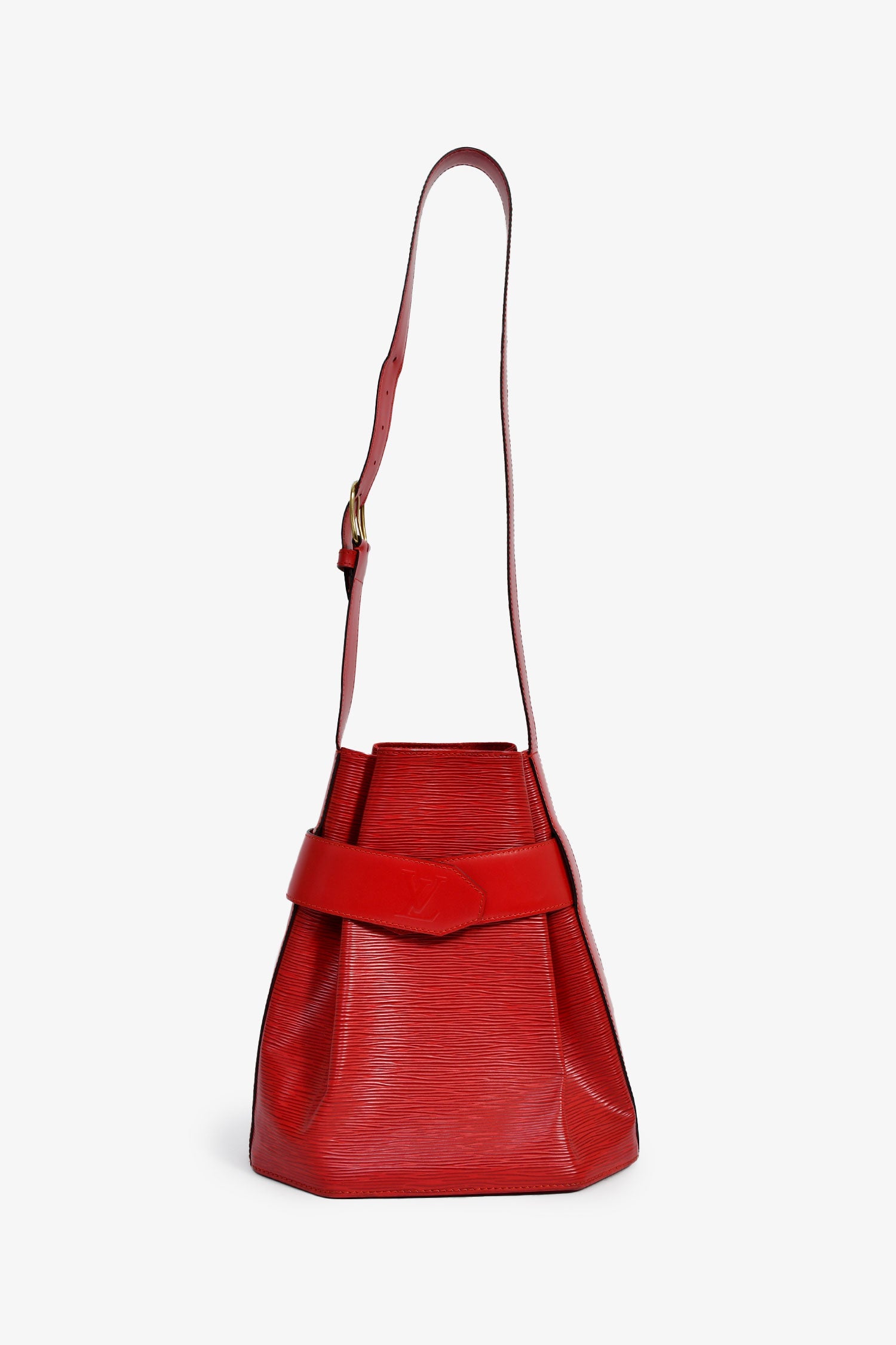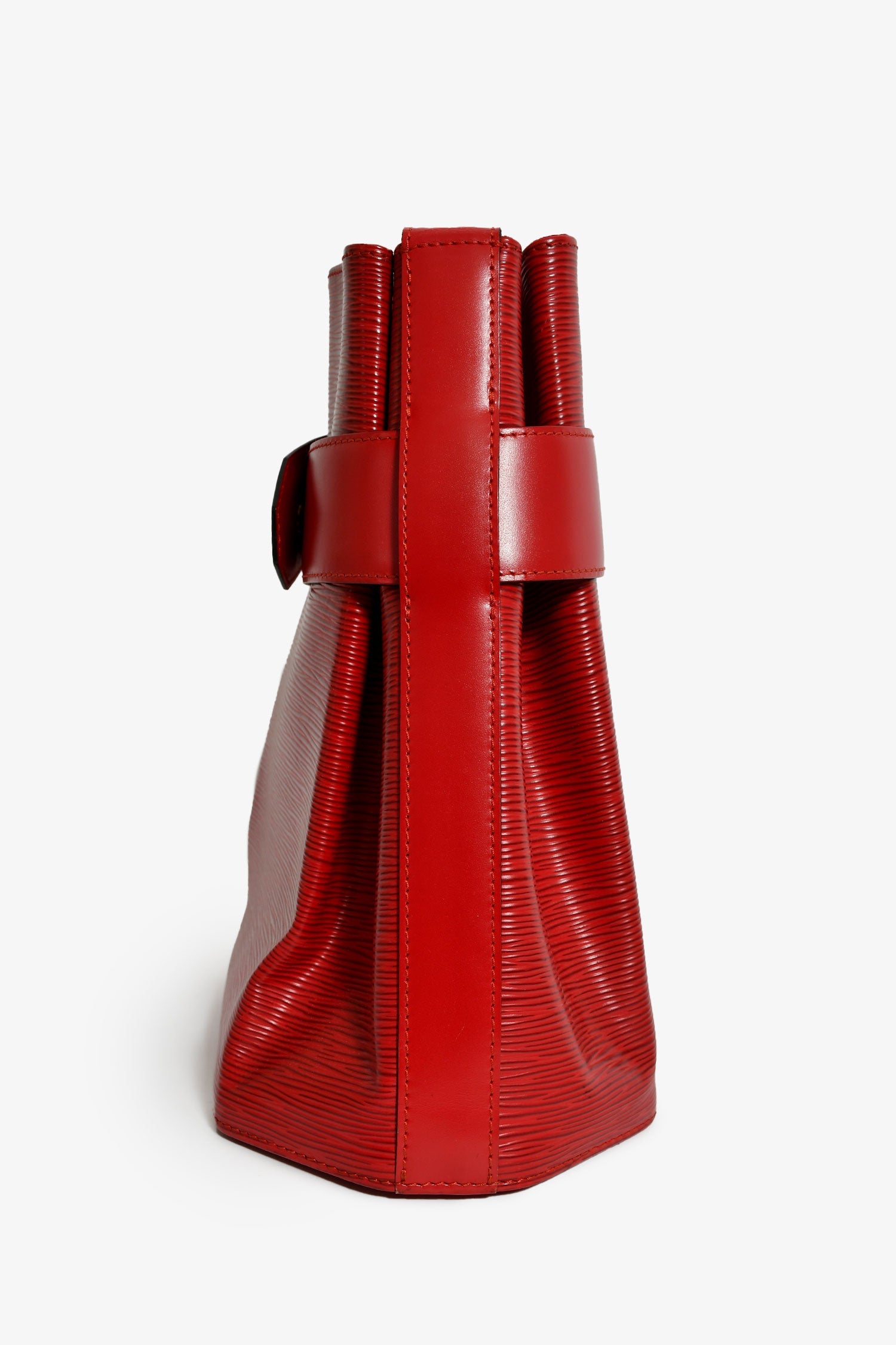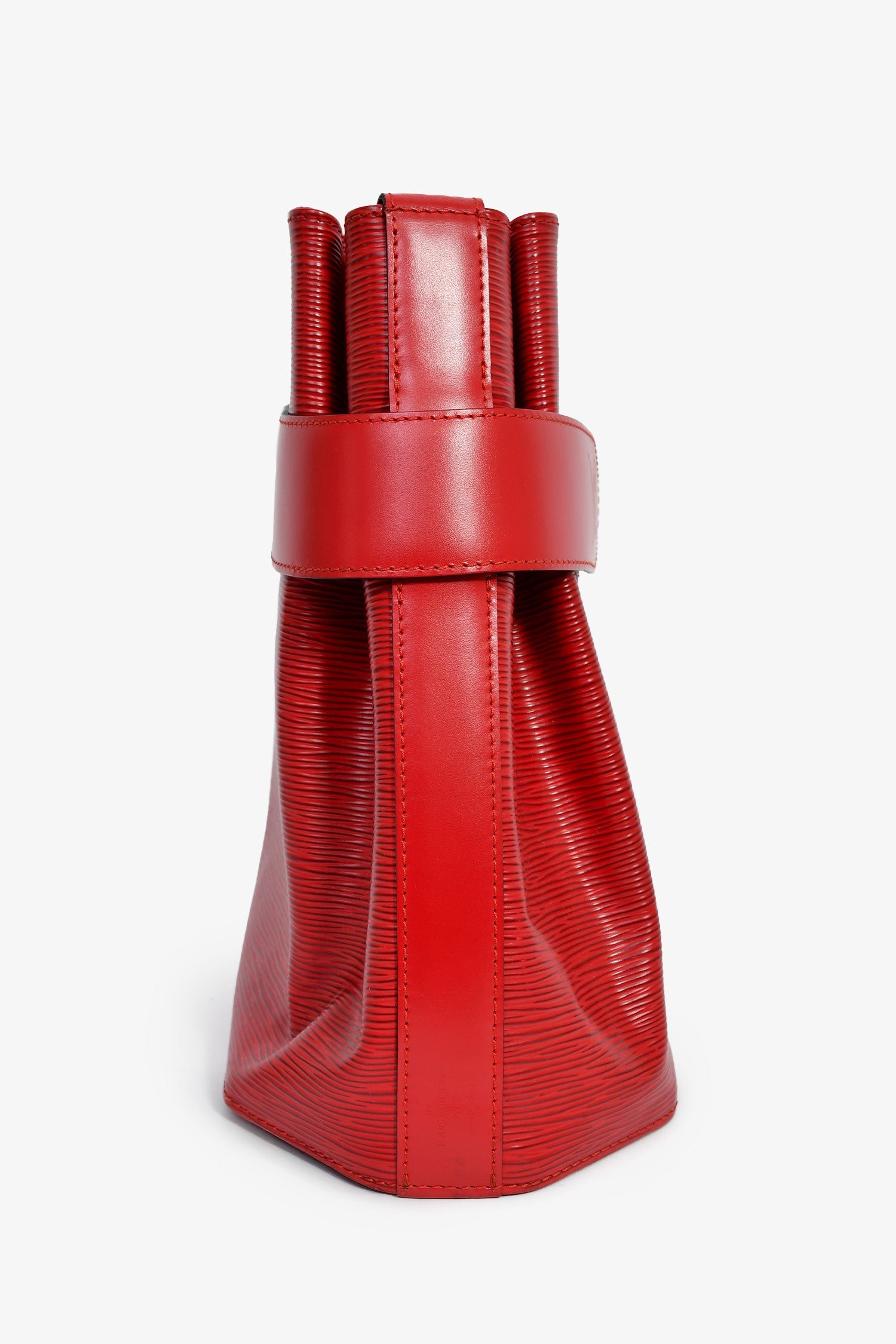 Louis Vuitton 1996 Red Epi Leather 'Sac d'Epaule' Shoulder Bag. Wrap around strap with a snap closure. Adjustable shoulder strap. Suede-lined interior. Gold-tone hardware. Tonal stitching.