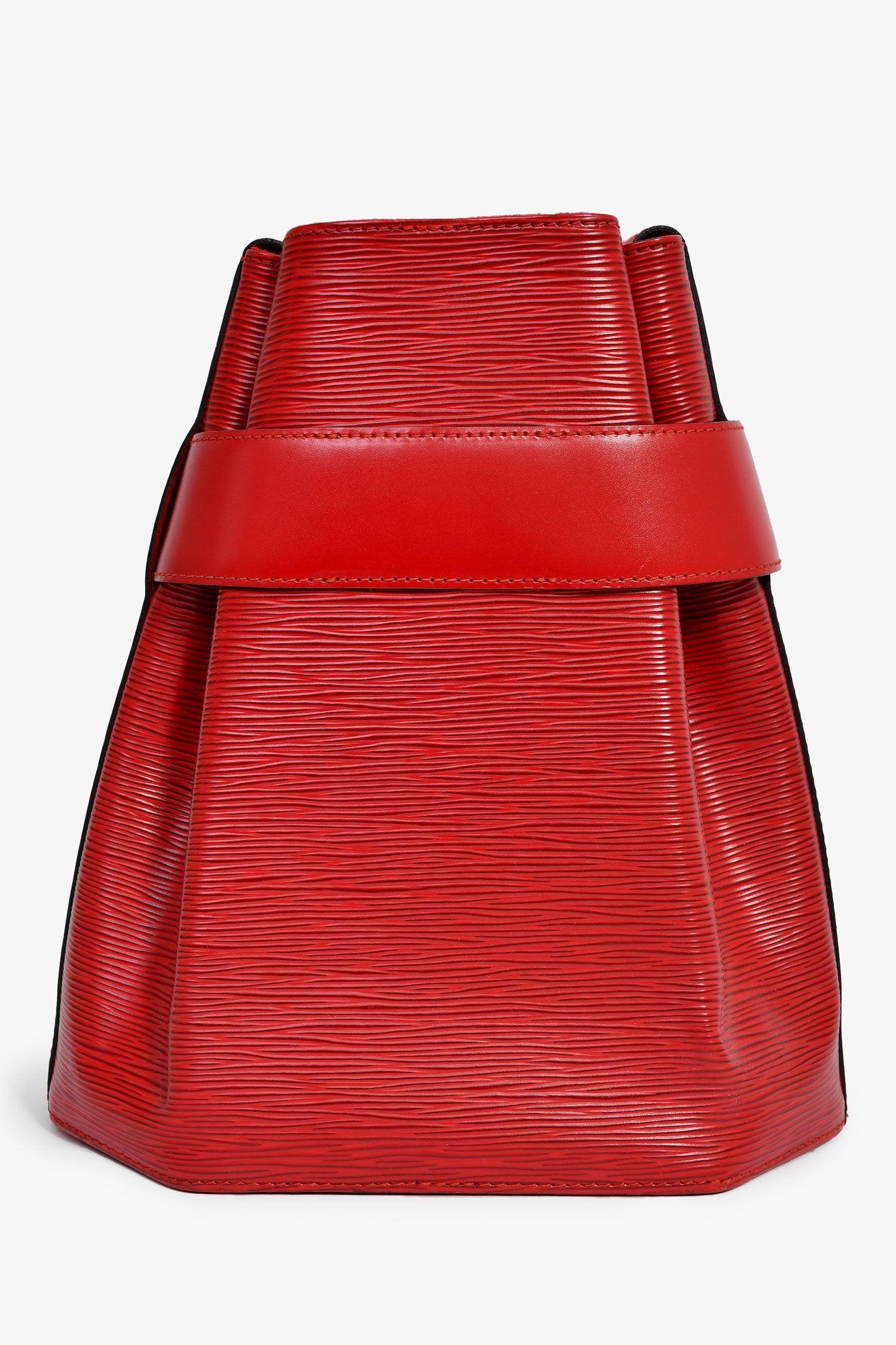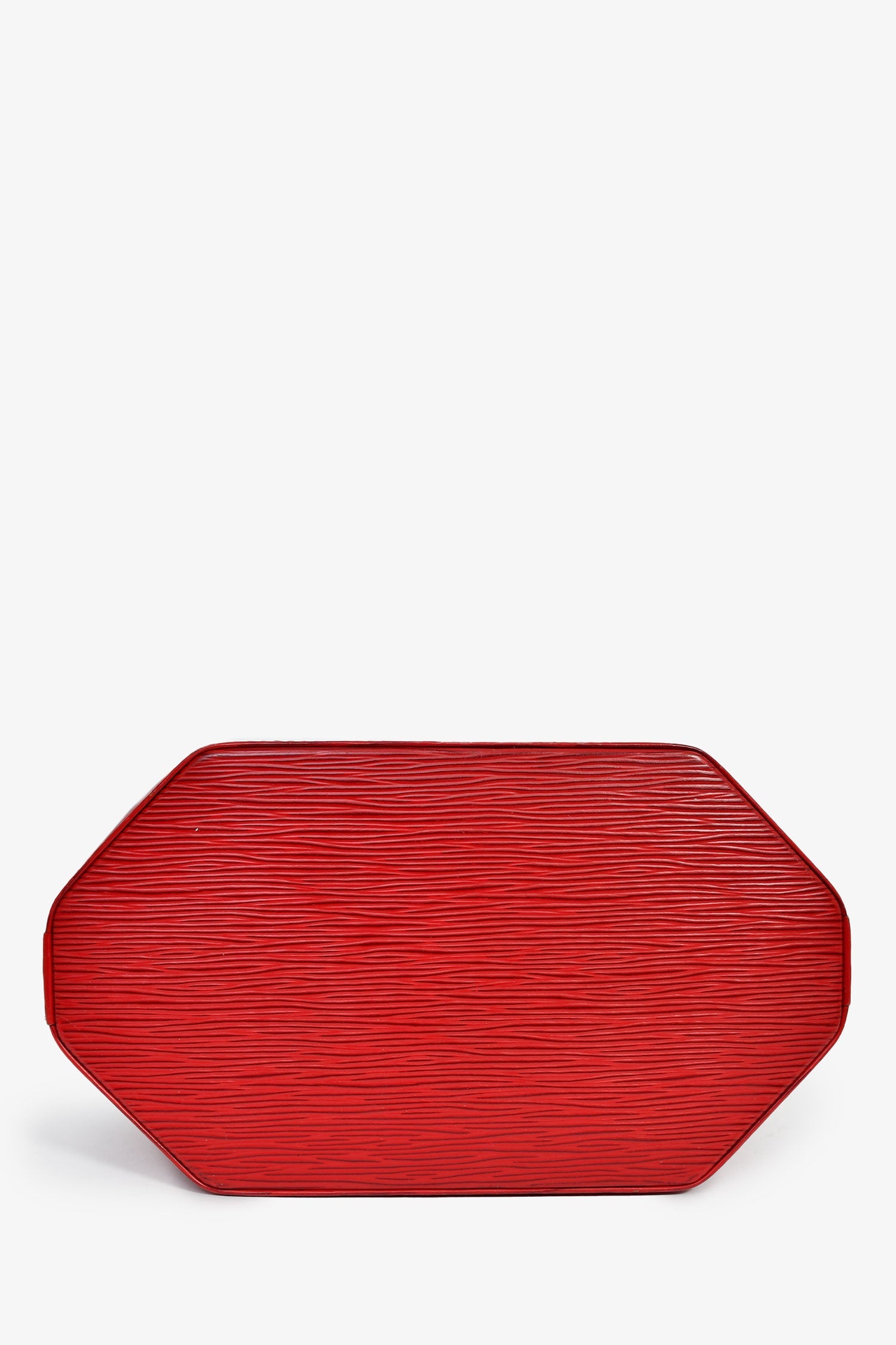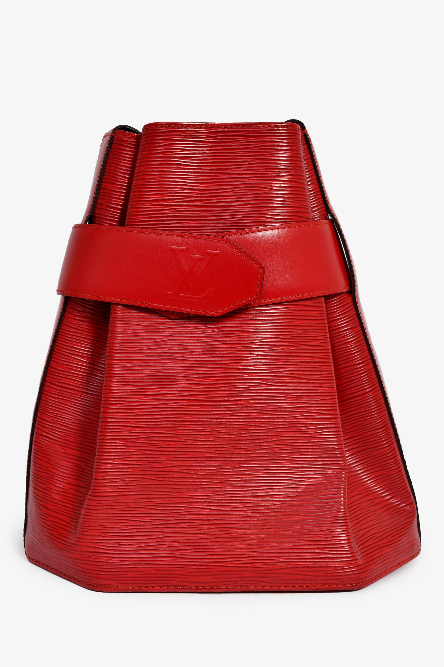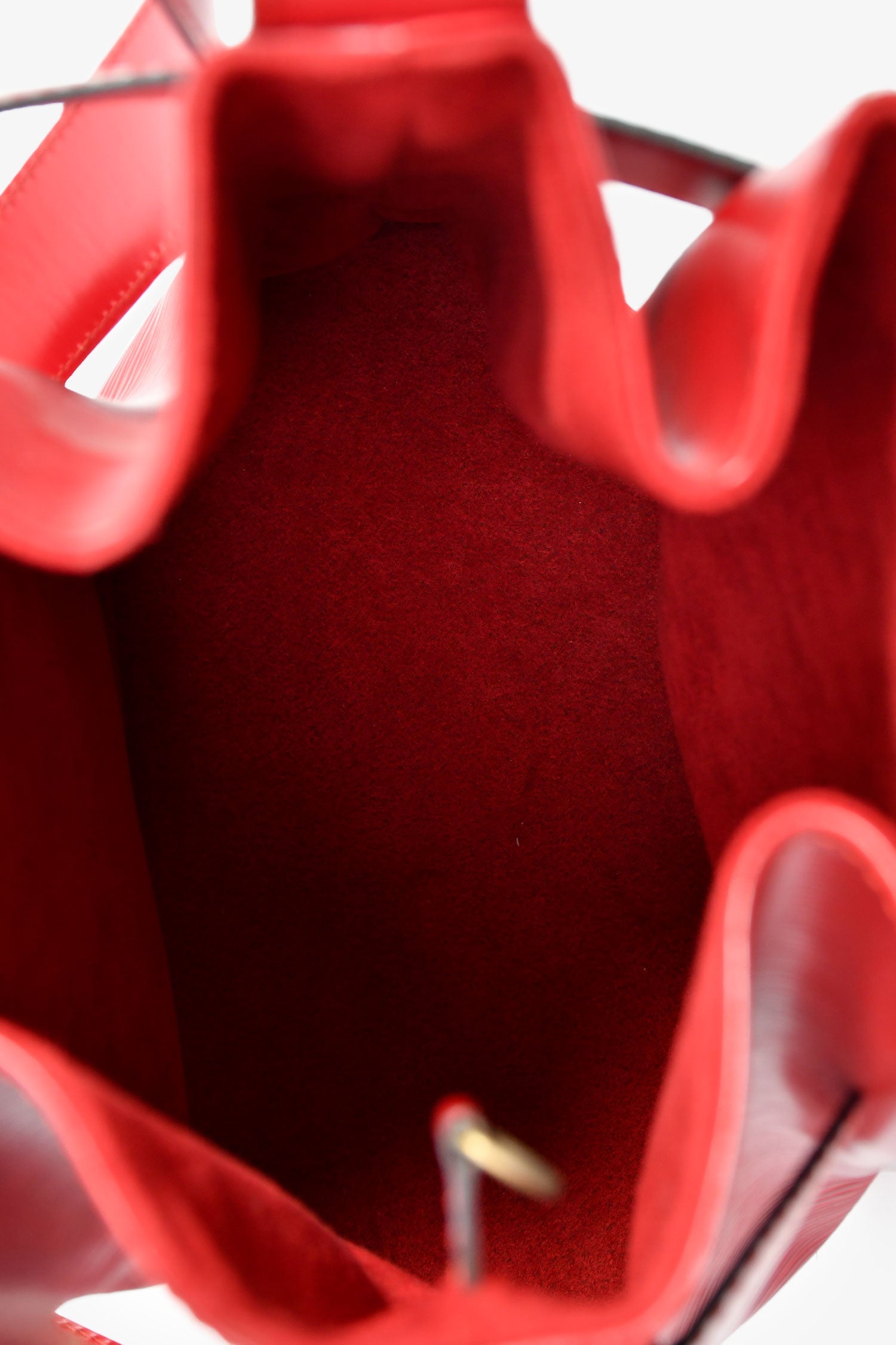 Louis Vuitton 1996 Red Epi Leather 'Sac d'Epaule' Shoulder Bag. Wrap around strap with a snap closure. Adjustable shoulder strap. Suede-lined interior. Gold-tone hardware. Tonal stitching.