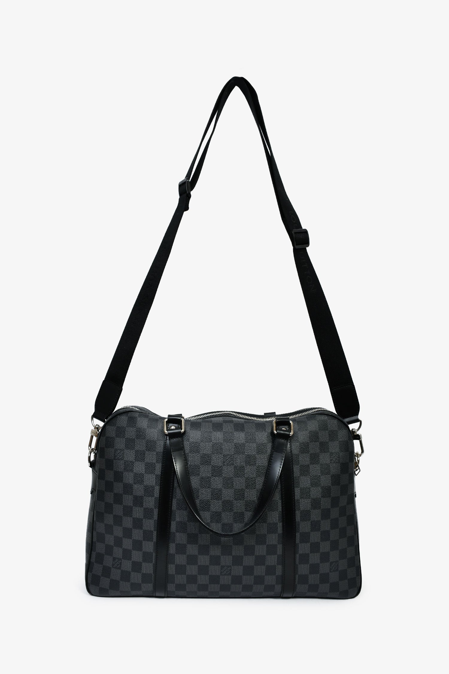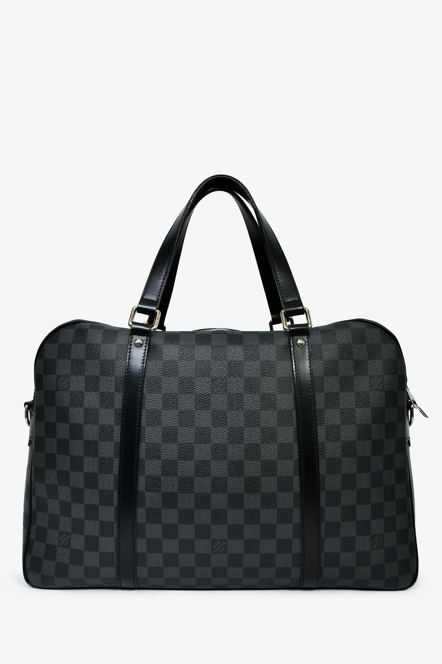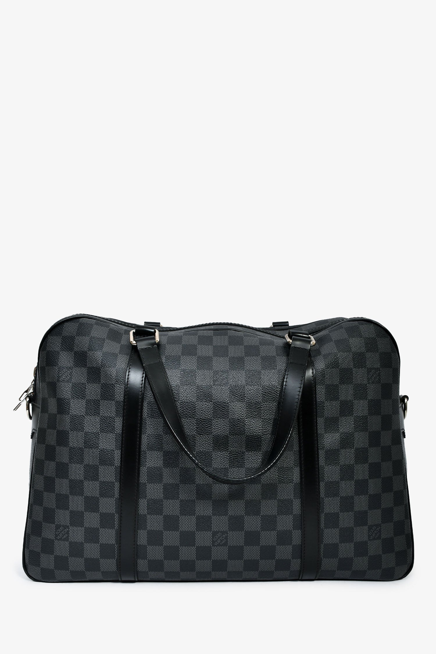 Louis Vuitton 2009 Graphite Damier 'Jorn' Briefcase Top Handle With Strap. Top two-way zip closure. Dual handles. Detachable and adjustable strap. Textile-lined interior. 2 interior wall pockets; 1 slip, 1 with zip closure. Silver-tone hardware. Tonal stitching.