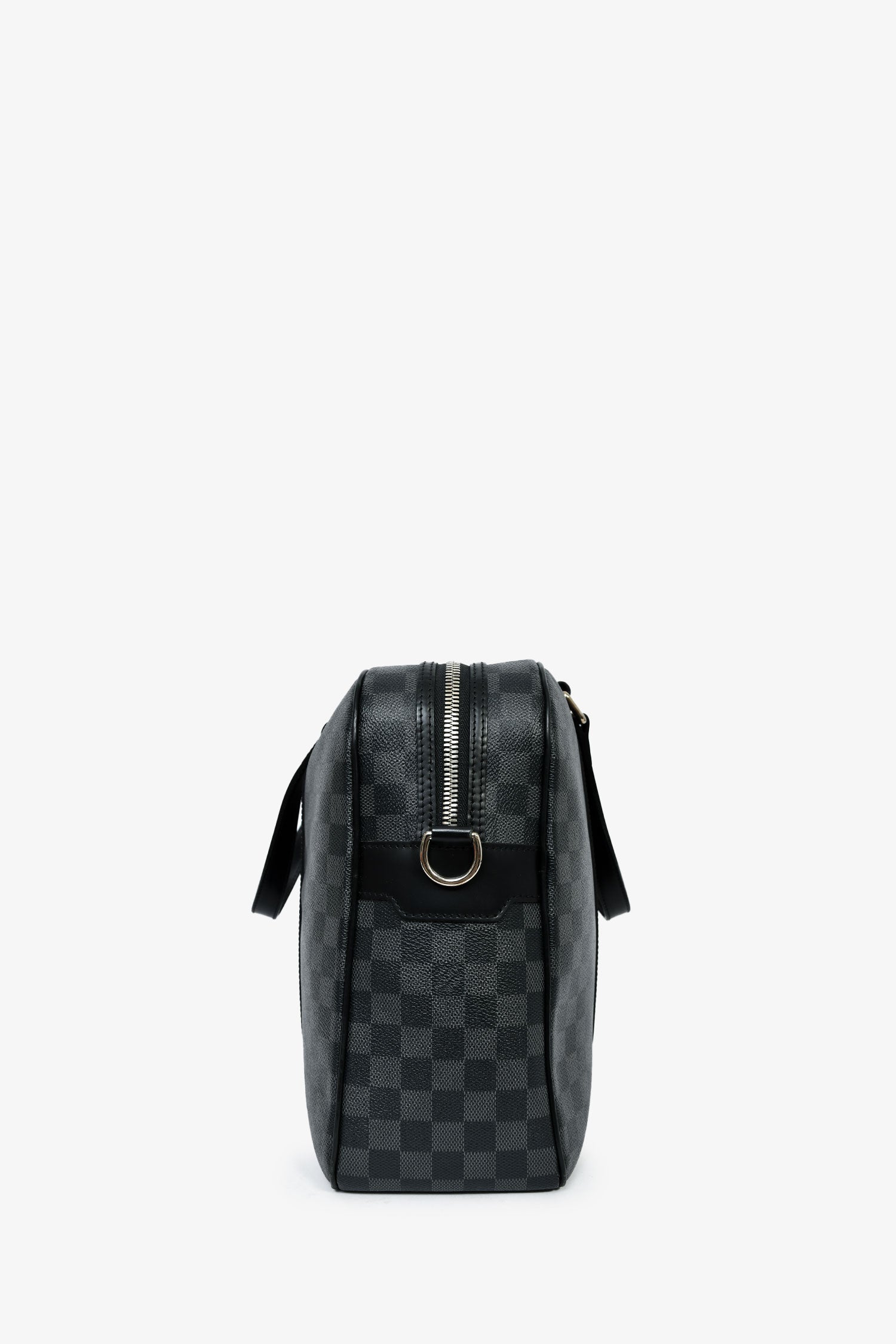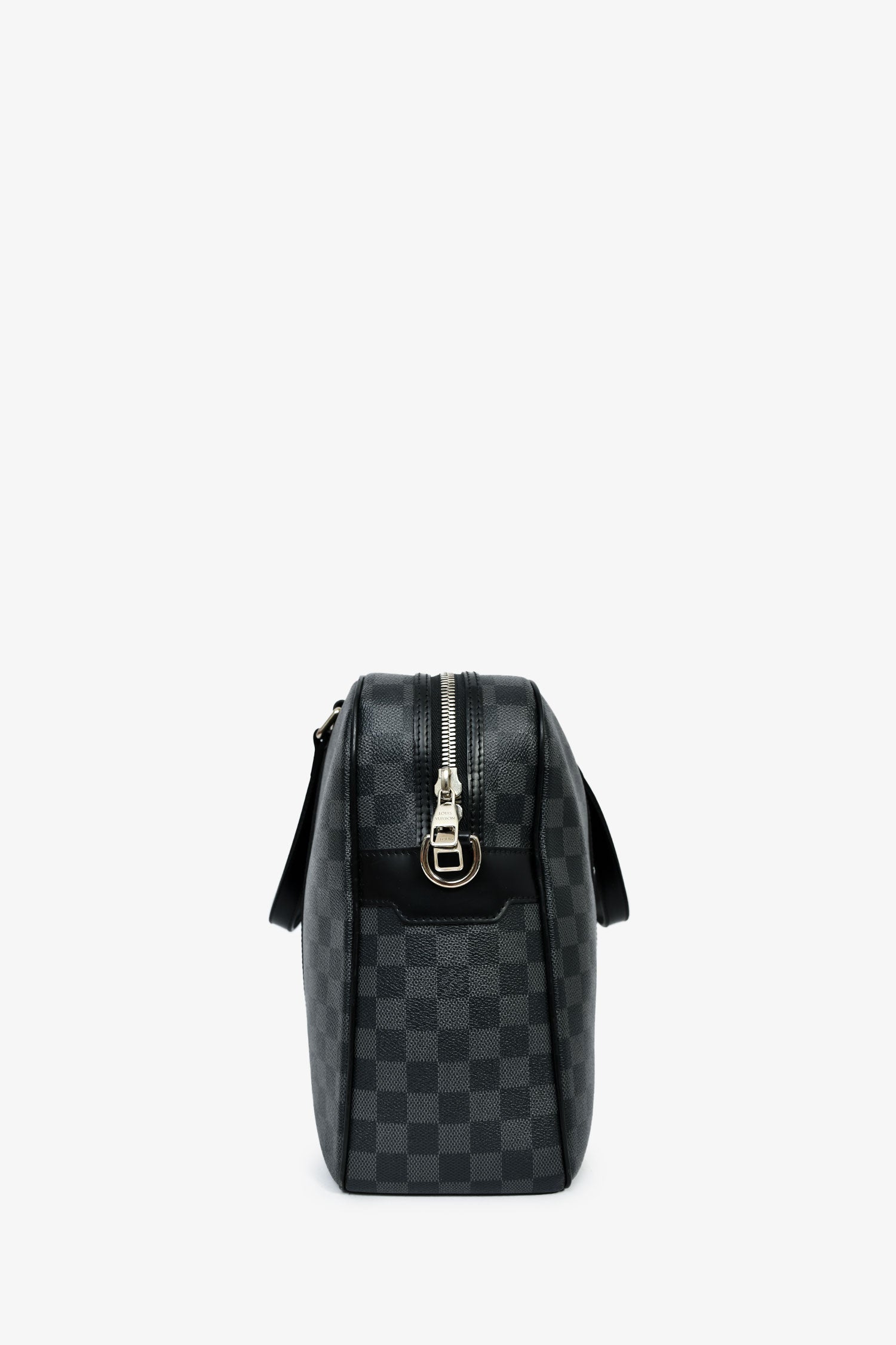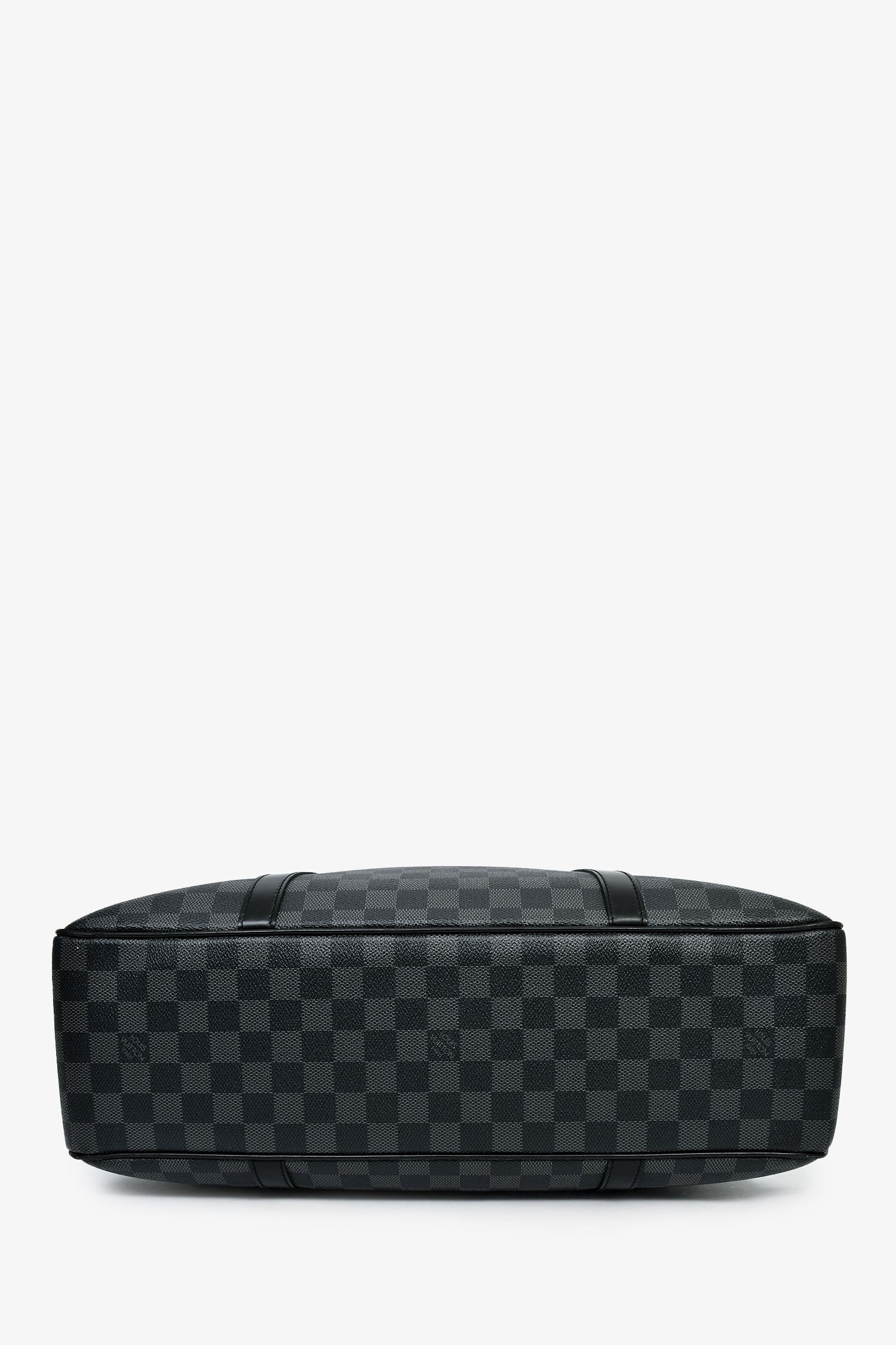 Louis Vuitton 2009 Graphite Damier 'Jorn' Briefcase Top Handle With Strap. Top two-way zip closure. Dual handles. Detachable and adjustable strap. Textile-lined interior. 2 interior wall pockets; 1 slip, 1 with zip closure. Silver-tone hardware. Tonal stitching.