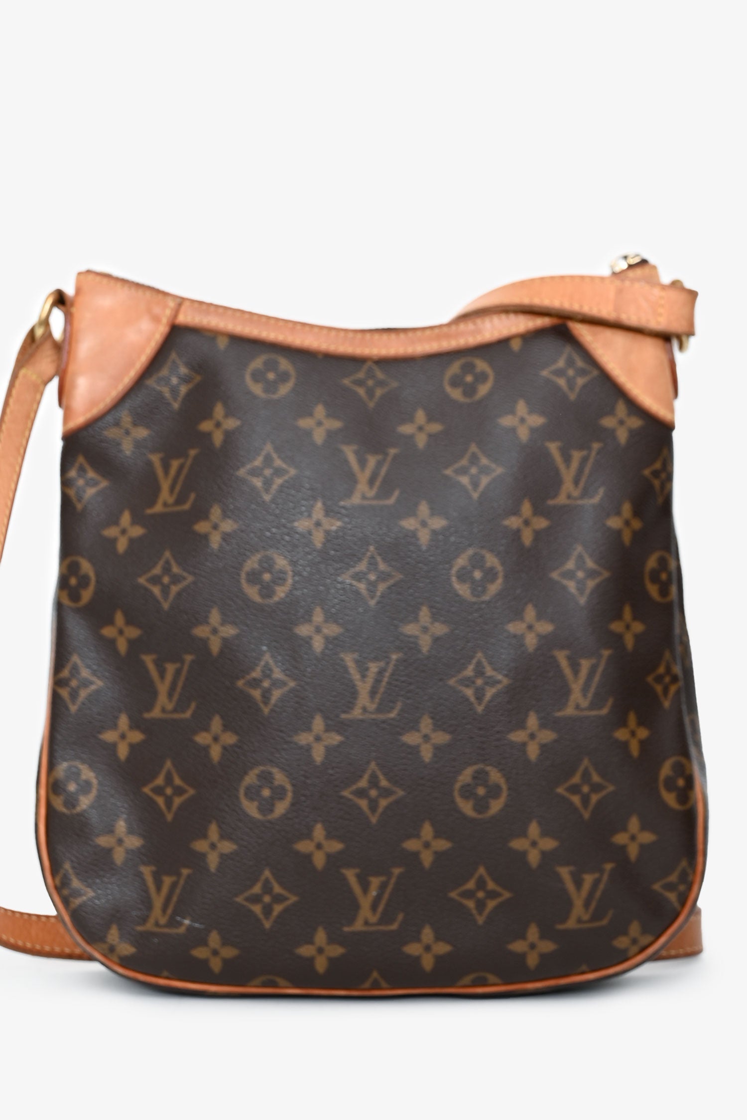 Louis Vuitton 2010 Brown Monogram Canvas/Leather Odeon Crossbody Bag. Top zip closure. Adjustable leather crossbody strap. 1 exterior slip pocket; 2 interior slip pockets. Gold-tone hardware. Contrast stitching.