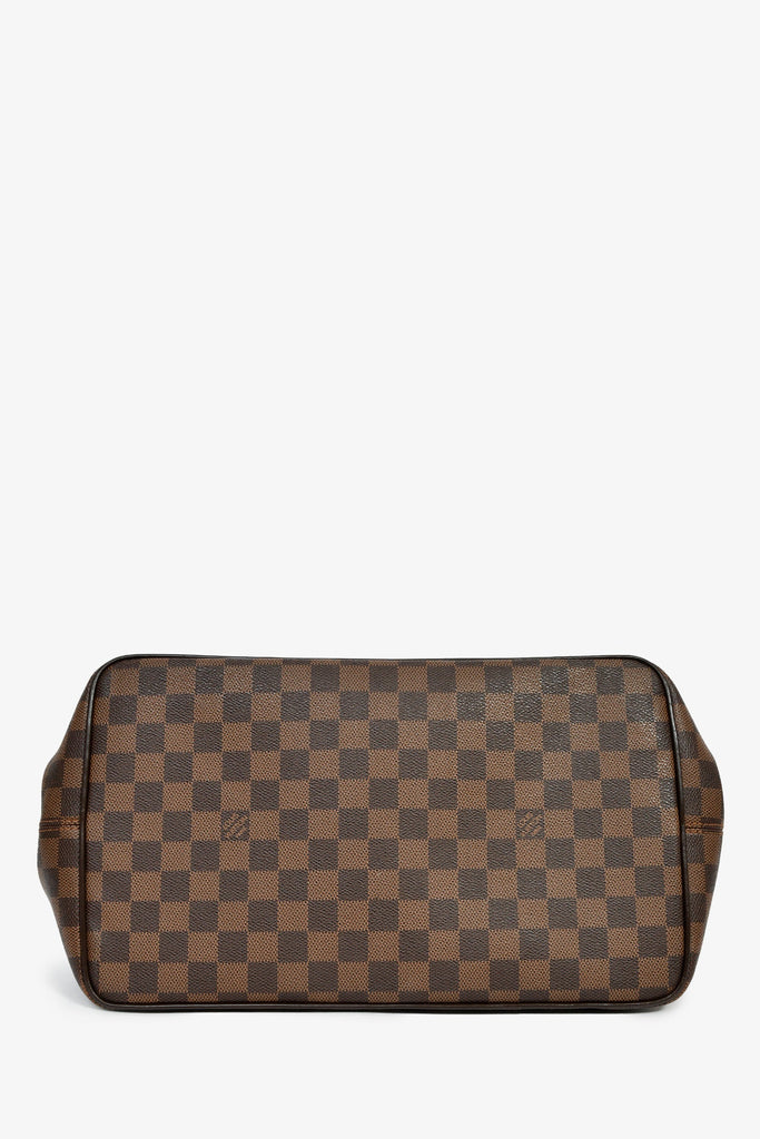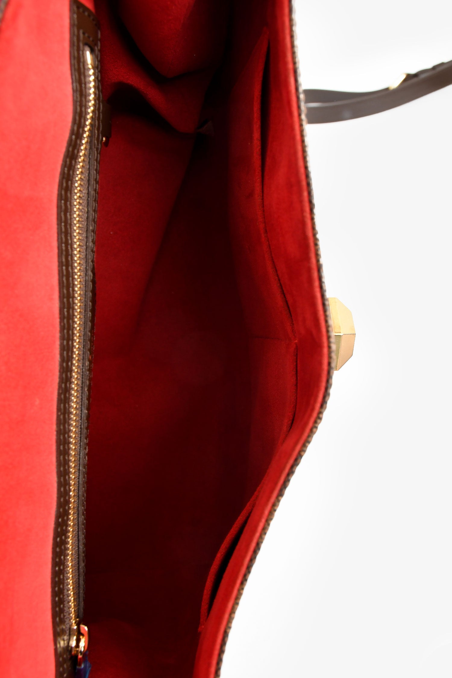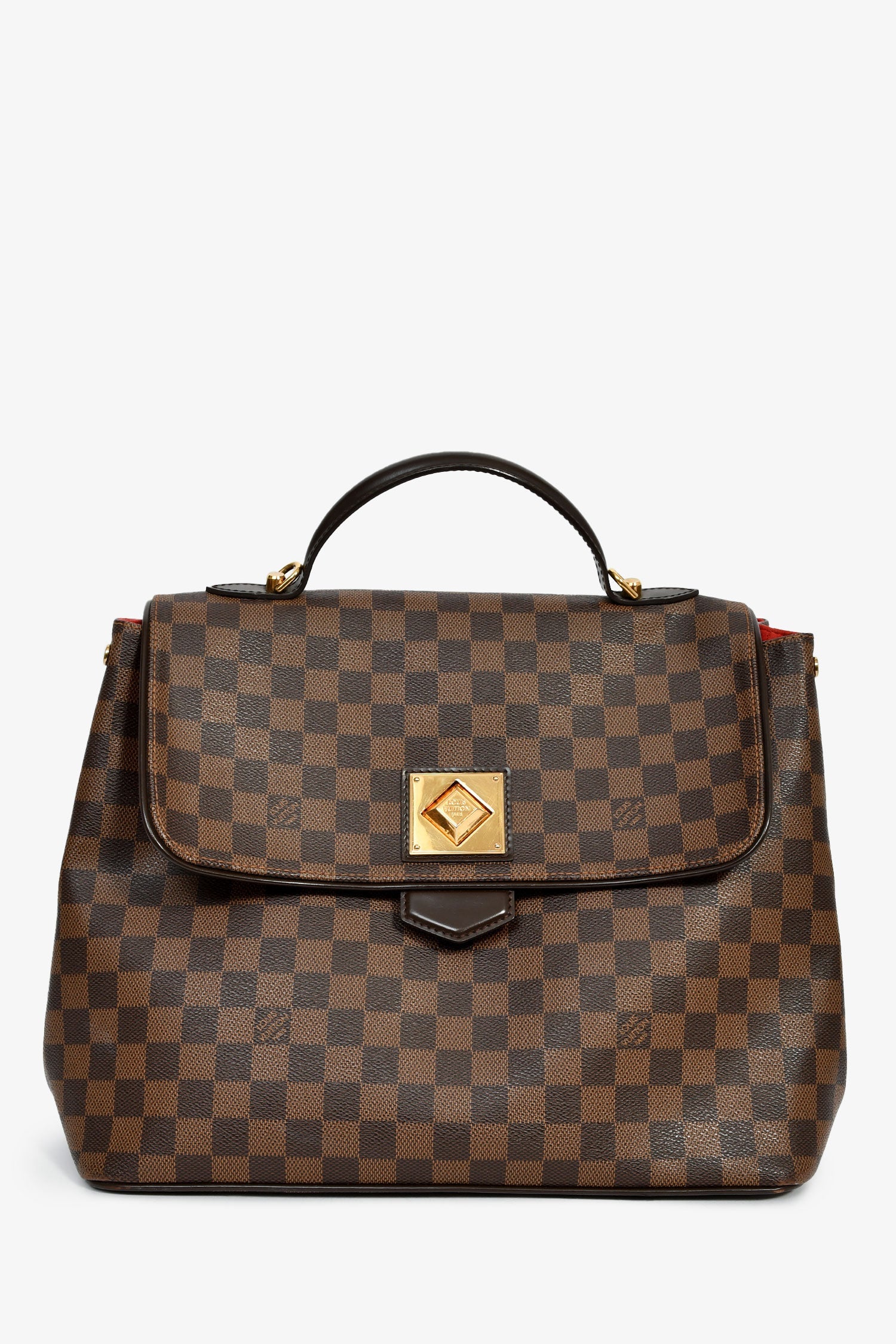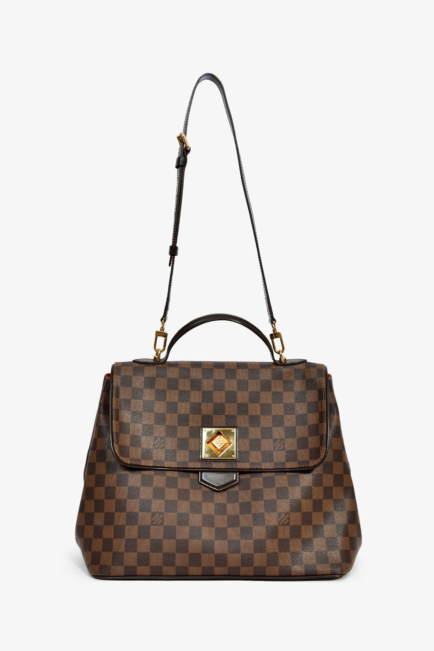 Louis Vuitton 2011 Brown Canvas Damier Ebene GM Bergamo Tote. Front fold-over flap with turn-lock closure. Top handle. Detachable and adjustable strap. Suede-lined interior. 3 interior wall pockets; 2 slip, 1 with zip closure. Gold-tone hardware. Tonal stitching.