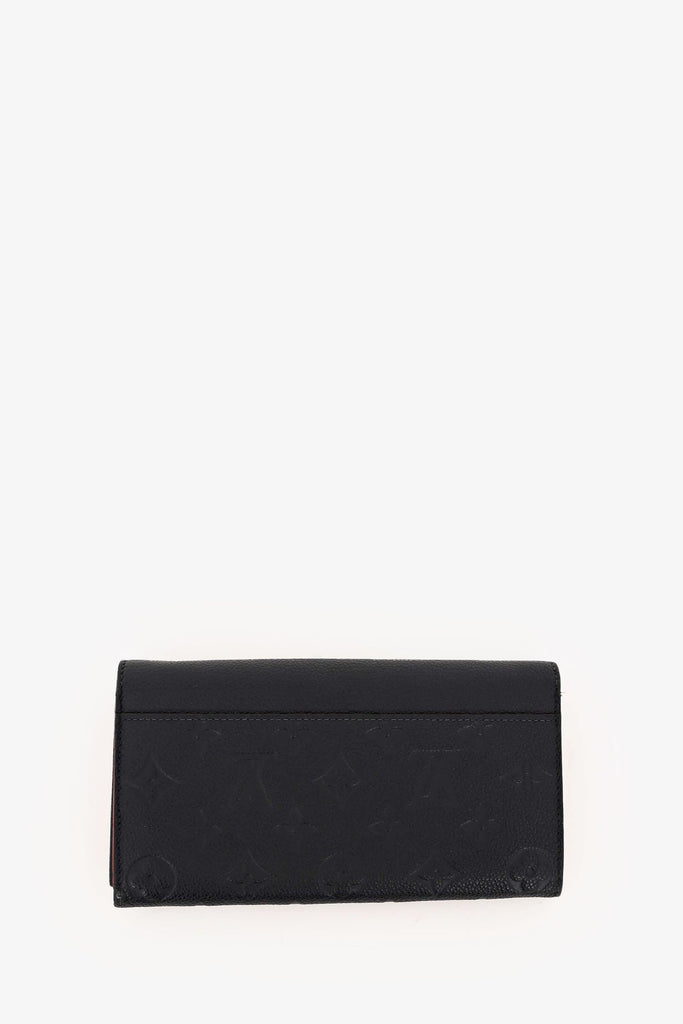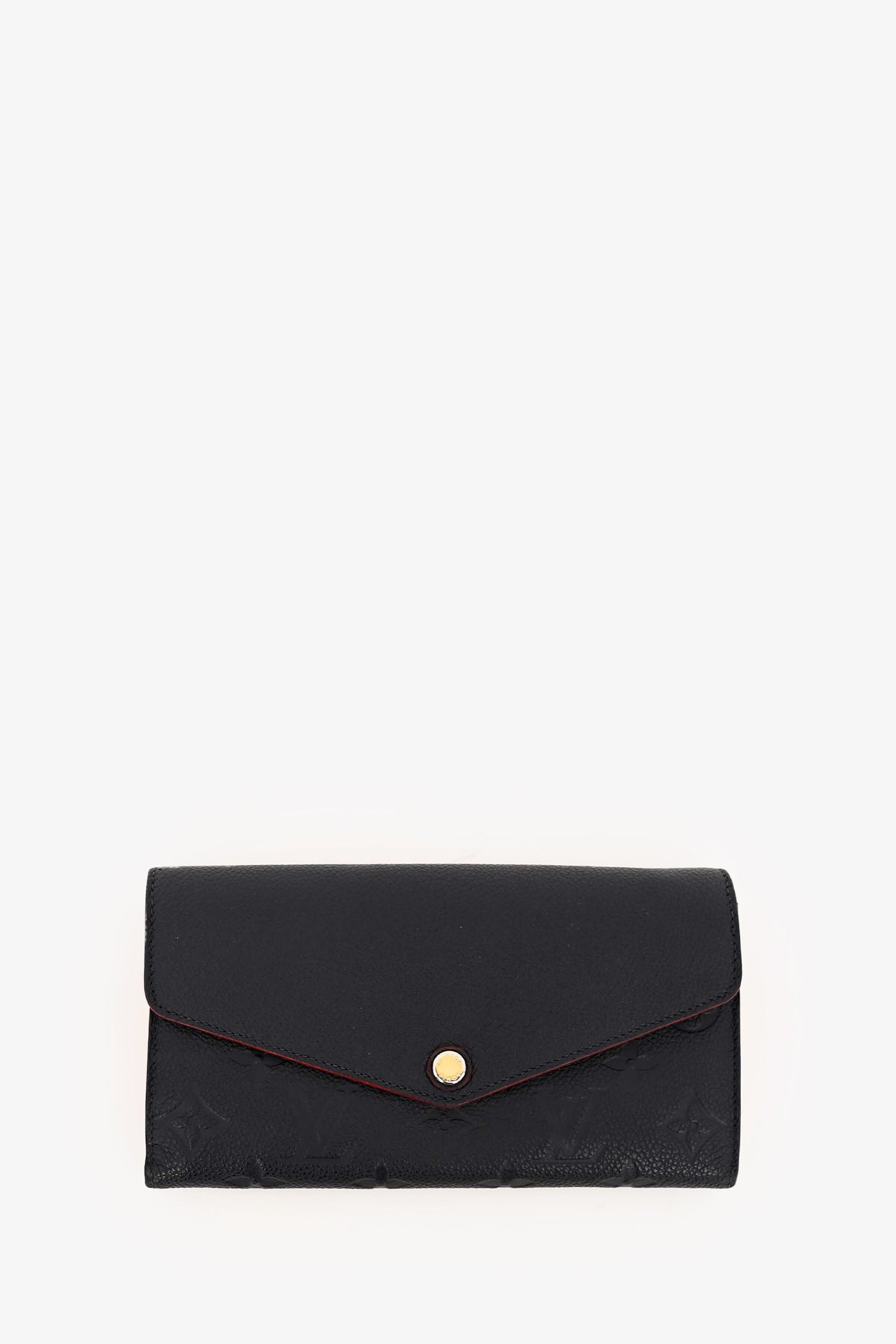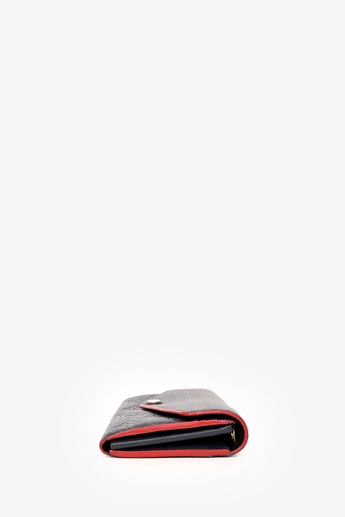 Louis Vuitton 2016 Navy Monogram Empreinte Leather Sarah Wallet. Front fold-over flap with snap button closure. 16 interior card slots; 2 interior bill compartments; 1 interior zip pocket. Gold-tone hardware. Tonal stitching.