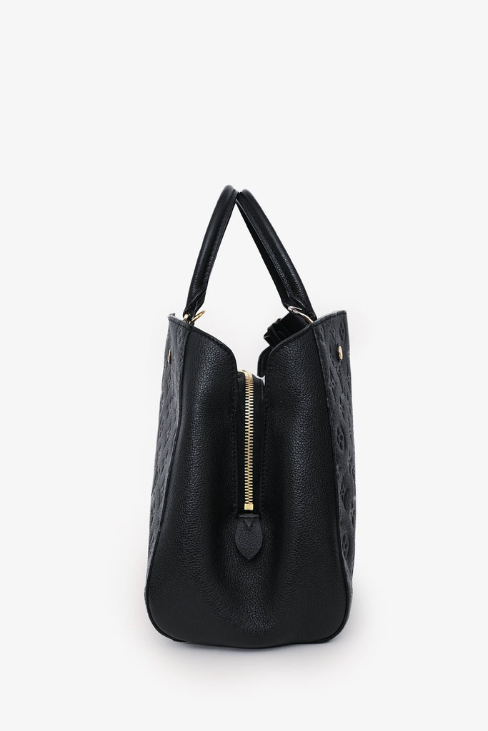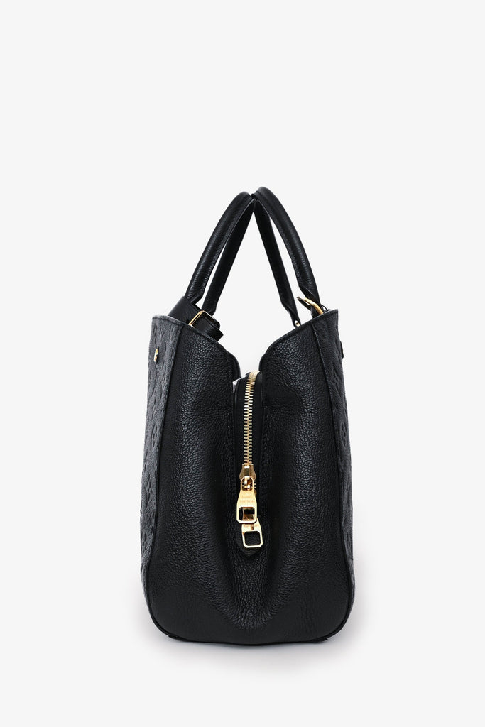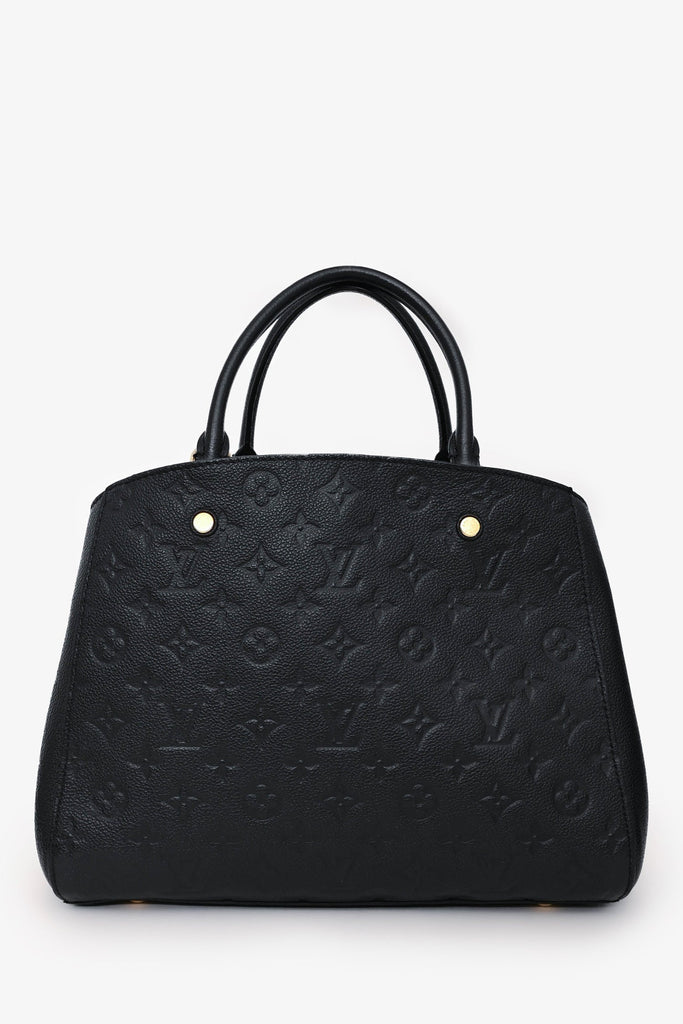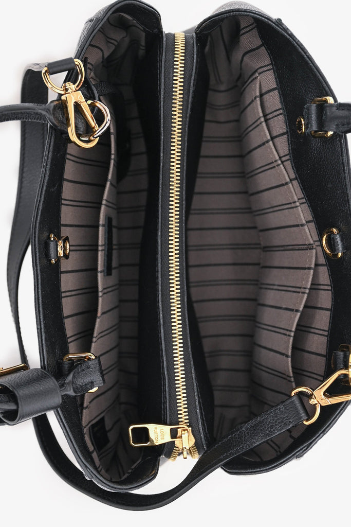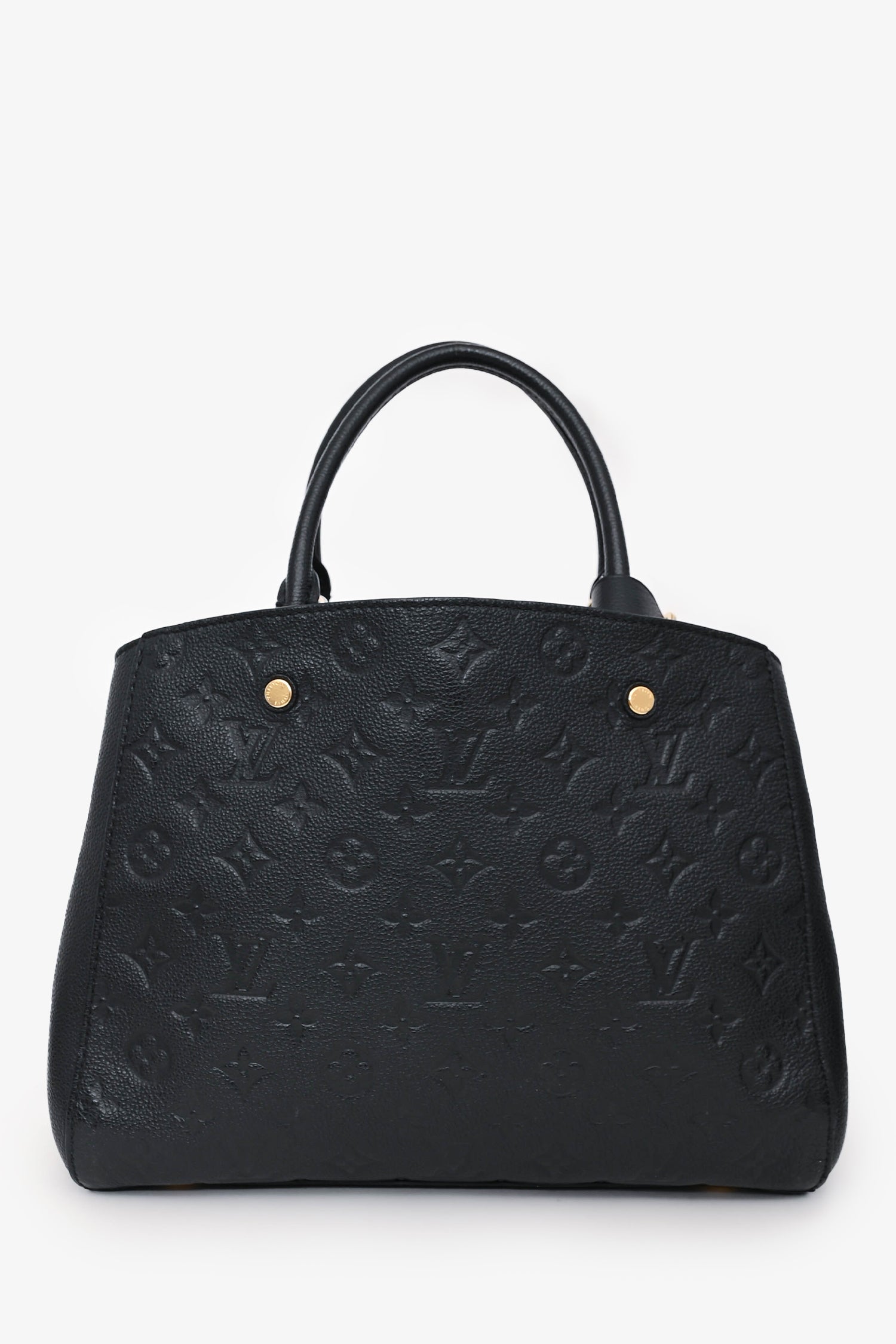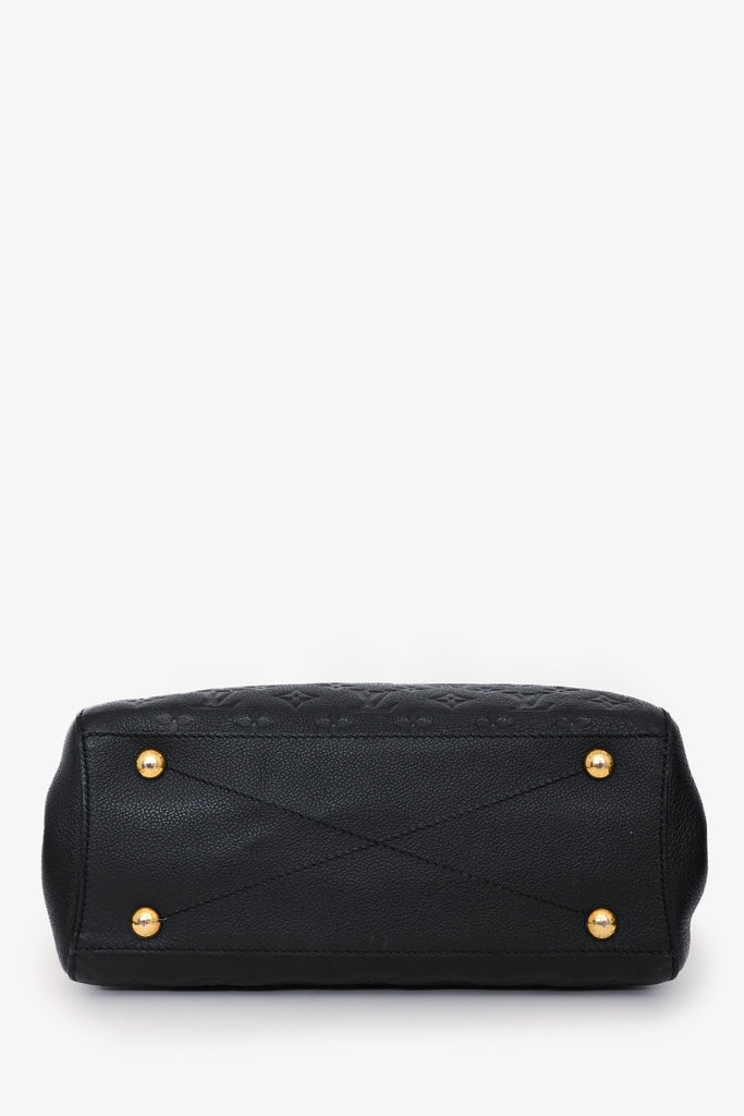 Louis Vuitton 2018 Black Empreinte Montaigne MM with Strap. Dual top handles. Top interior latch closure. Protective base studs. Detachable and adjustable crossbody strap. Detachable clochette. Interior top 2-way zip closure. Textile-lined interior. 3 interior compartments; 2 open, 1 with zip closure. 3 interior wall slip pockets. Gold-tone hardware. Tonal stitching.