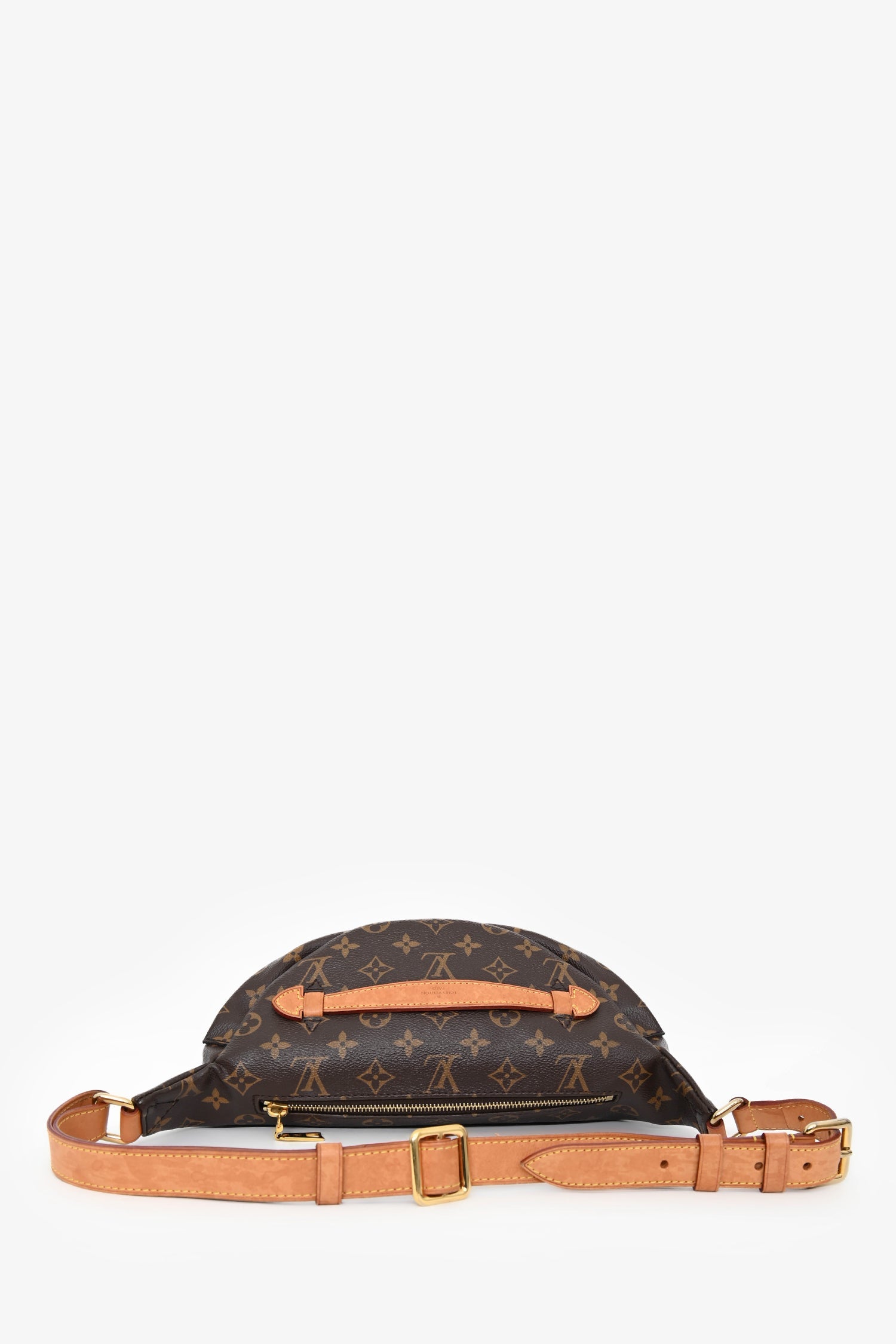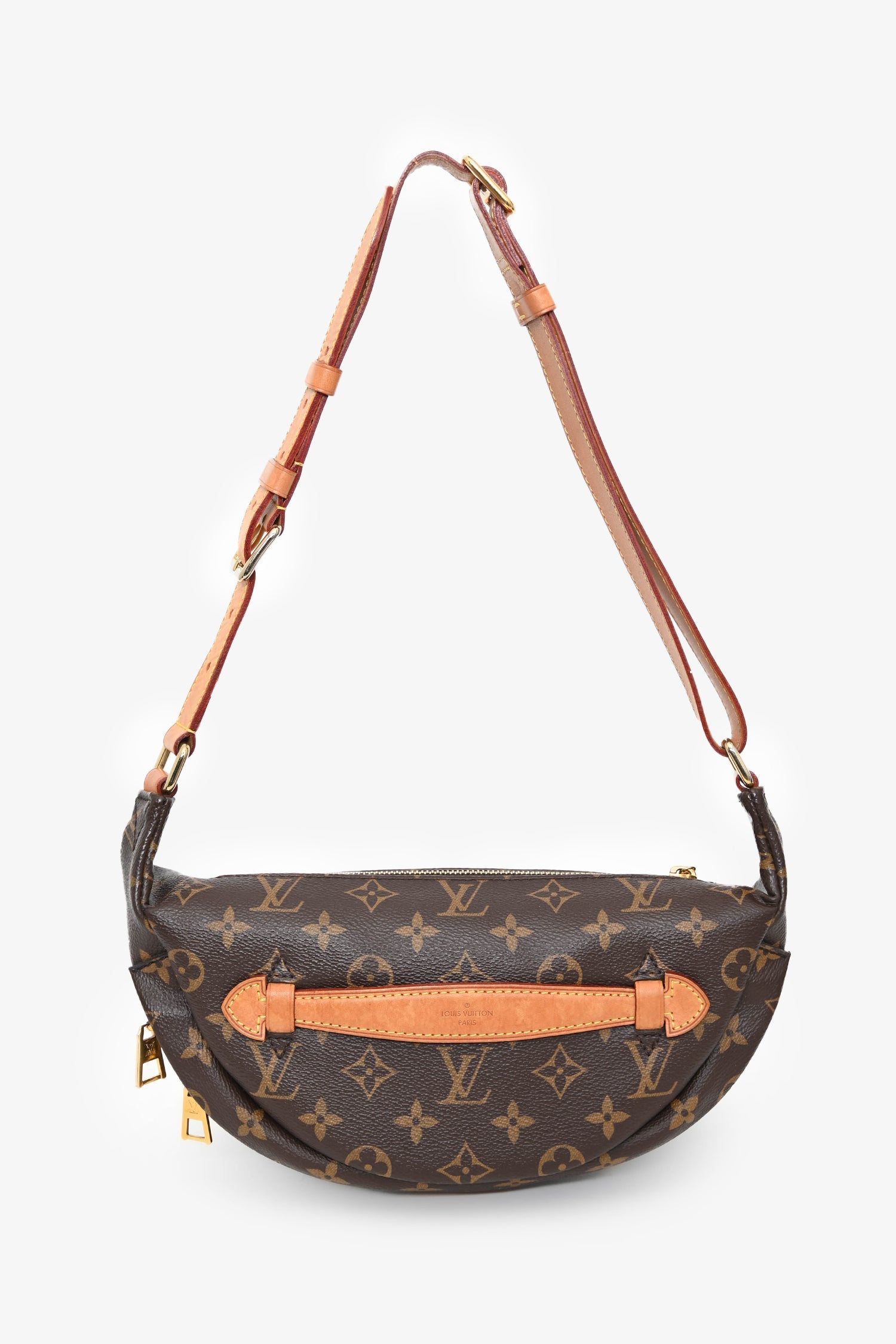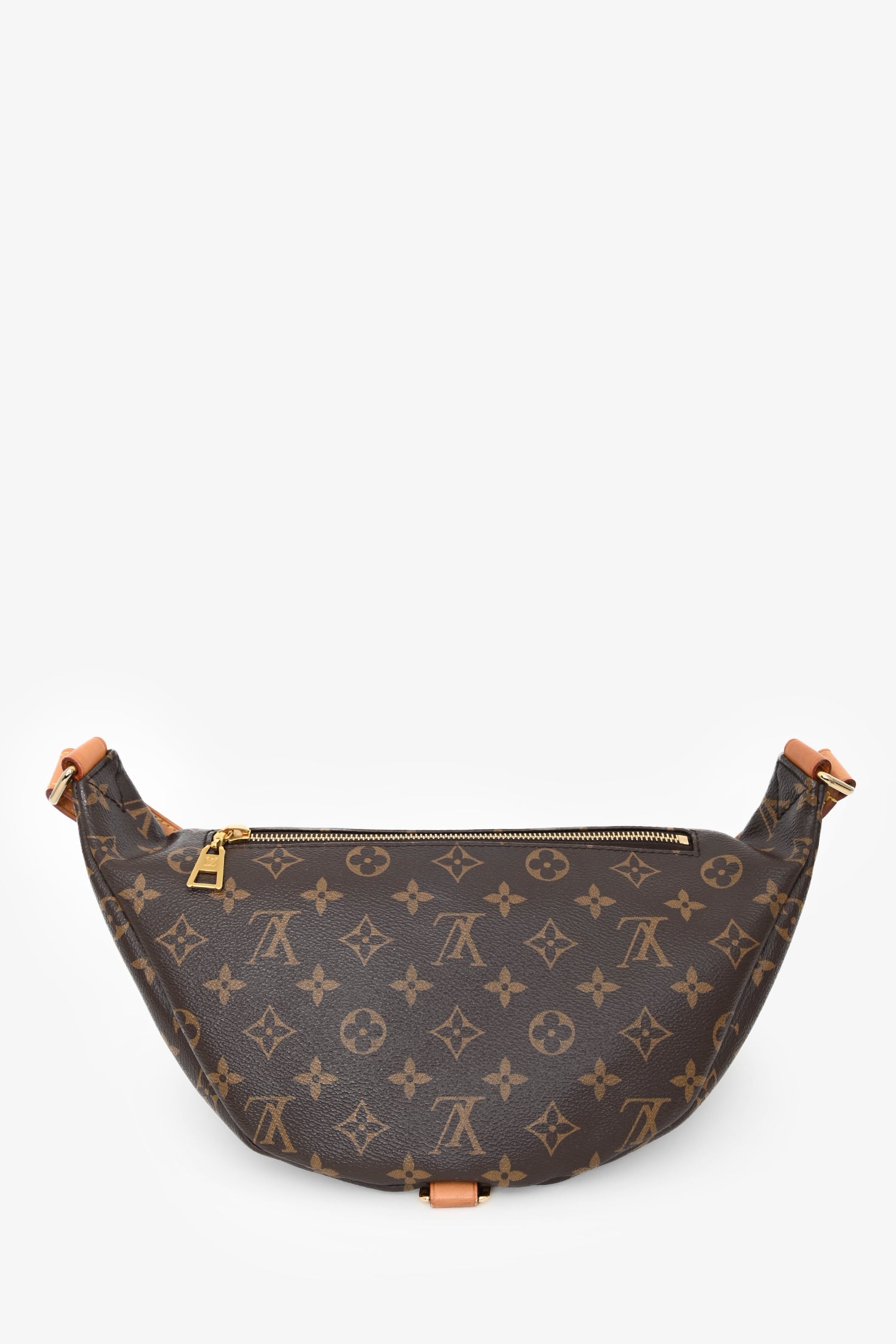 Louis Vuitton 2019 Monogram Bumbag MM. Front 2-way zip closure. Top handle. Adjustable strap. Exterior rear zip pocket. Lined interior. Open interior. Gold-tone hardware. Tonal stitching.