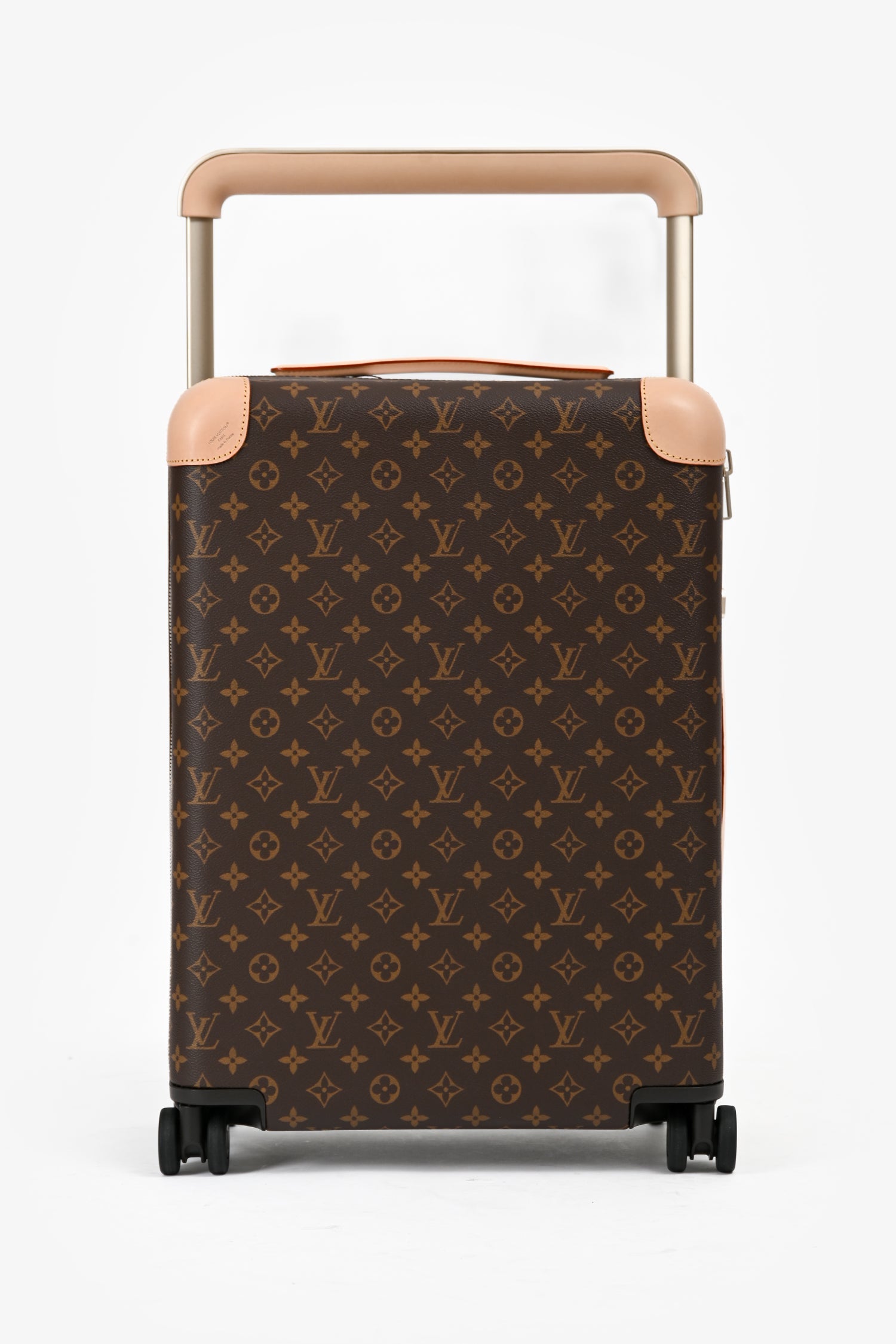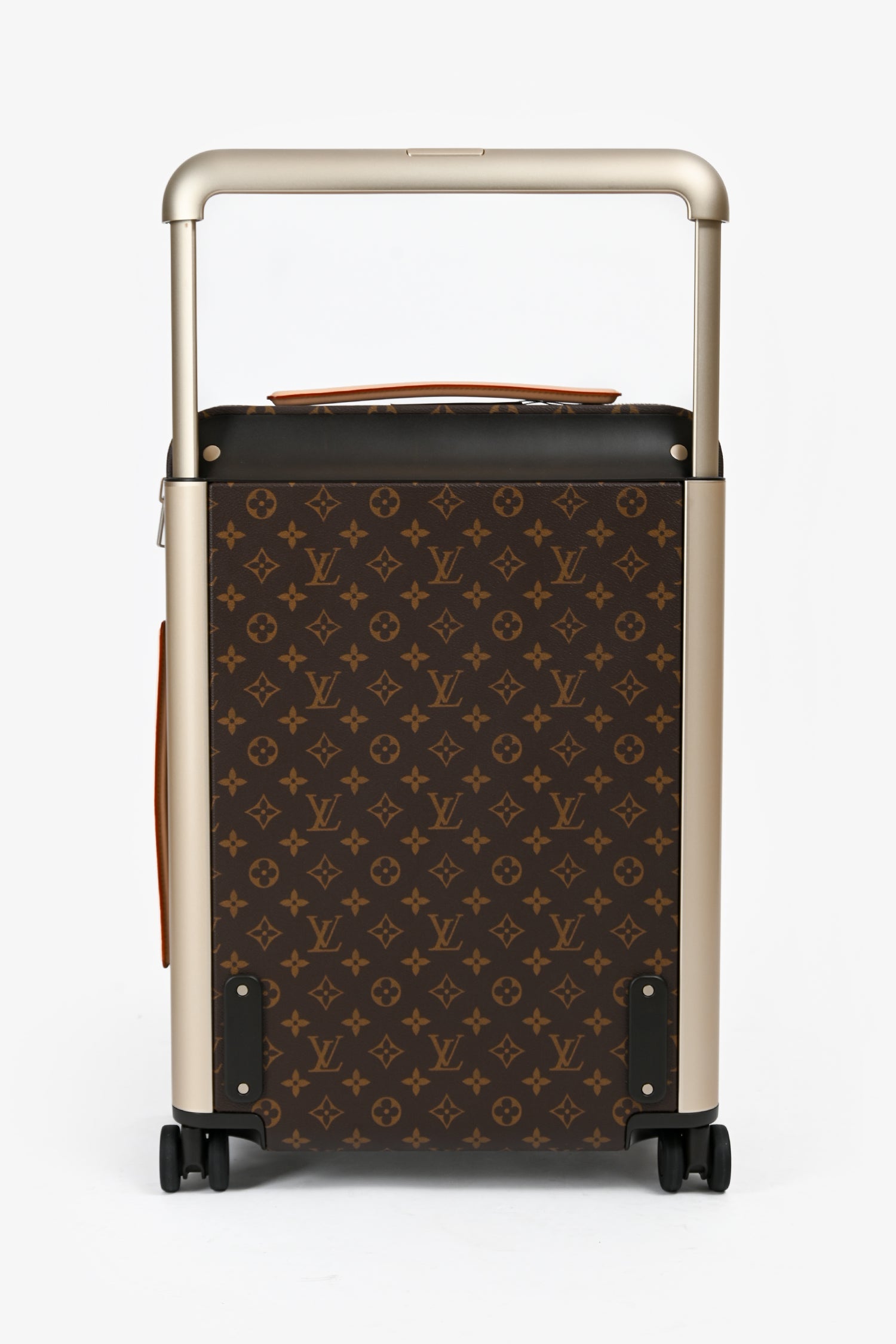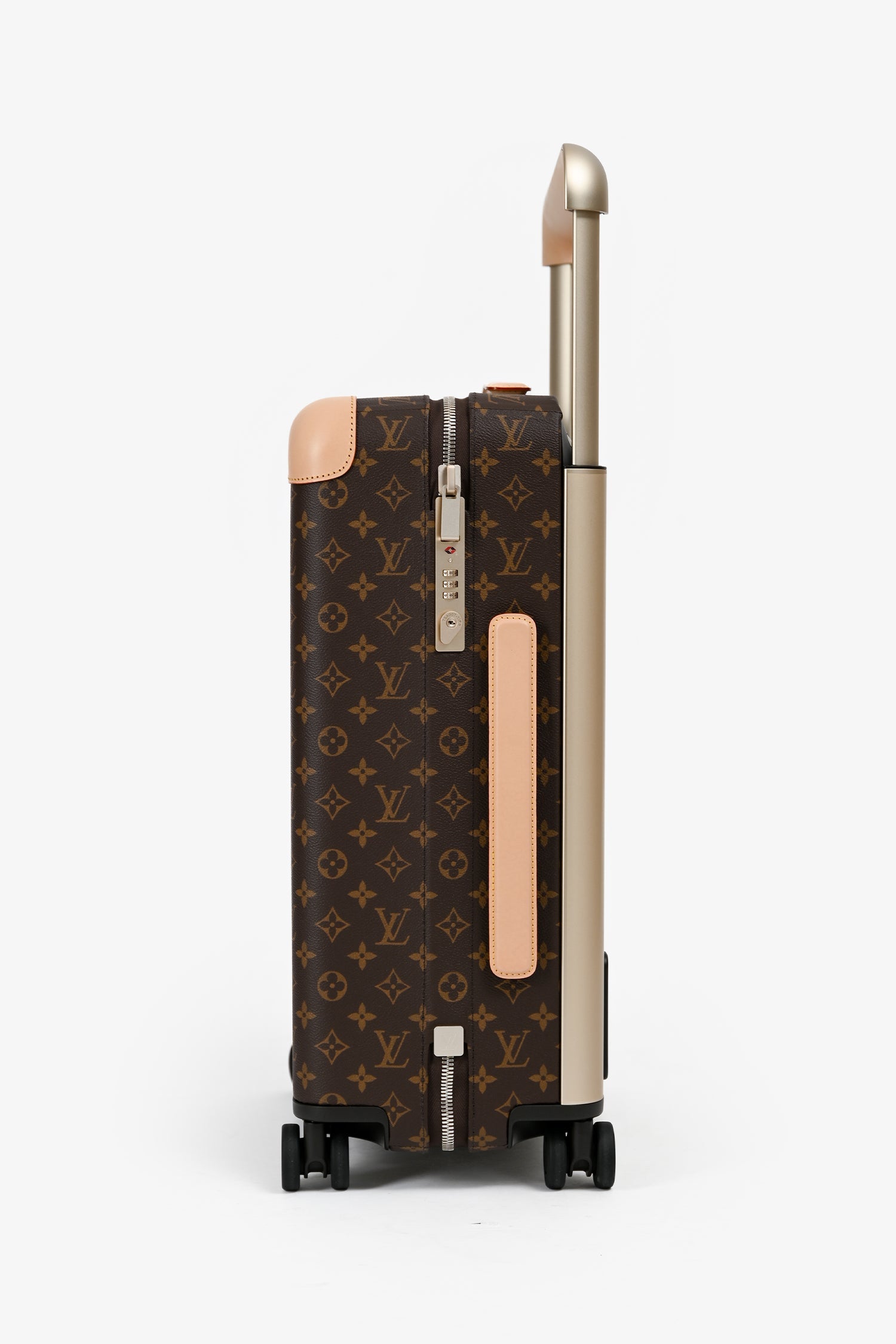 Louis Vuitton 2025 Monogram Horizon 50 Rolling Luggage. Zip-around closure with TSA-approved lock. Retractable telescopic handle; top and side carry handle. Hard-sided construction. 4 multi-directional spinner wheels. Interior main compartment 2 zip pockets; elasticized compression straps. Protective corner details. Gold-tone hardware. Tonal stitching.