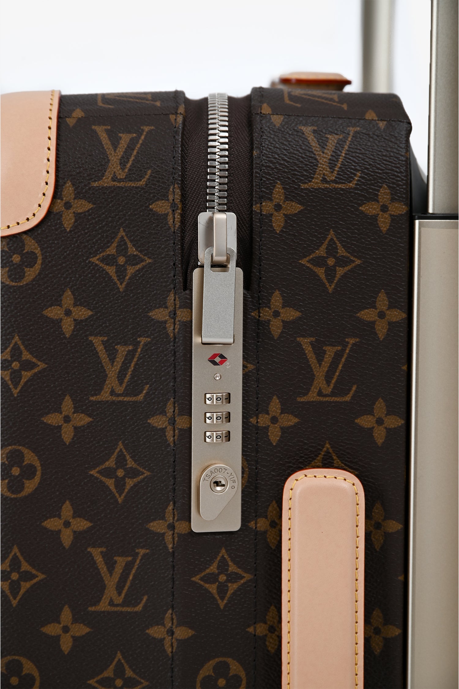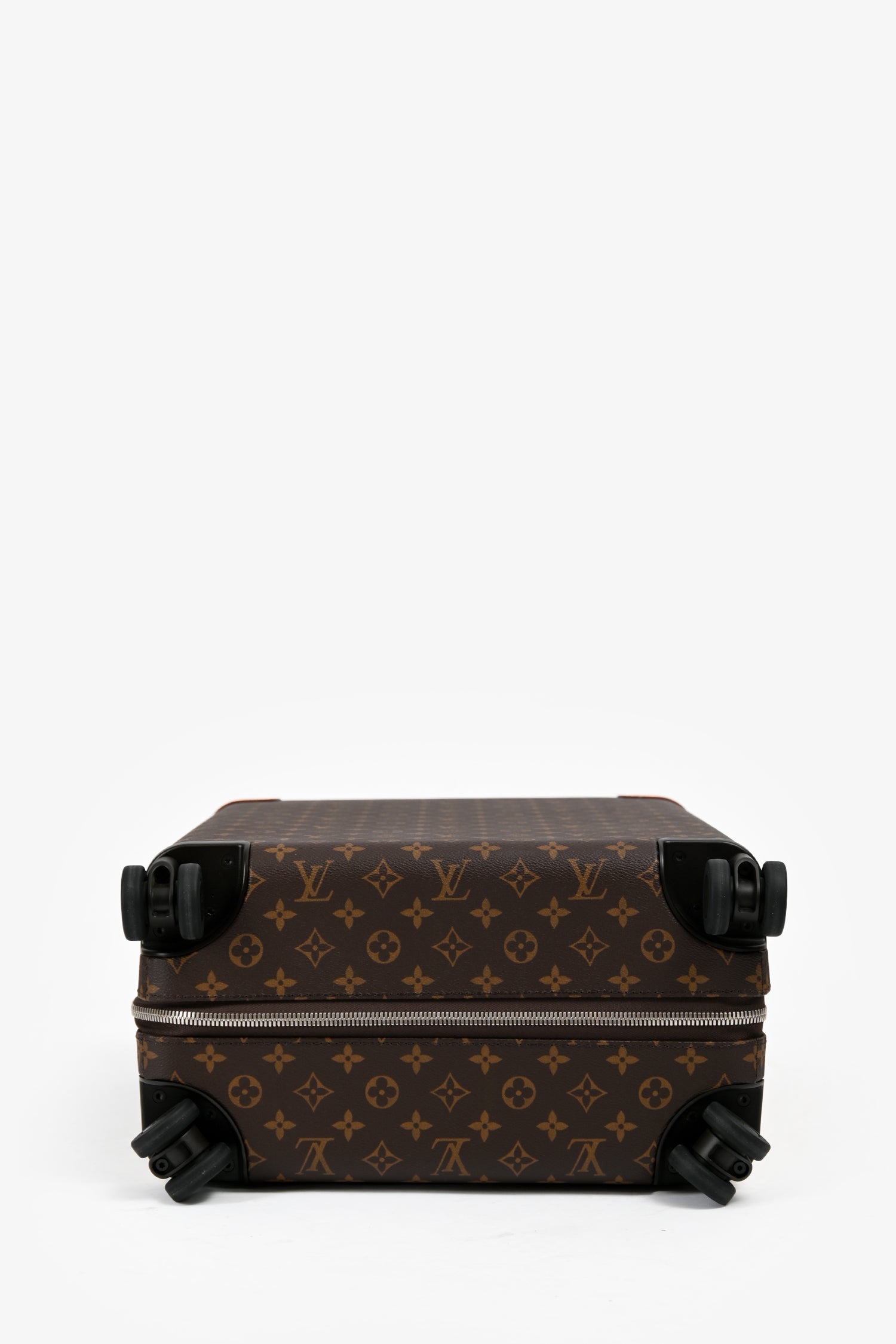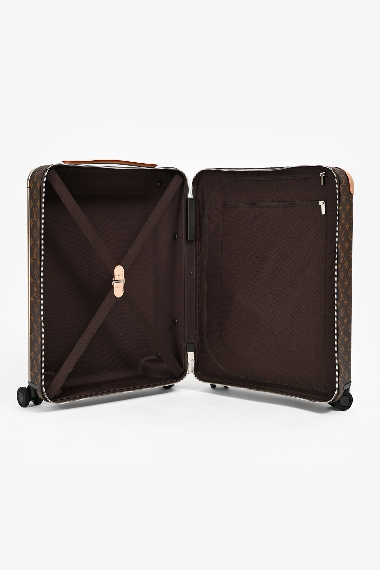 Louis Vuitton 2025 Monogram Horizon 50 Rolling Luggage. Zip-around closure with TSA-approved lock. Retractable telescopic handle; top and side carry handle. Hard-sided construction. 4 multi-directional spinner wheels. Interior main compartment 2 zip pockets; elasticized compression straps. Protective corner details. Gold-tone hardware. Tonal stitching.