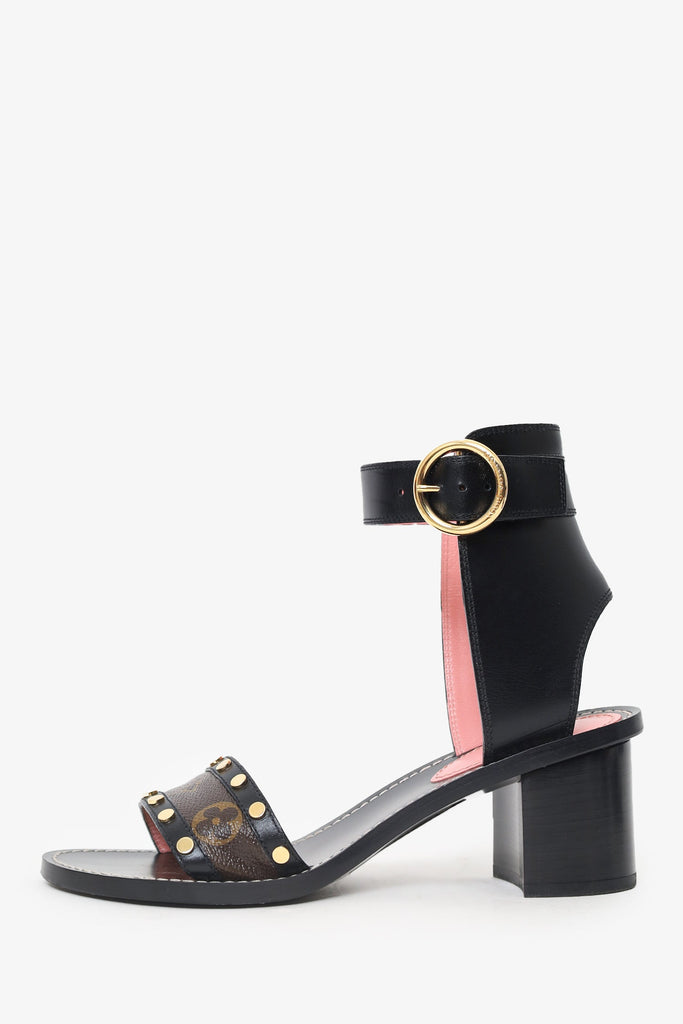 Louis Vuitton Black Leather New Wave Bom Dia Flat Sandals. Slip-on. Round open-toe. Adjustable pull-through buckle closure to exterior. Block heel. Contrast and tonal stitching. Gold-tone hardware.