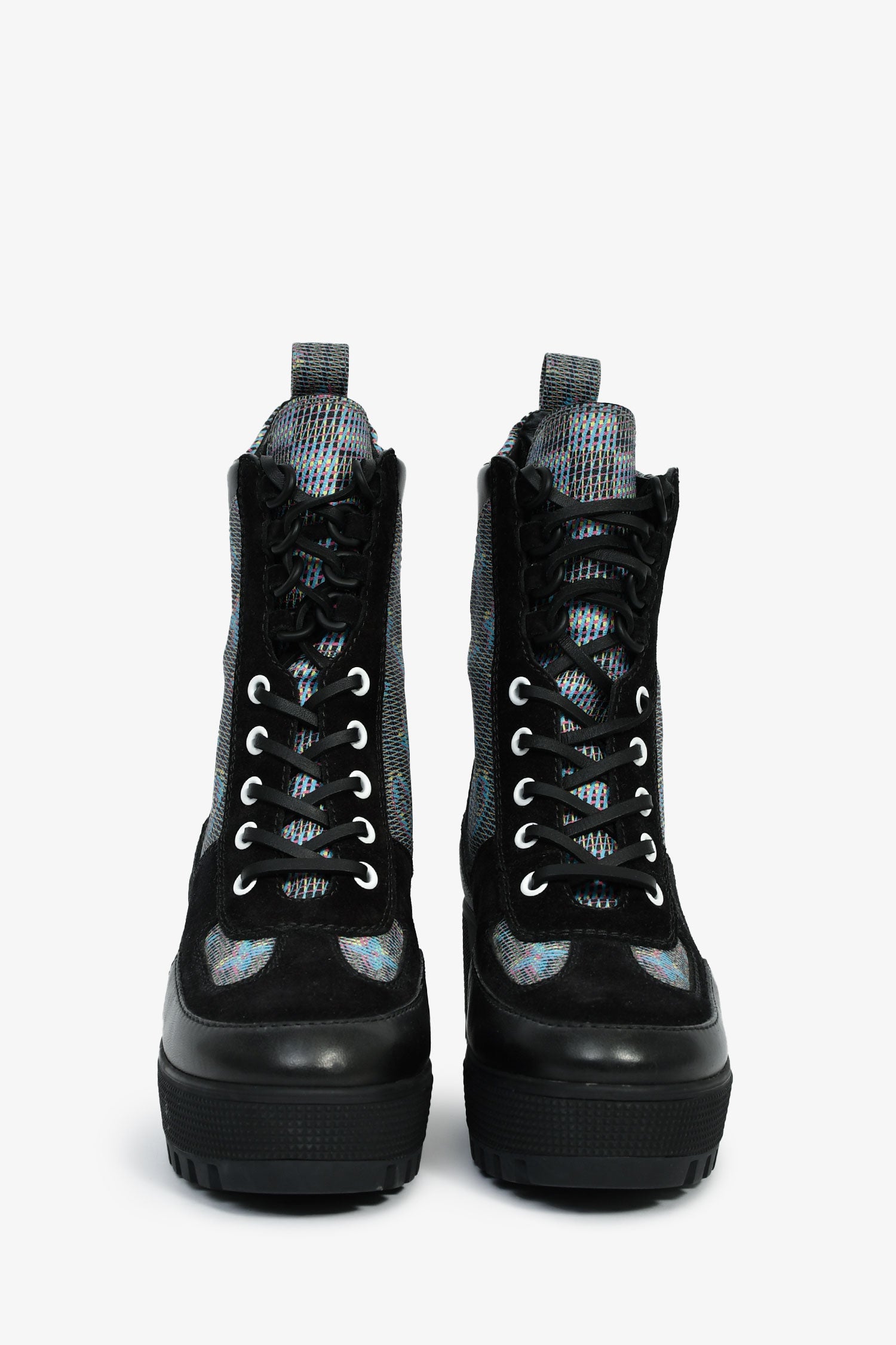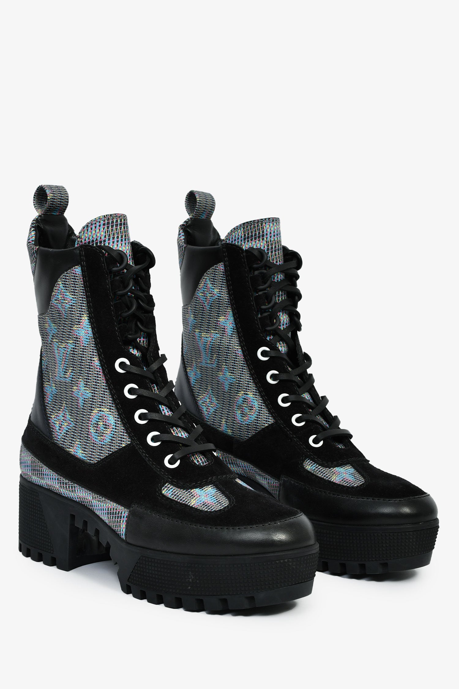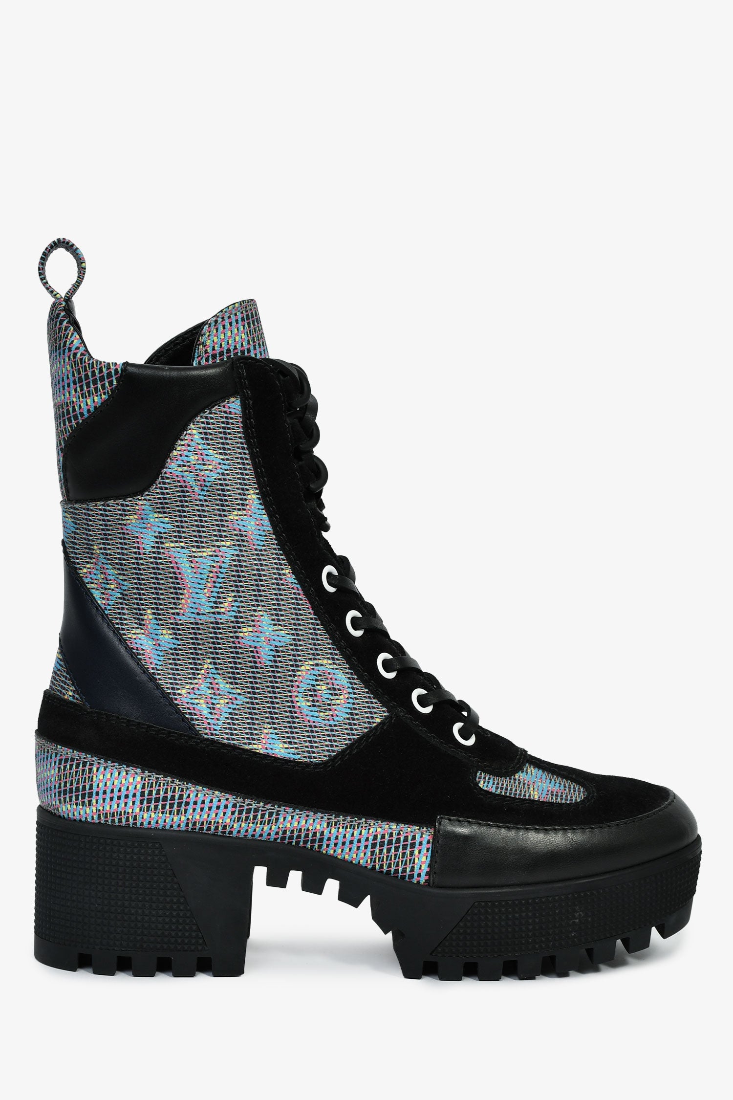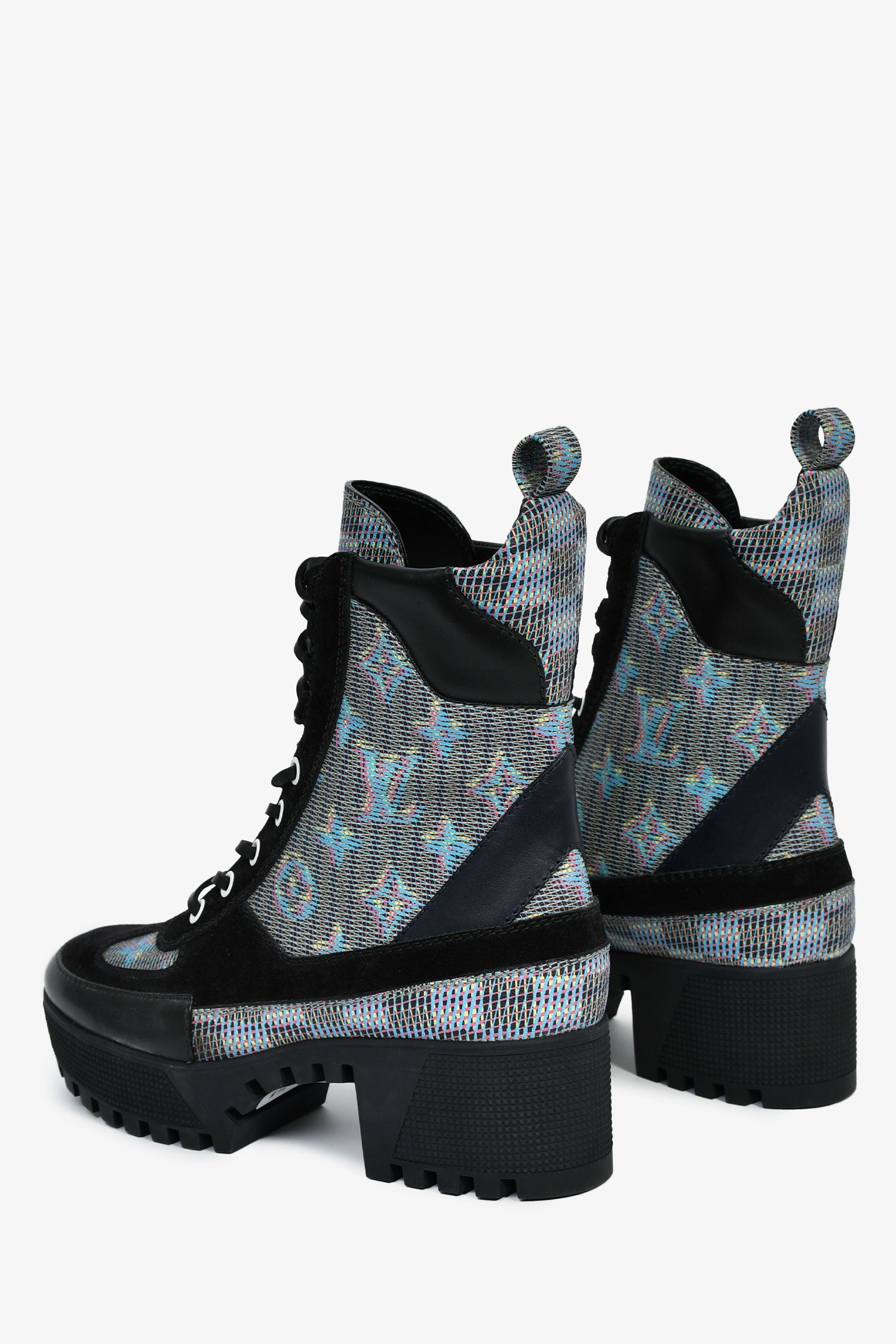 Louis Vuitton Blue/Black Leather Monogram Laureate Boots. Round toe. Front lace-up closure. Tonal stitching.
