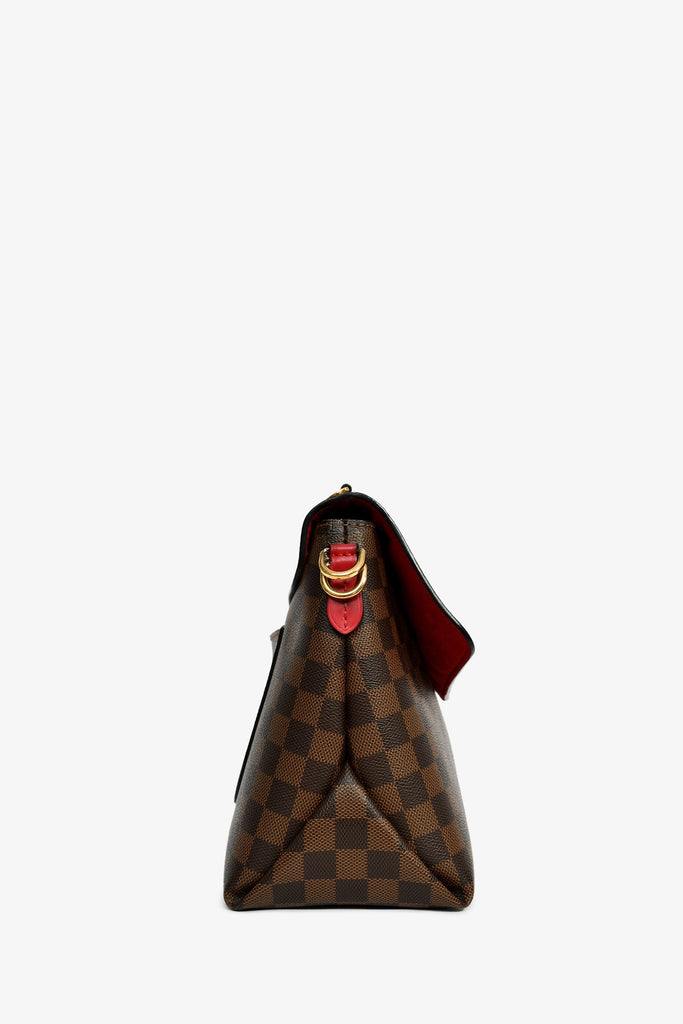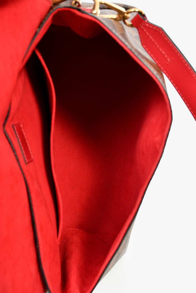 Louis Vuitton Brown Beaubourg MM Logo Crossbody Bag. Front fold-over flap with magnetic button closure. Red suede interior lining. Single interior wall slip pocket. Detachable straps and luggage tag. Exterior rear slip pocket. Gold-tone hardware.