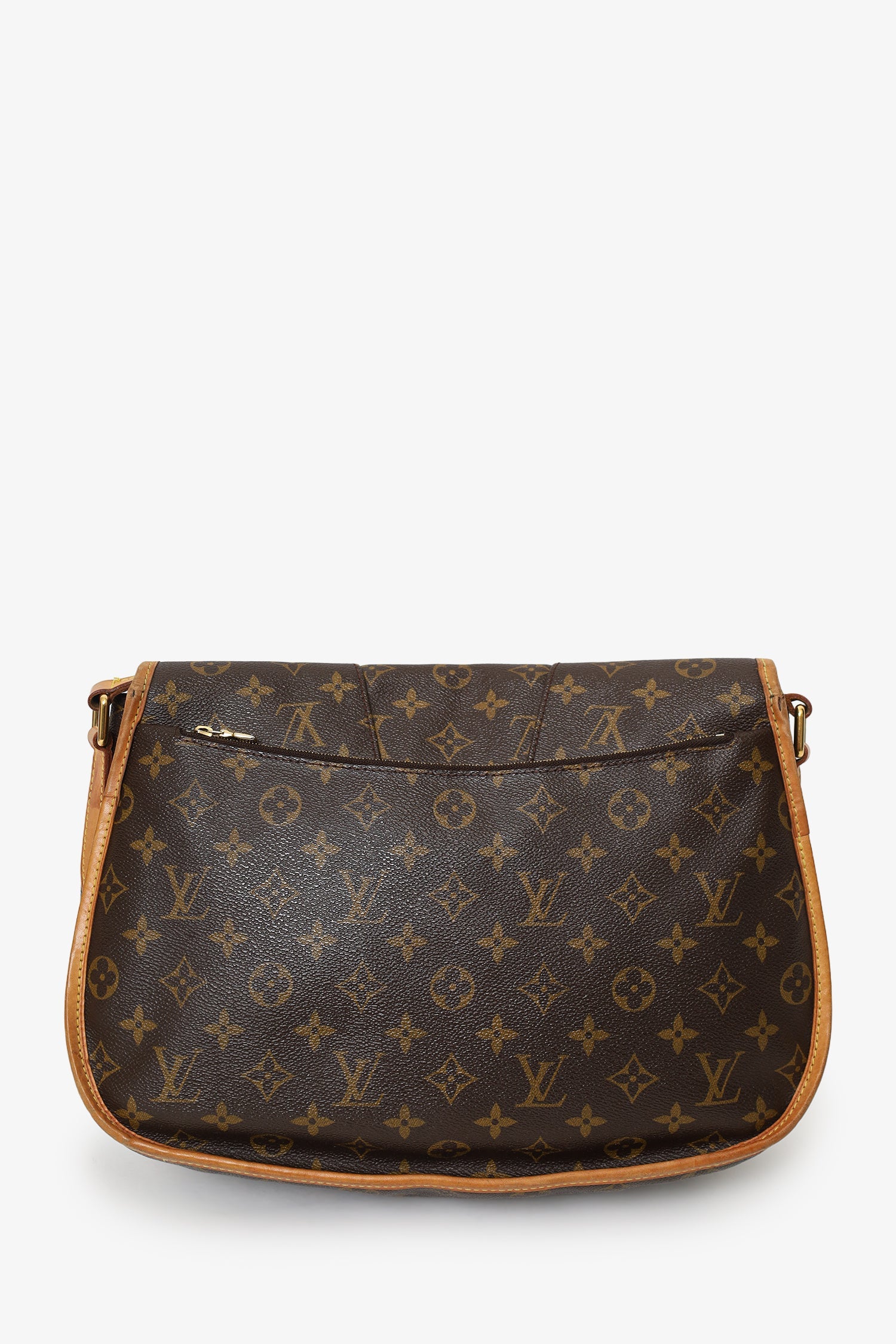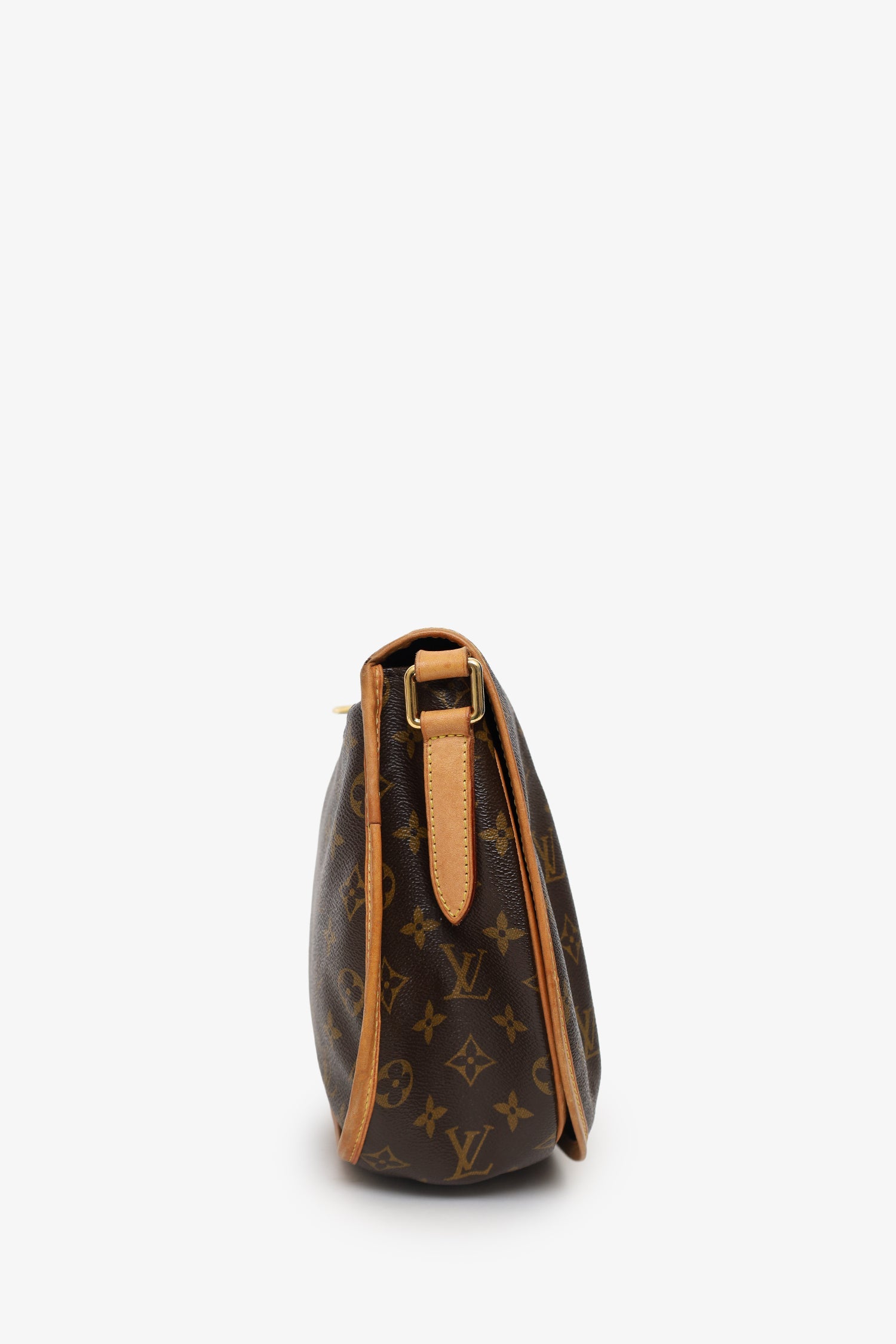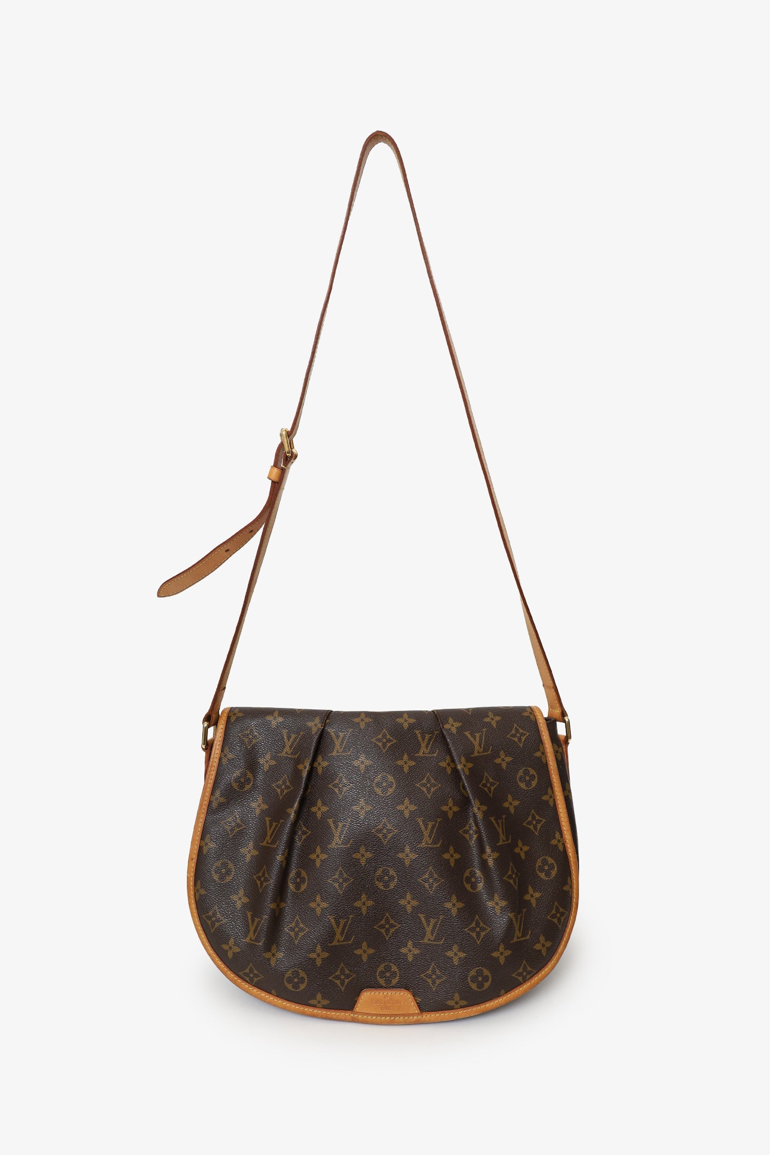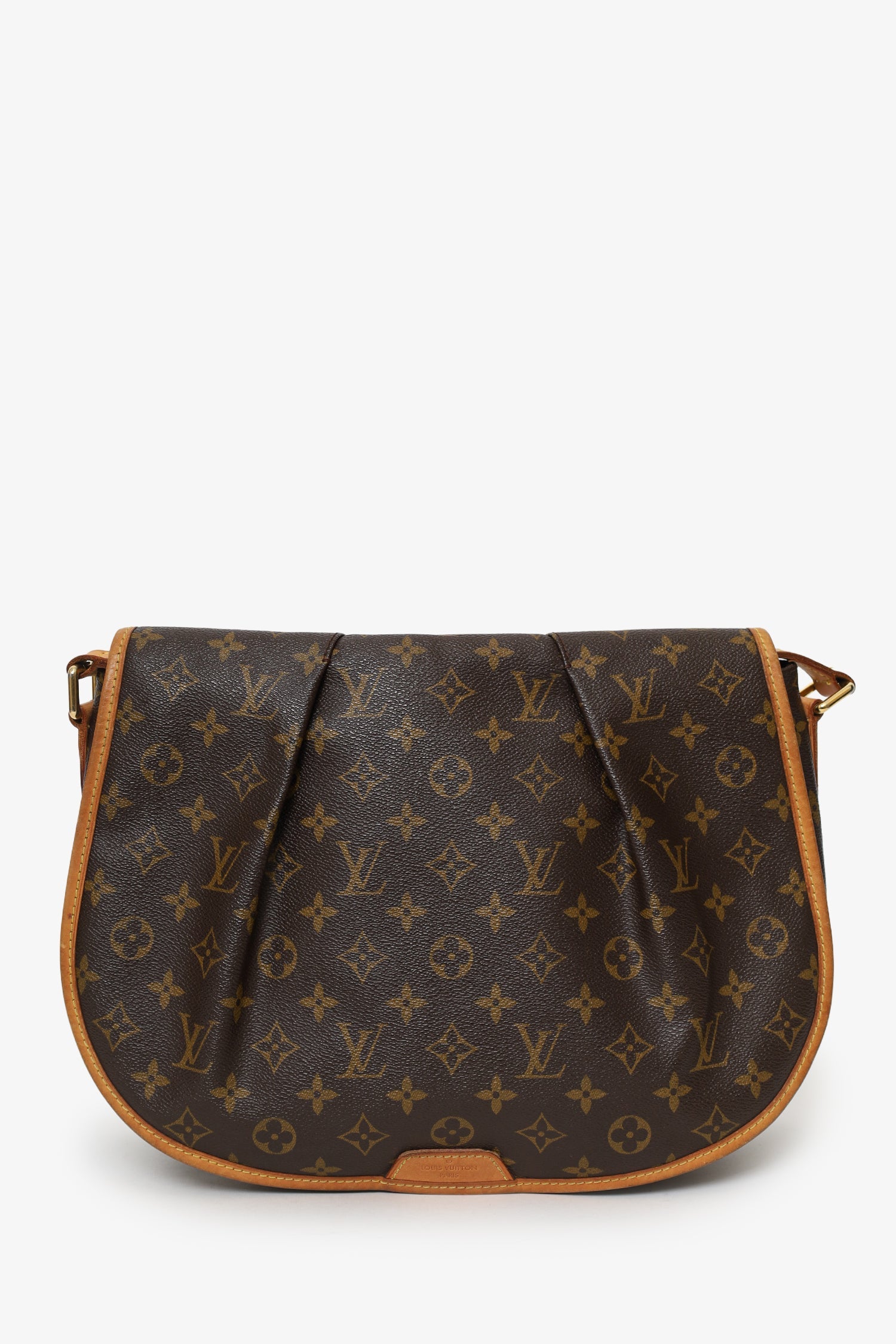 Louis Vuitton Monogram Canvas Menilmontant MM. Front fold-over flap. Leather crossbody strap with adjustable pull-through buckle closure. Single exterior rear zip-up pocket. Canvas-lined interior with 4 pockets; 2 front slip, 1 middle open compartments, and 1 rear zip-up pocket. Gold-tone hardware. Tonal stitching.