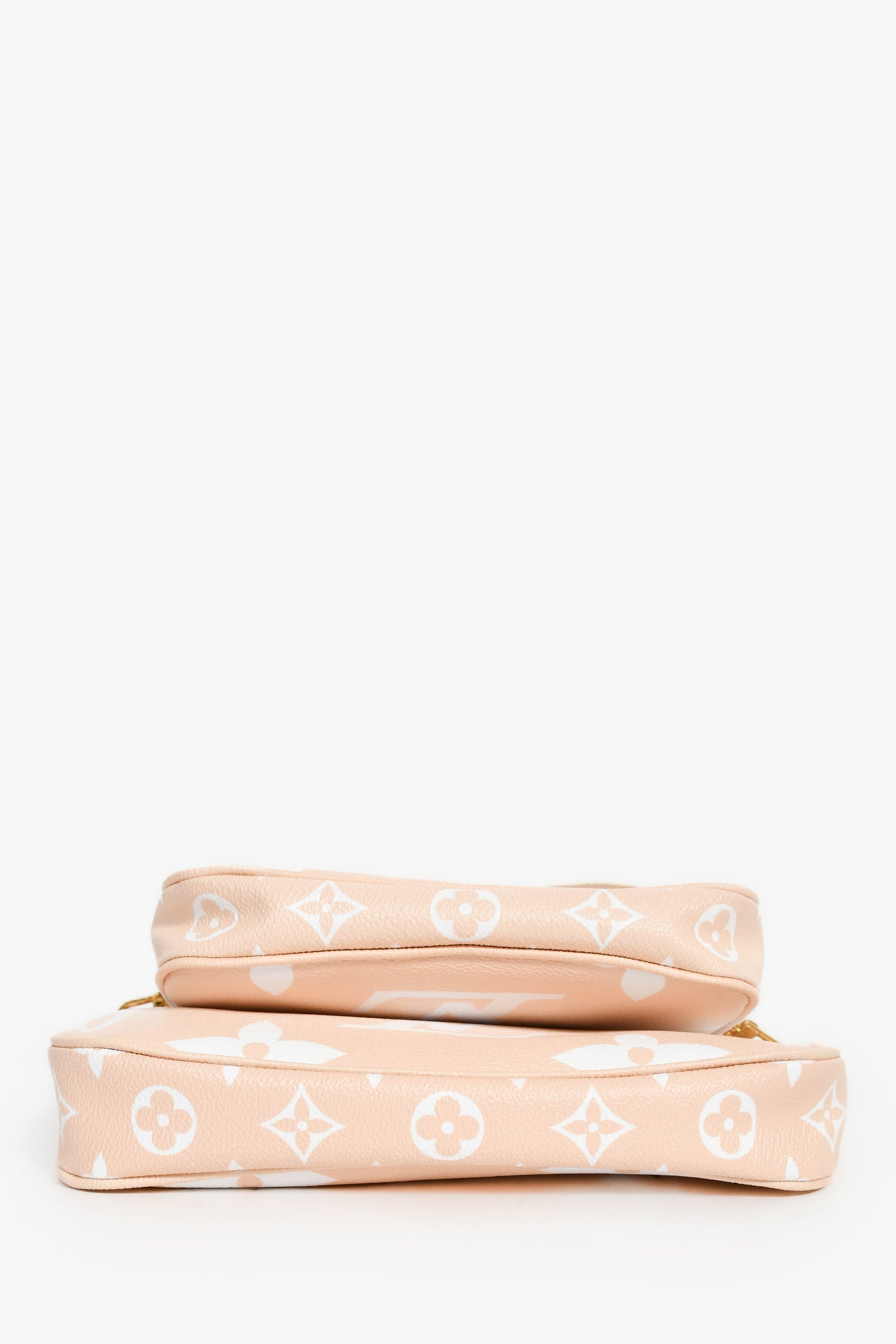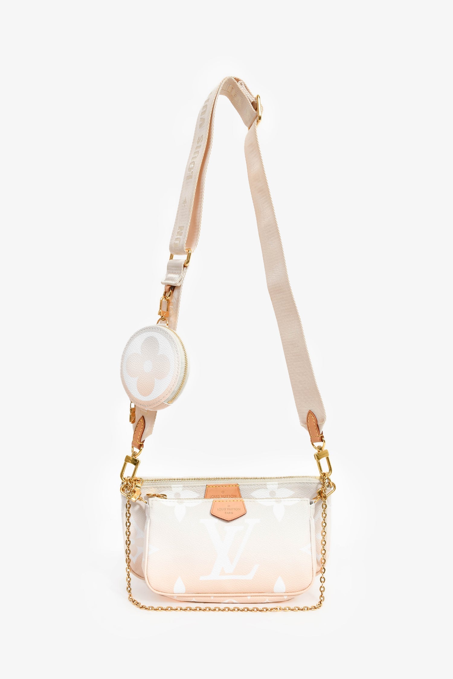 Louis Vuitton Peach Monogram 'By The Pool' Multi-Pochette Crossbody. Top zip closure. Detachable web strap, shoulder chain, pouch, and coin pouch. Textile-lined interior. Gold-tone hardware. Tonal stitching.