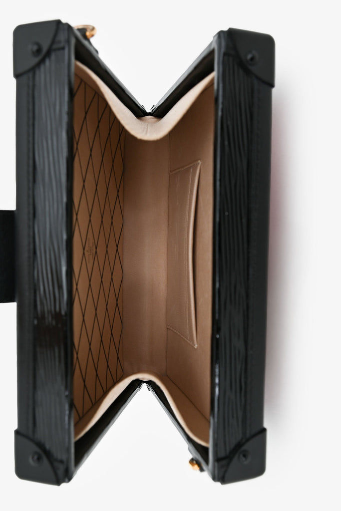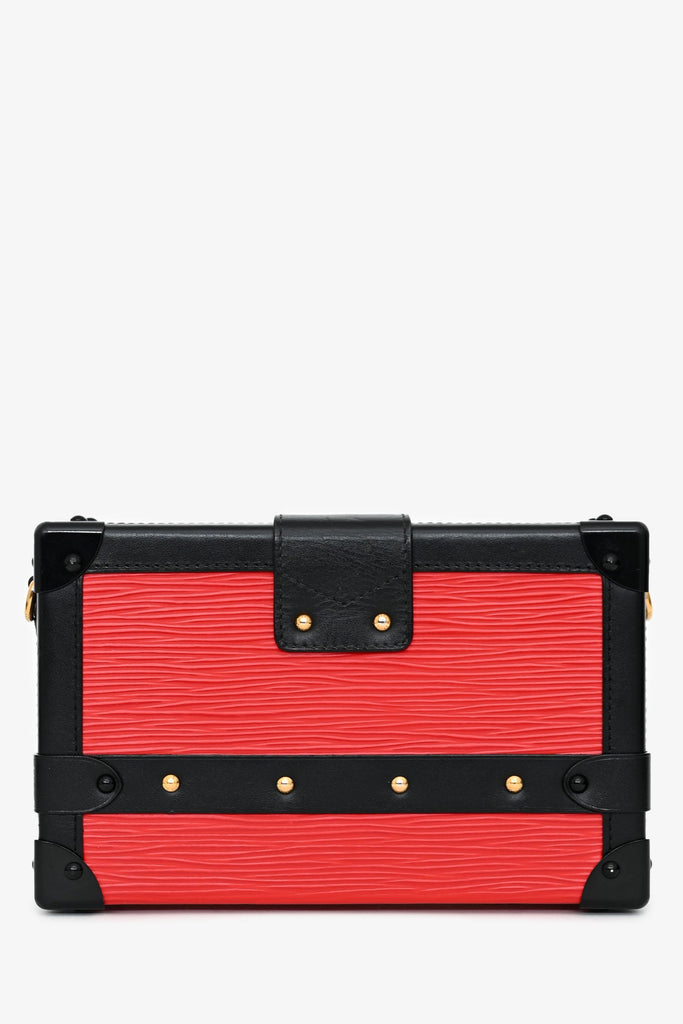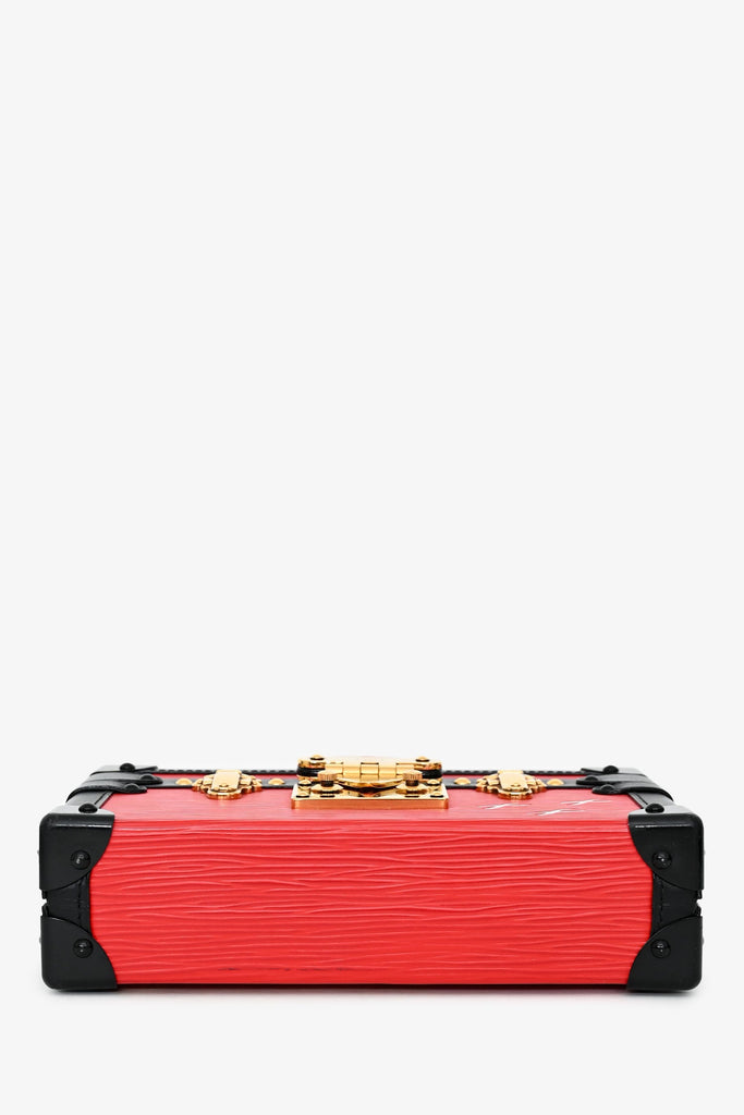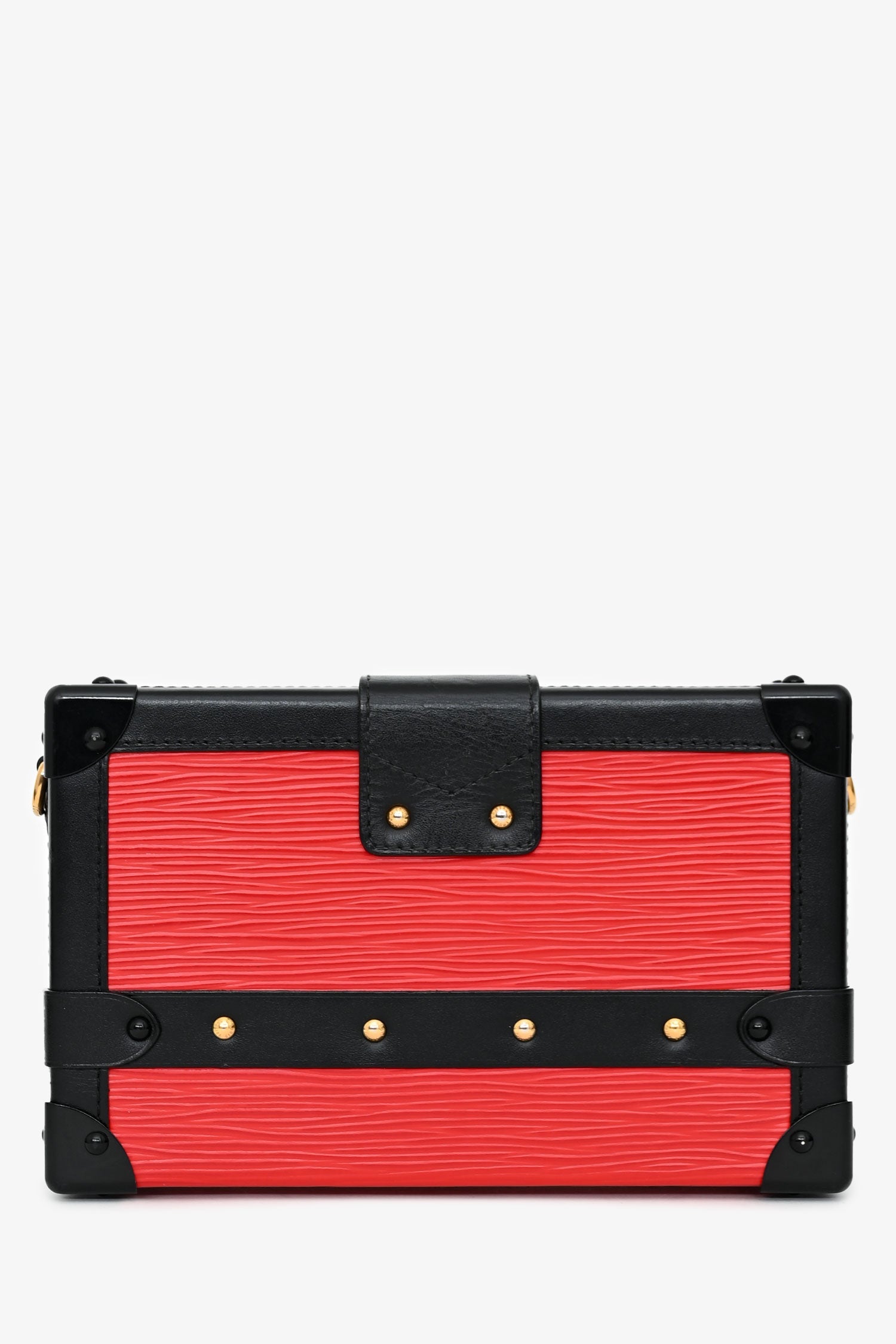 Louis Vuitton Red Epi Leather 'Petite Malle' with Strap. Front push-lock closure. Removable adjustable leather shoulder strap. 1 interior slip pocket. Gold-hardware. Tonal stitching.