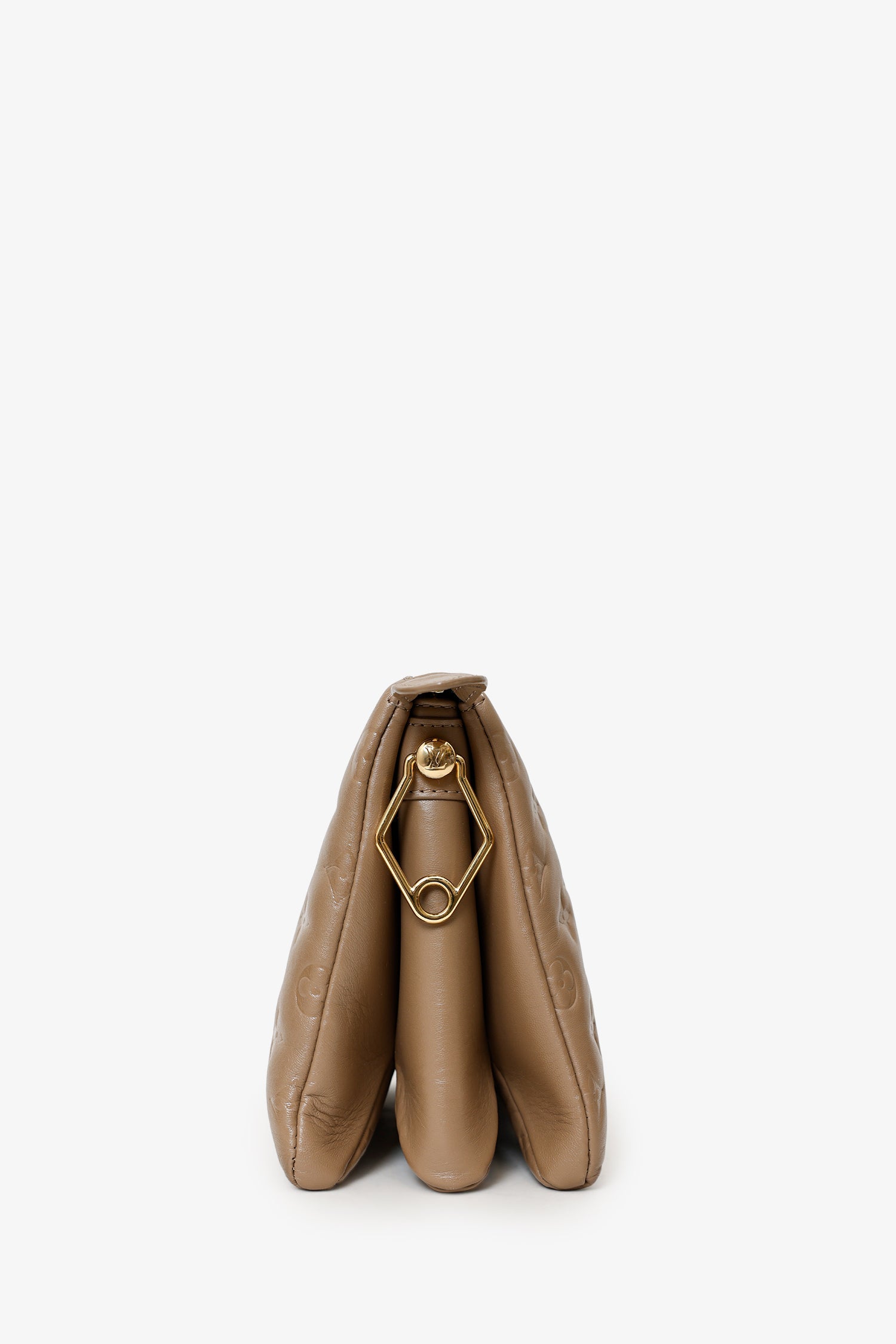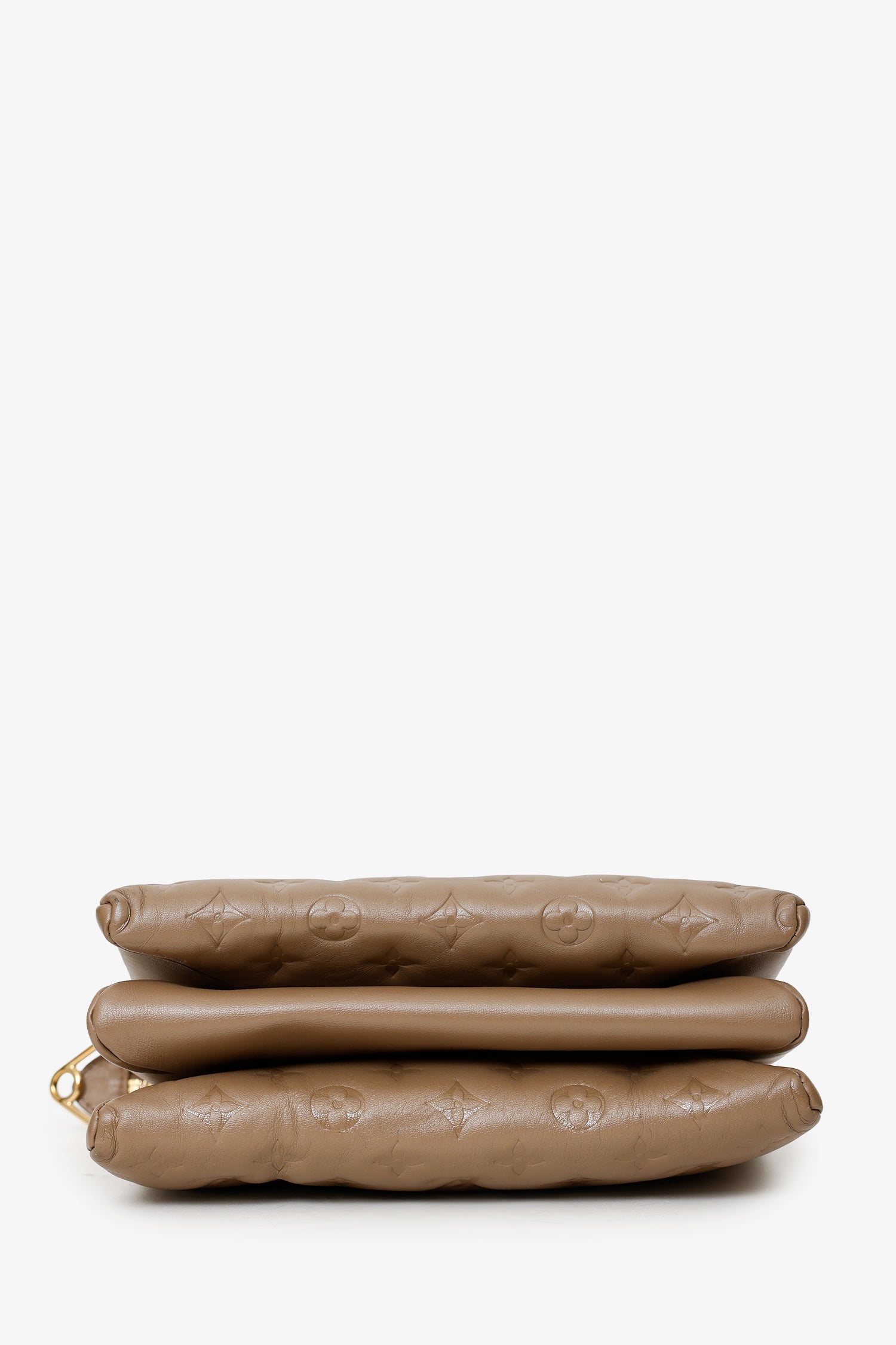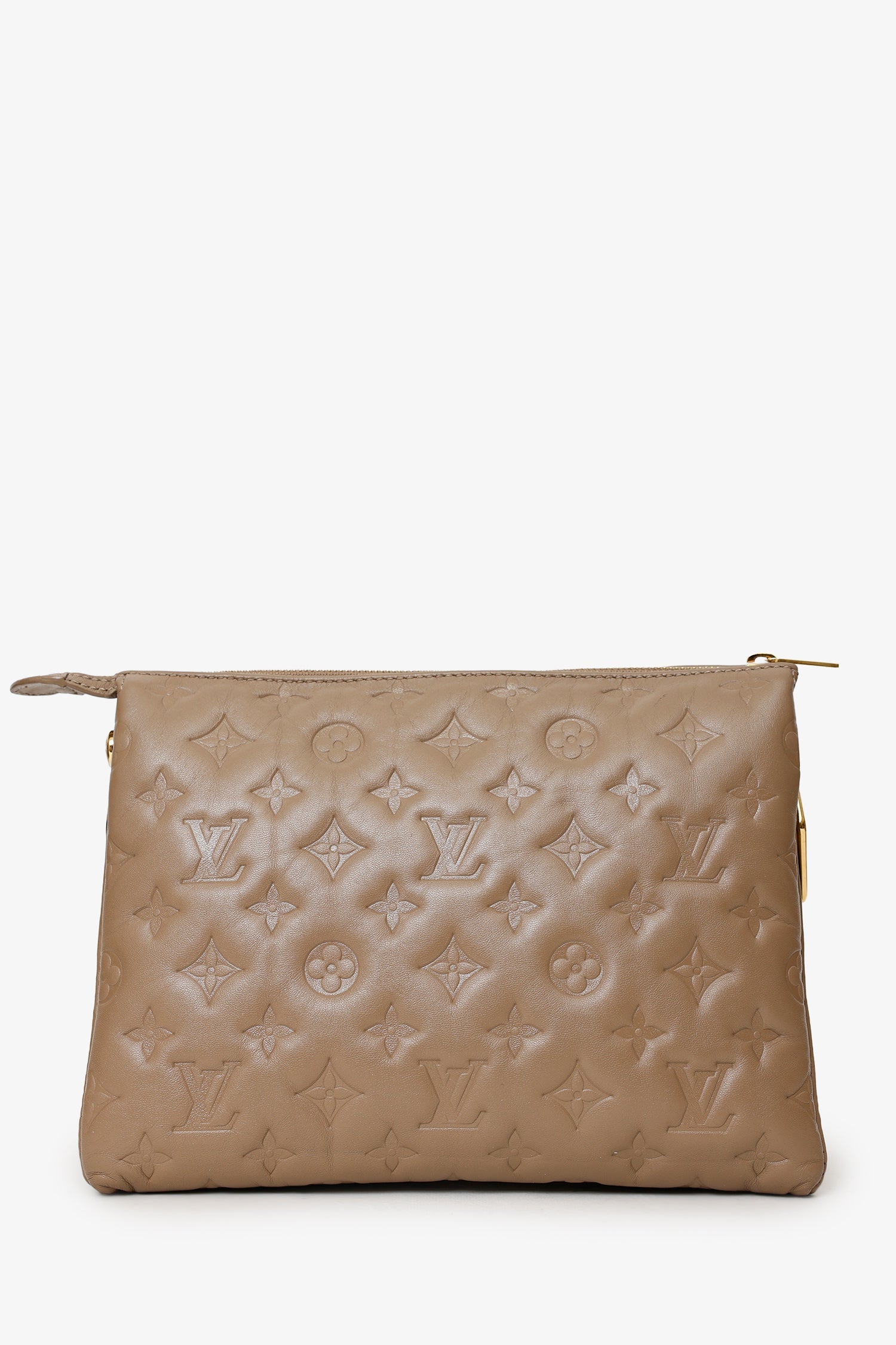 Louis Vuitton Taupe Handbag With Canvas Strap And Gold Chain. Top zip-up closure. Adjustable and removable crossbody strap with clasp closure. Lined interior with 3 pockets; 2 large open, and 1 zip-up. Gold-tone hardware. Tonal stitching.