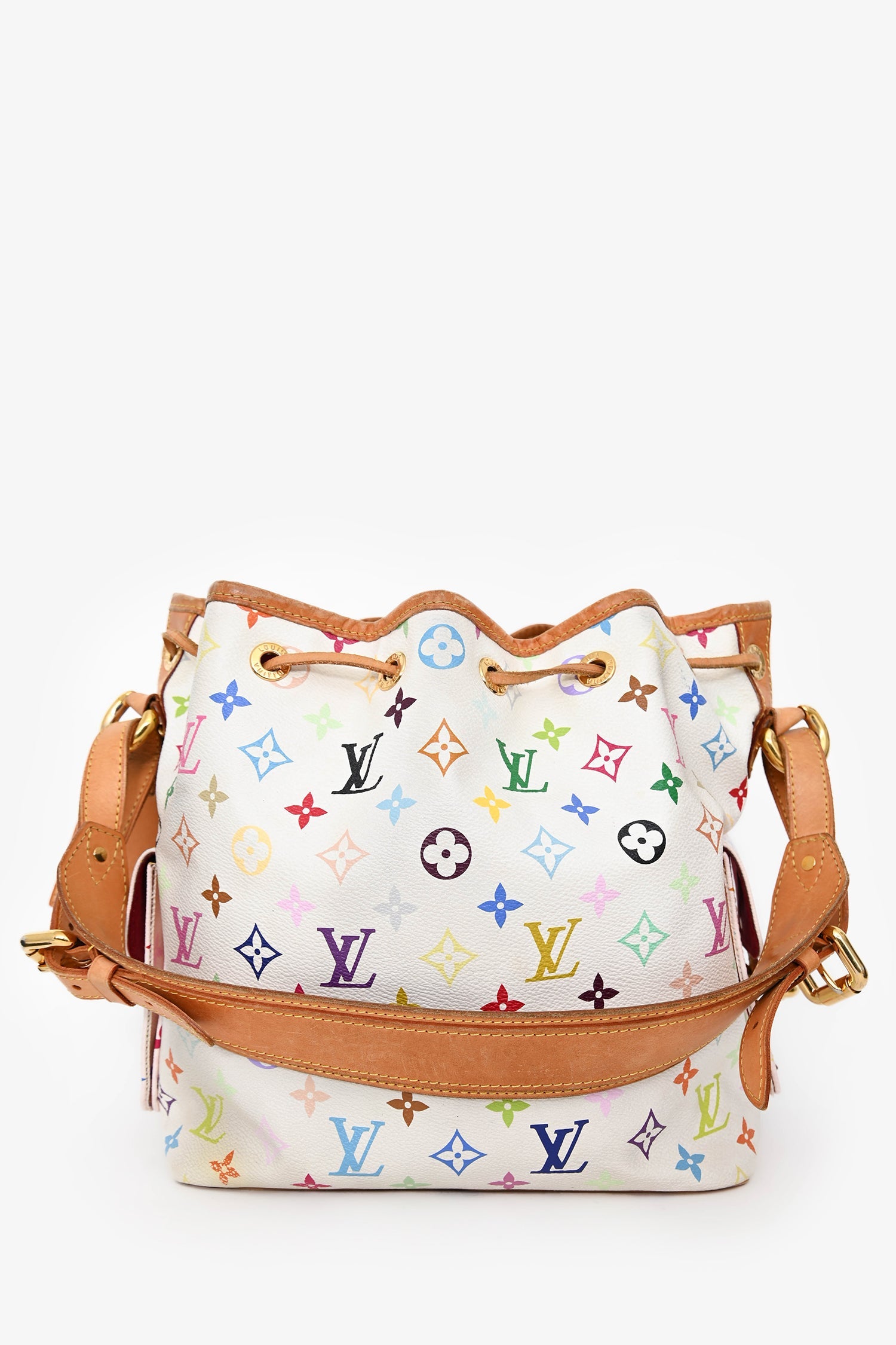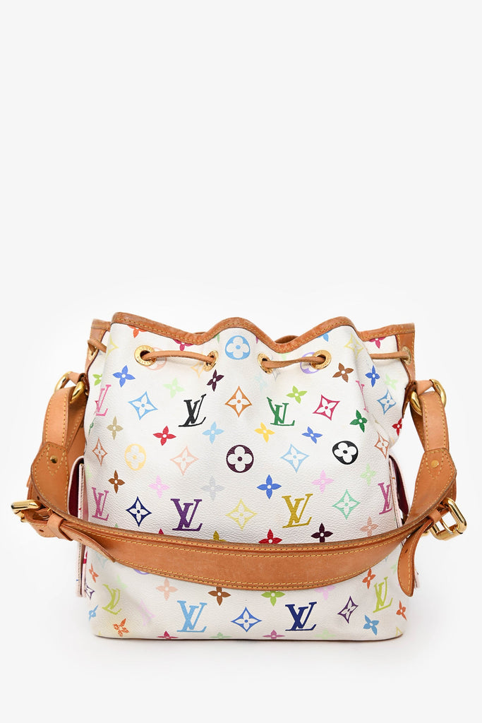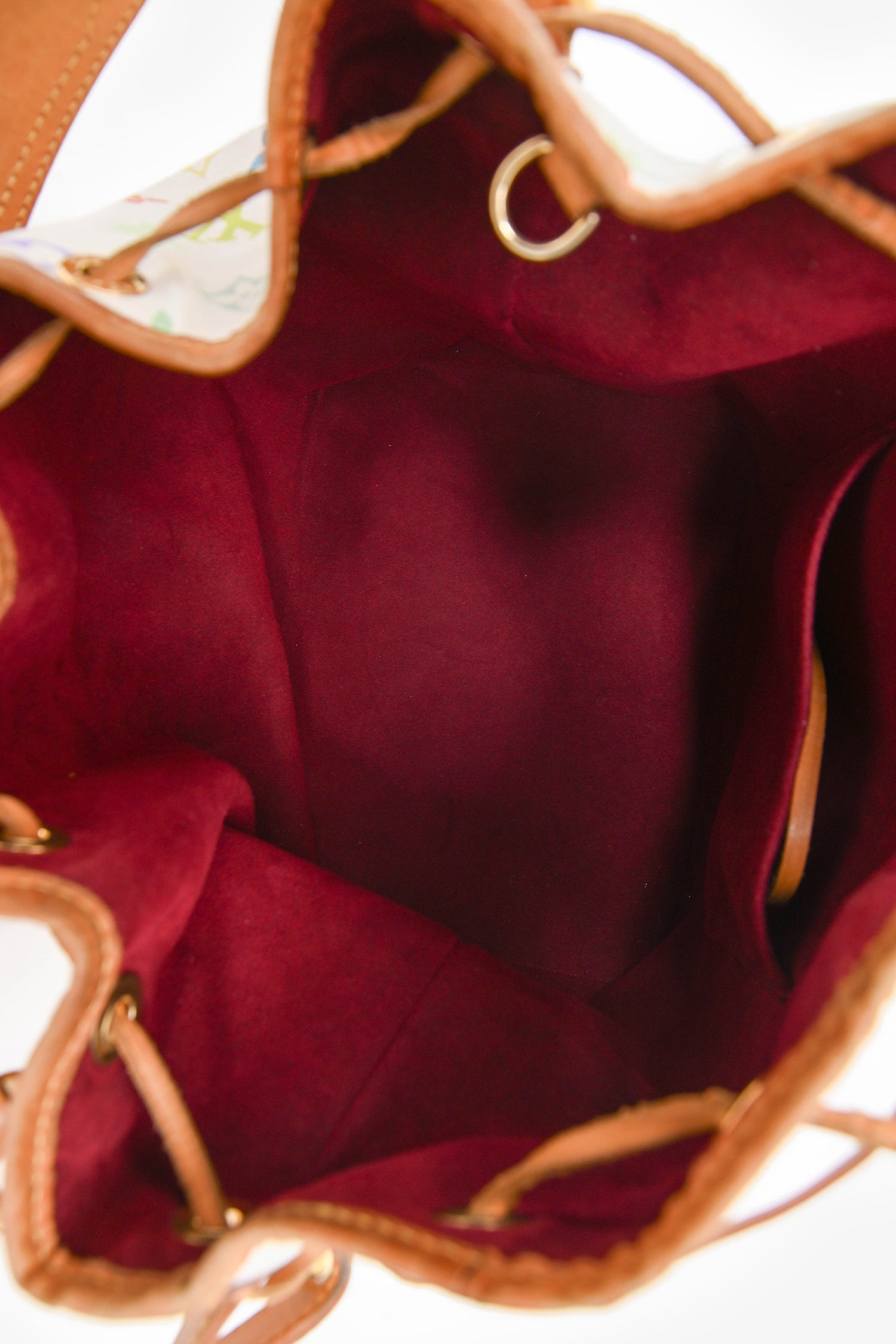 Louis Vuitton x Takashi Murakami 2008 White Monogram Bucket Bag. Top drawstring closure. Adjustable shoulder strap. 2 exterior pockets and attached leather tag. Suede-lined interior with a pocket. Gold-tone hardware. Contrast stitching.