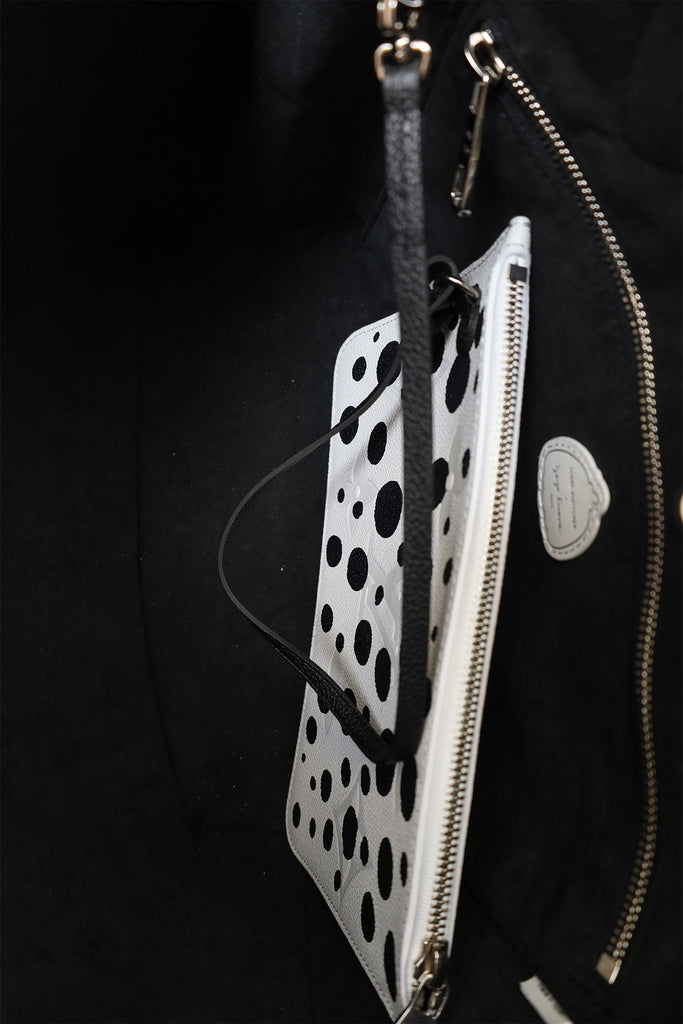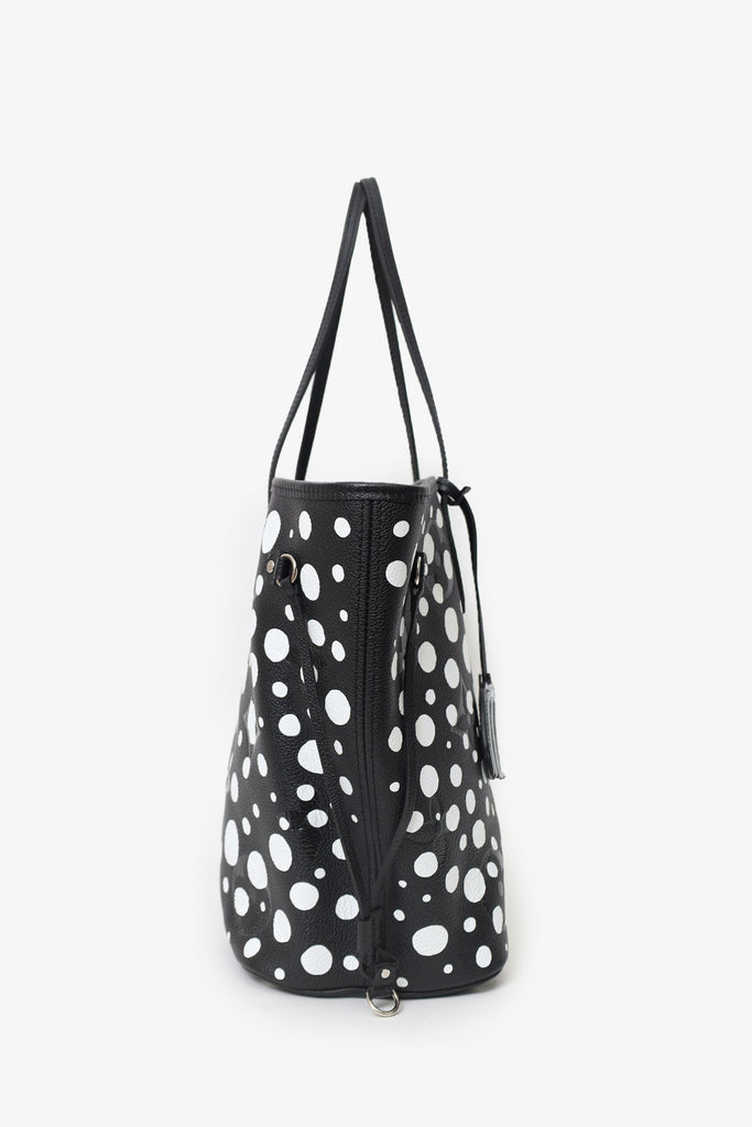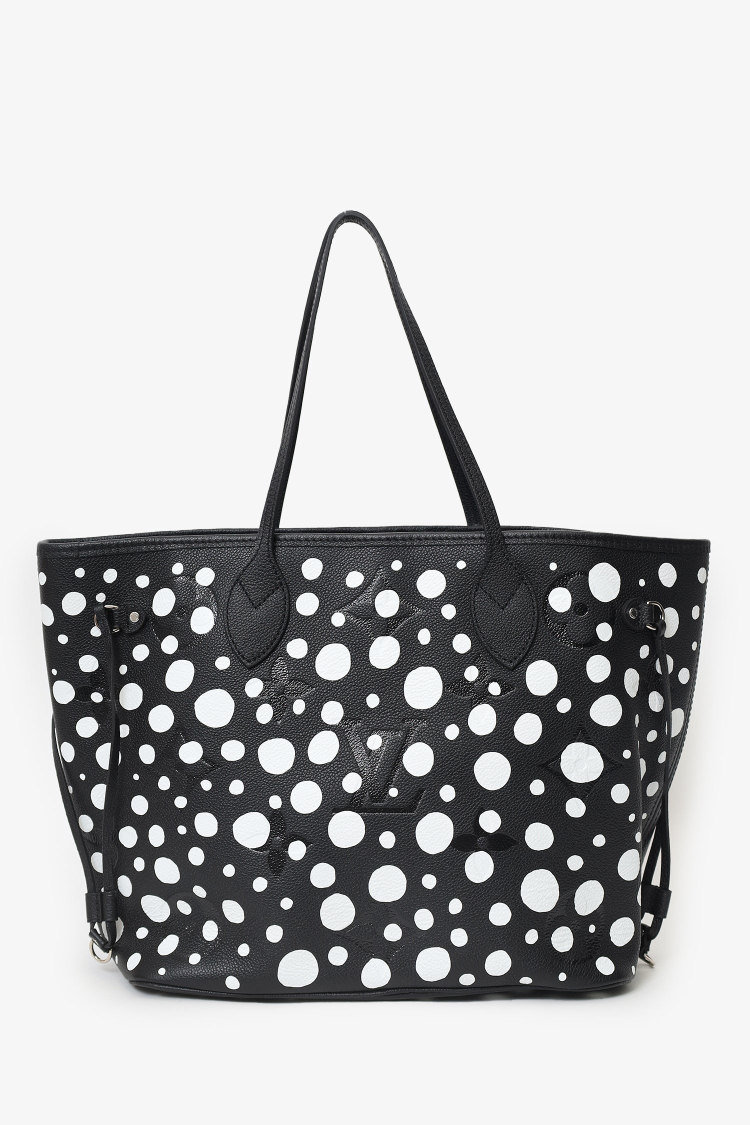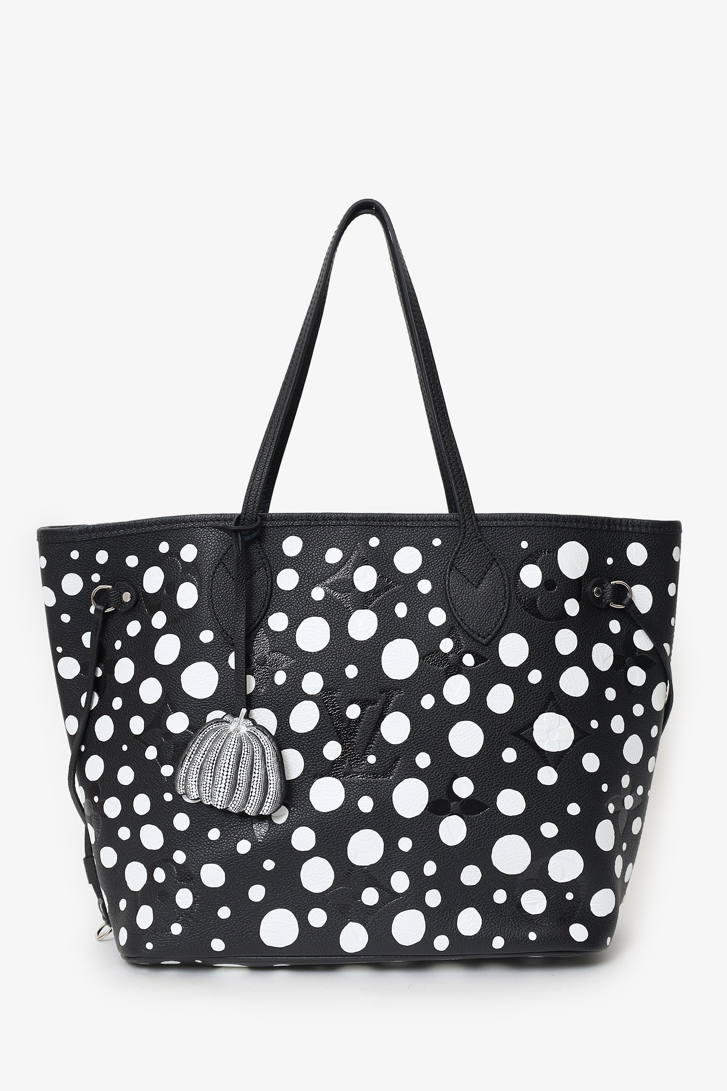 Louis Vuitton x Yayoi Kusama 2023 Black/White Monogram Empreinte Dots Neverfull with Pouch MM. Open top with interior clasp closure. Twin shoulder straps. Twin exterior side straps. Lined interior with single zip pocket. Additional detachable zip pouch. Removable bag tag. Silver-tone hardware. Tonal stitching.