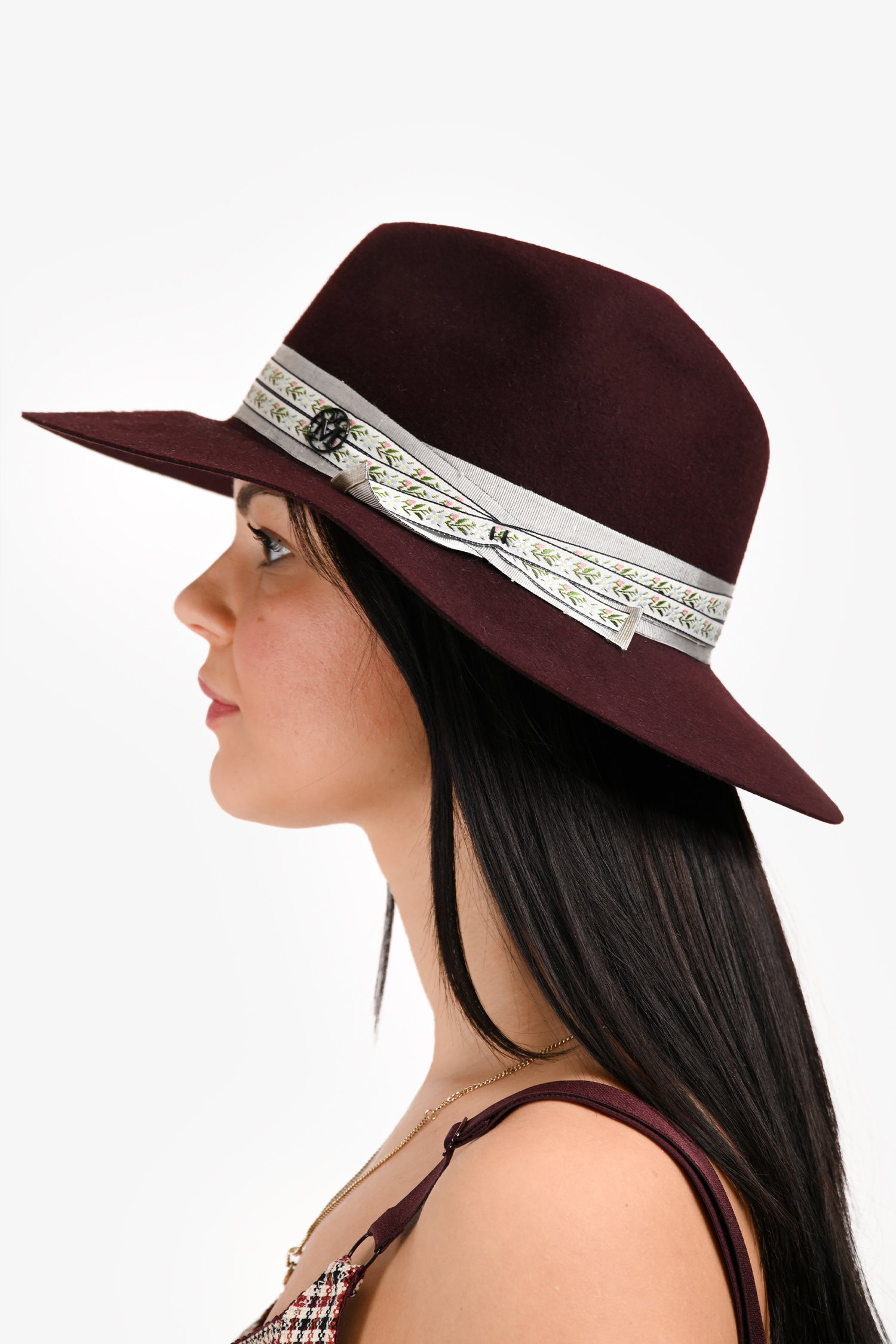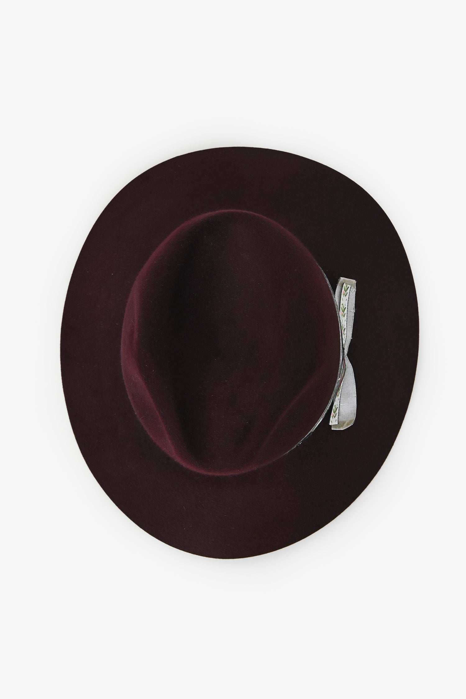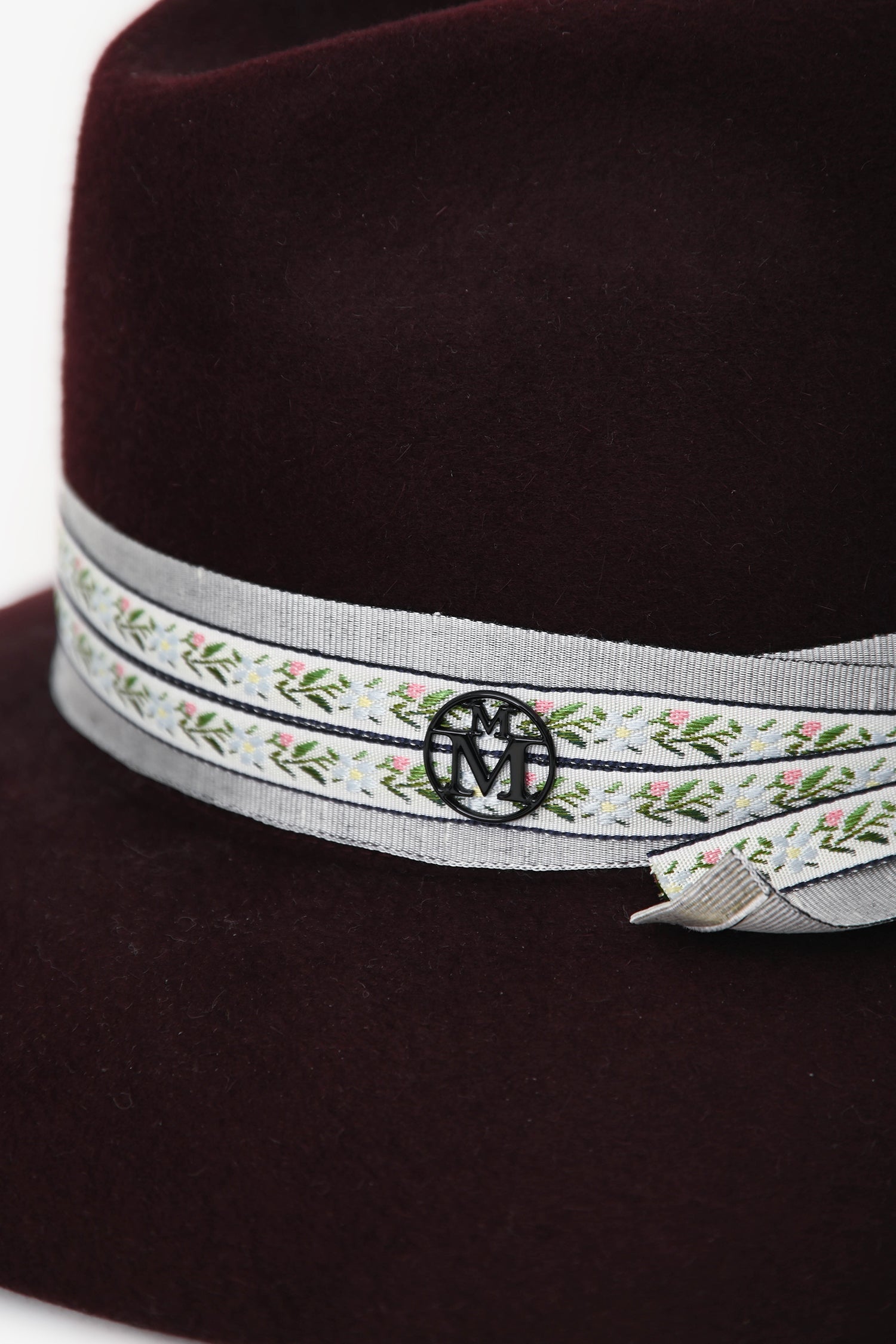 Maison Michel Burgundy Foliate Ribbon Fedora Hats. Tonal stitching.