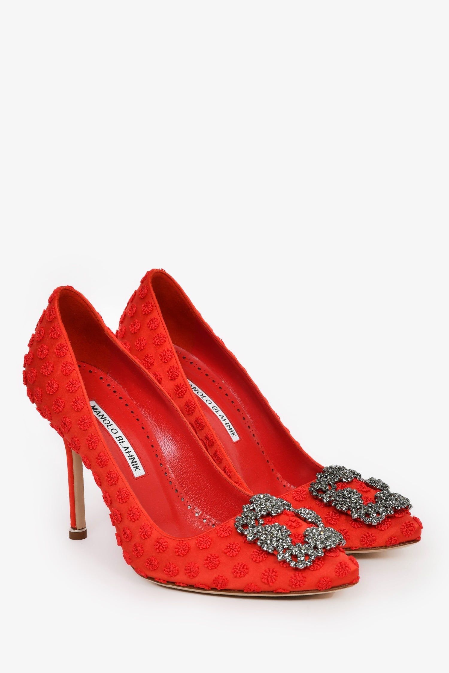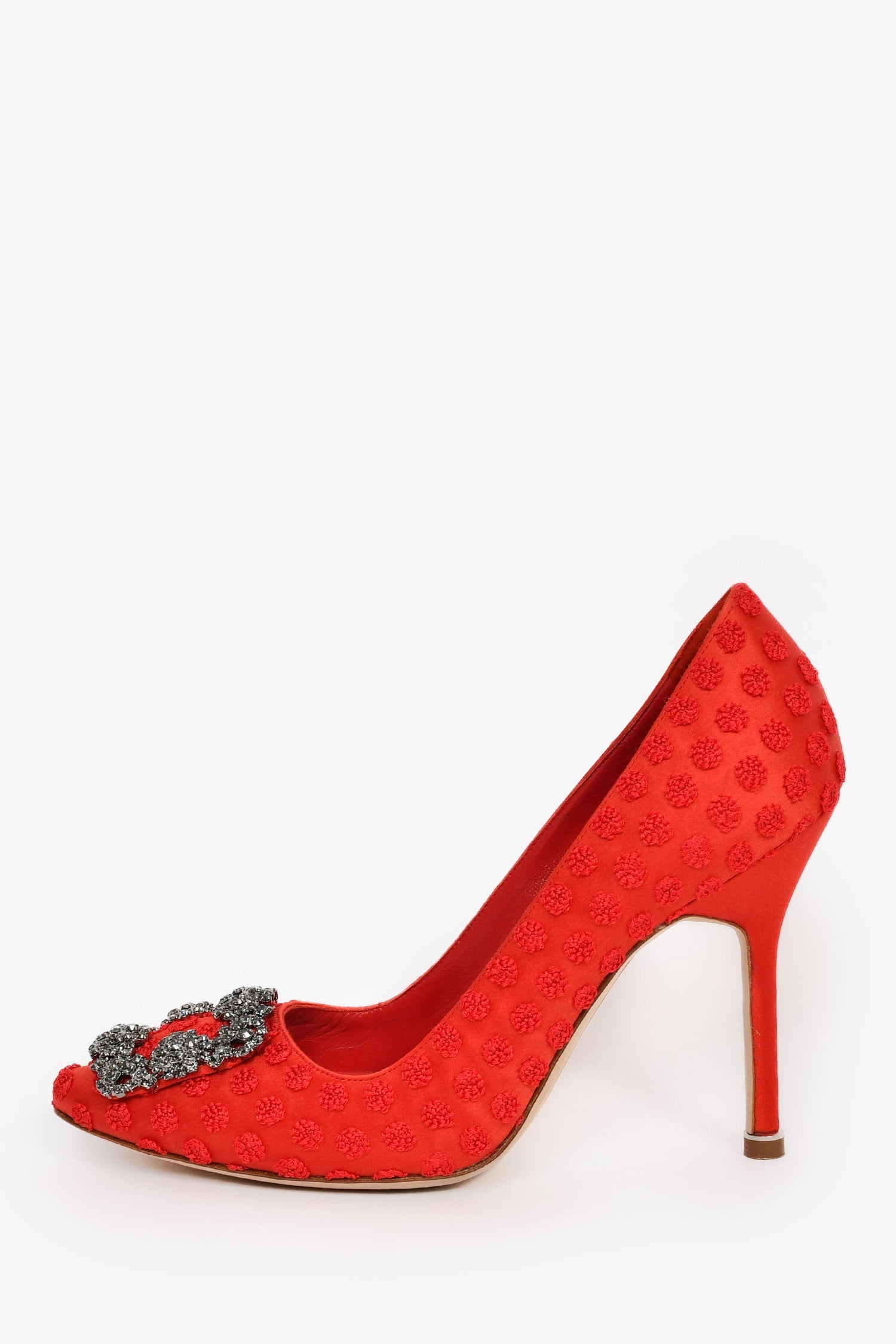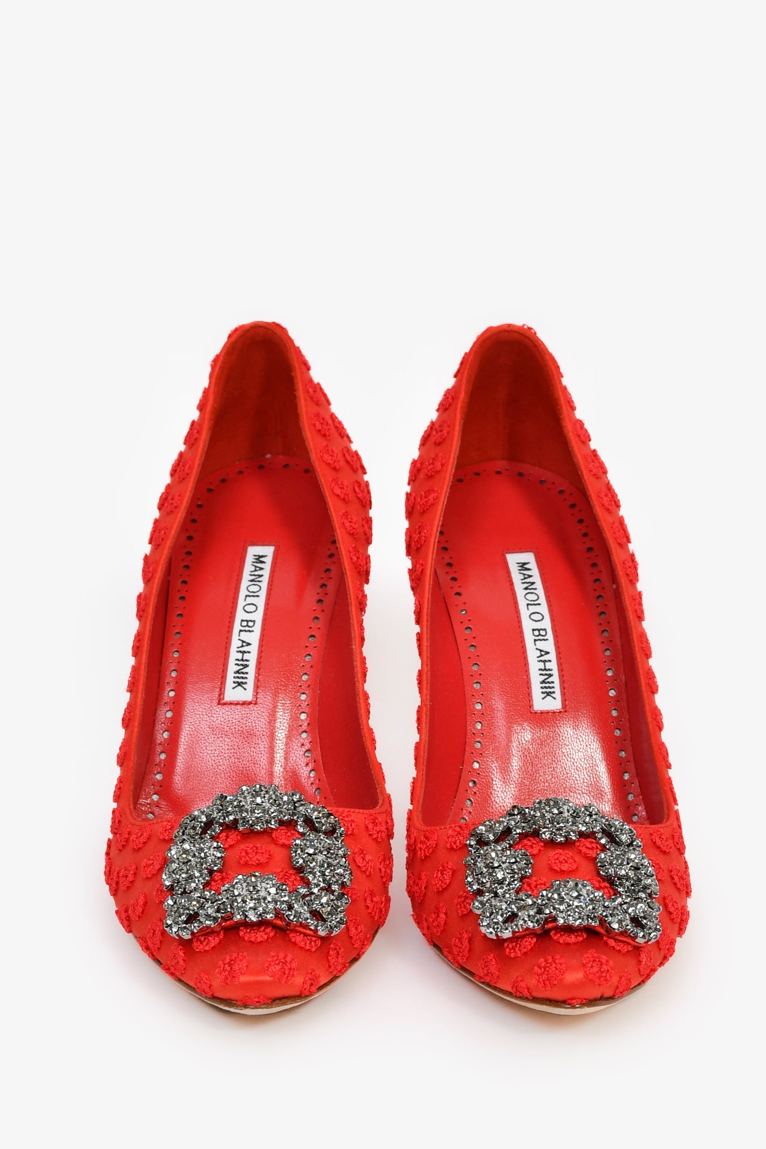Manolo Blahnik Red Satin Crystal Embellished 'Hangisi' Heels Size 36.5