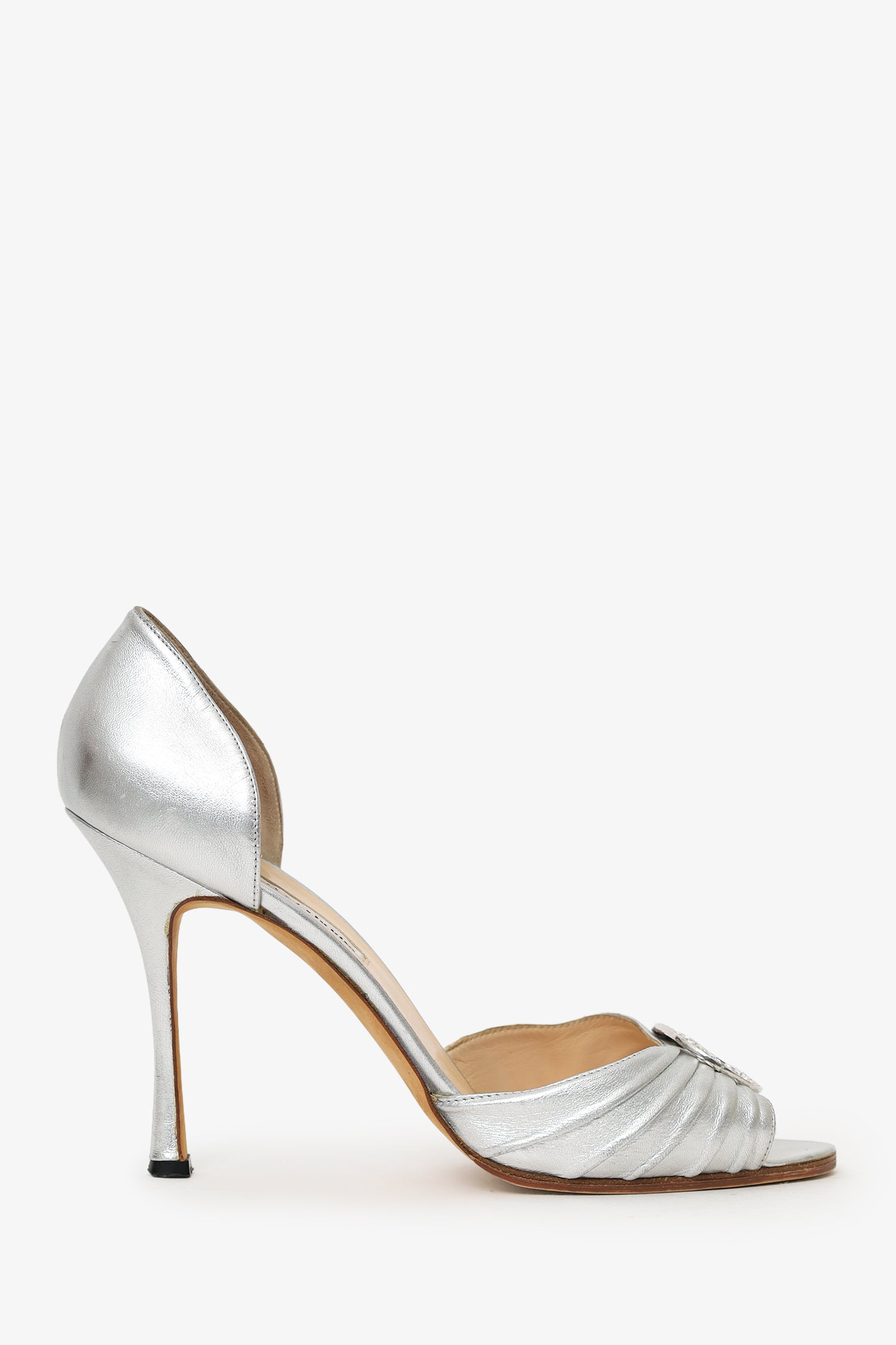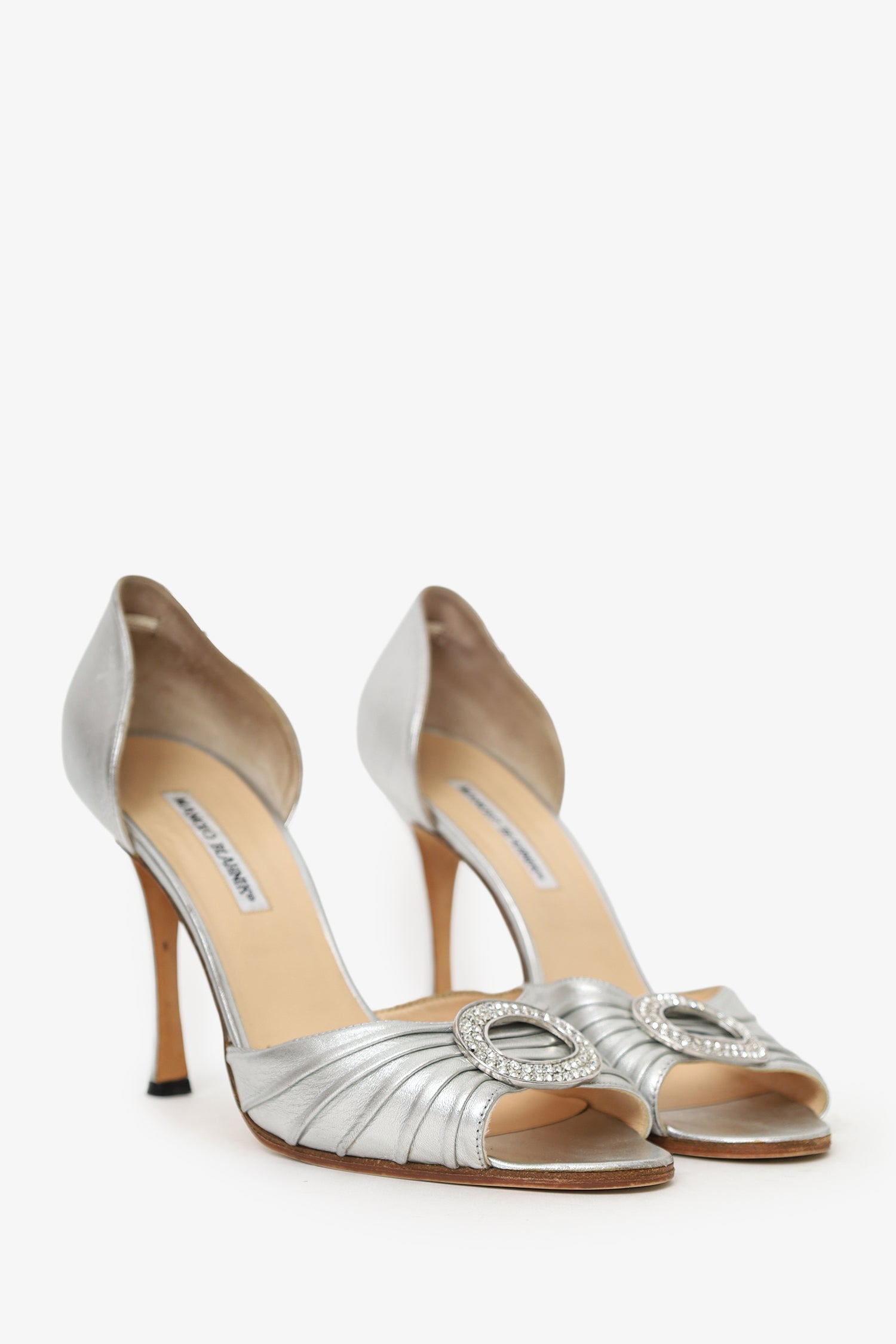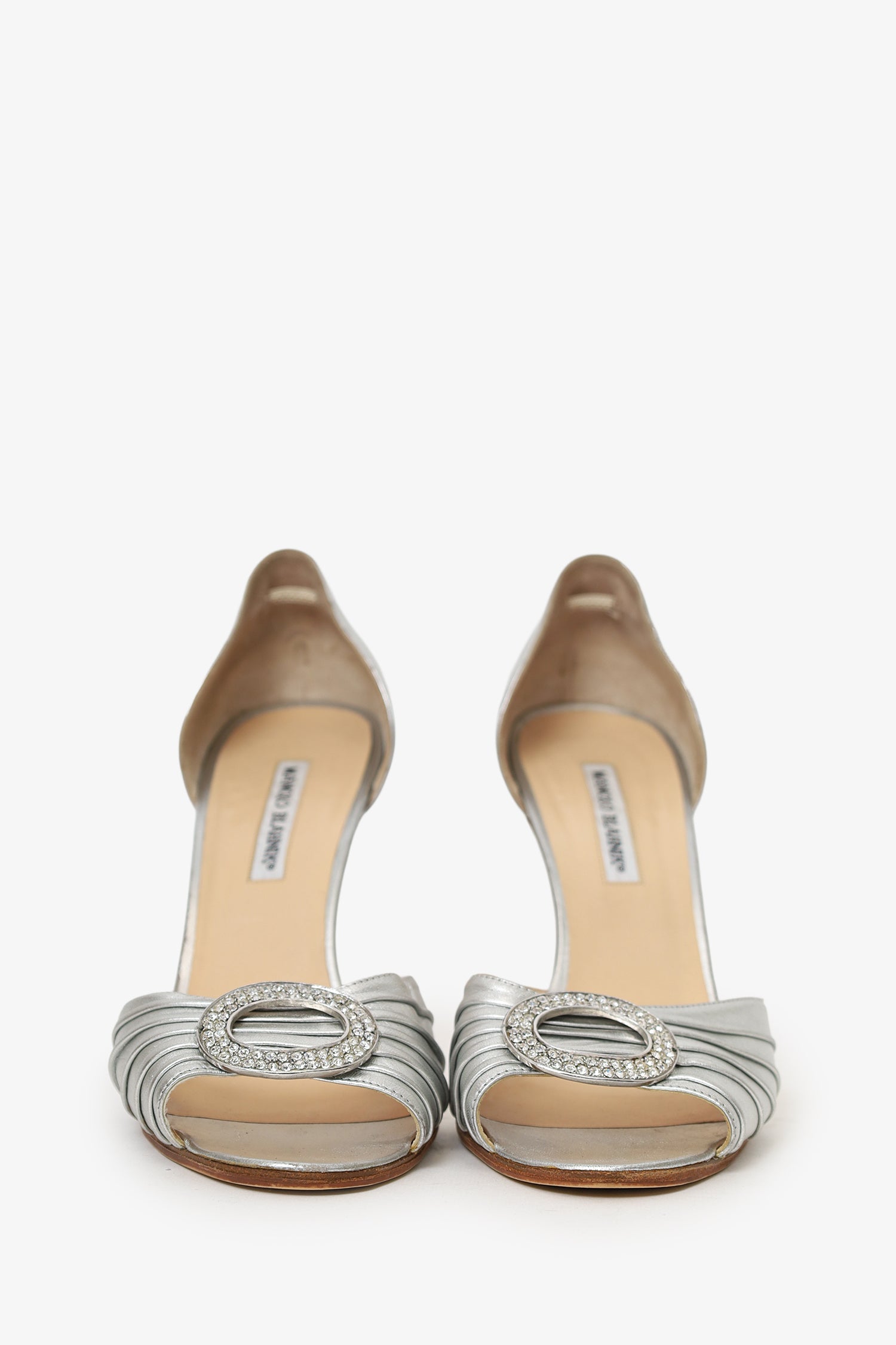 Manolo Blahnik Silver Leather Crystal Buckle Heels. Slip-on. Round peep-toe. Lined interior. Silver-tone hardware. Tonal stitching.