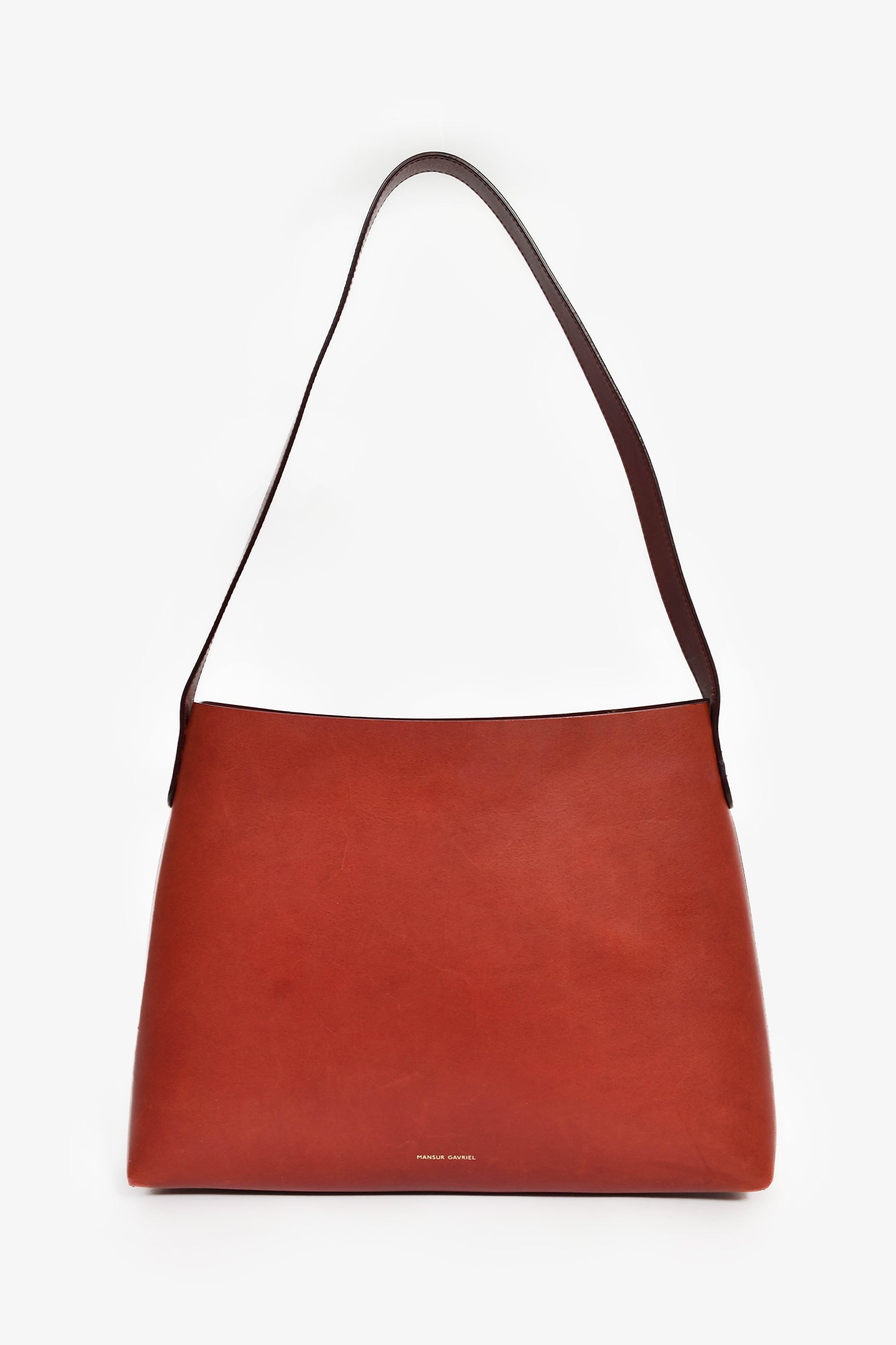 Mansur Gavriel Bordo Saddle Leather Small Hobo Bag. Top open. Single shoulder strap. Lined leather interior with a slip compartment. Tonal stitching.