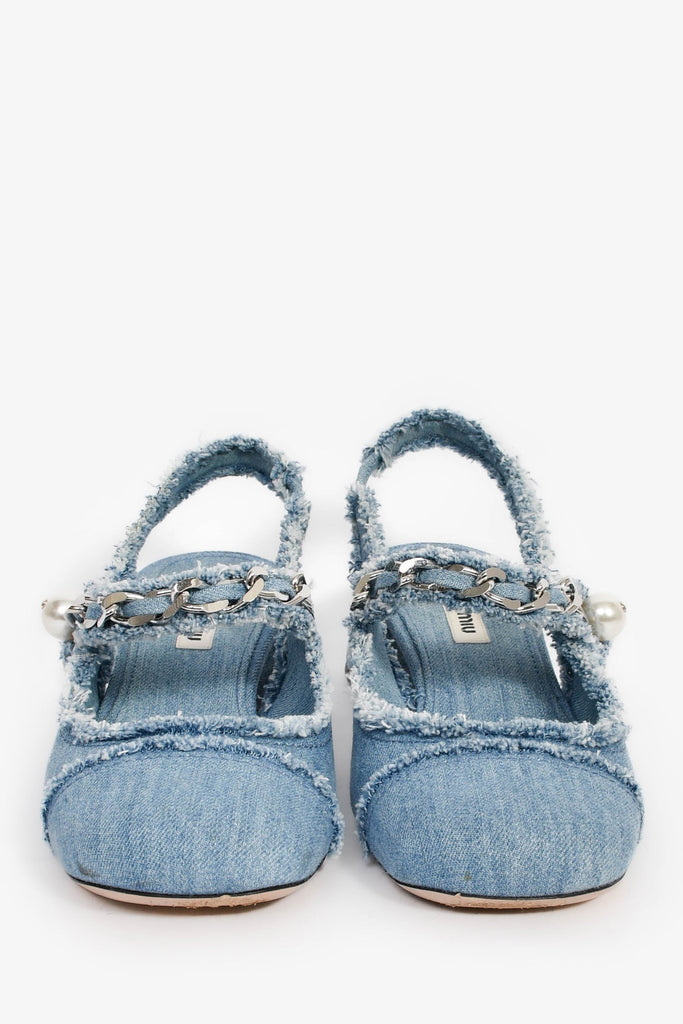 Miu Miu Blue Denim Frayed Chain Pearl Detail Slingback Pumps Size 37