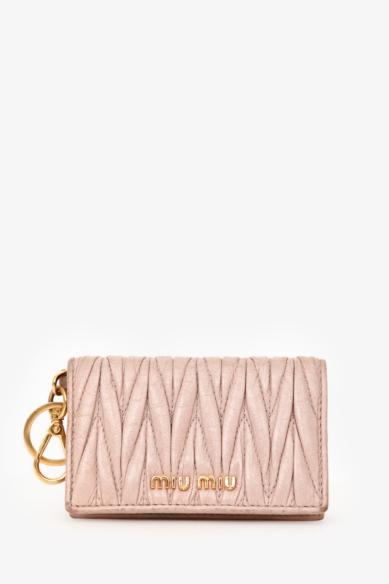 Miu Miu Cream Matelassé Leather Cardholder Keychain. Front fold-over flap with snap-button closure. 4 card slots. Key ring and lobster clasp. Gold-tone hardware. Tonal stitching.