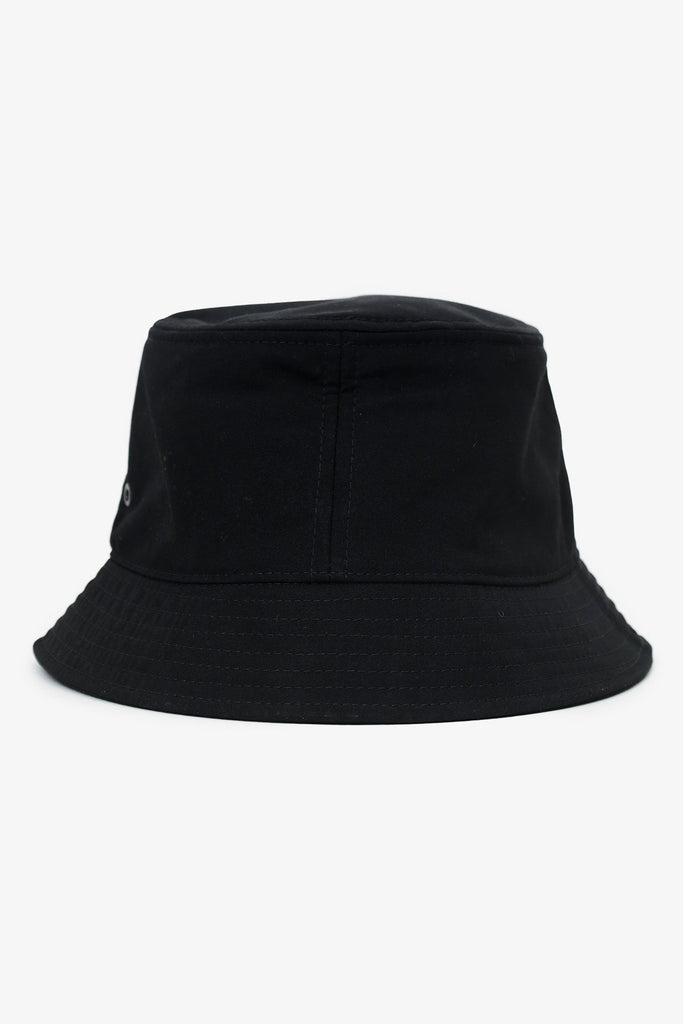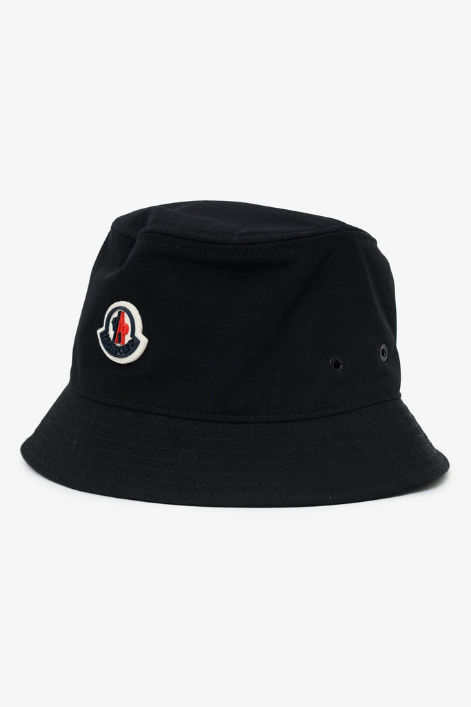 Moncler Black Bucket Hat. Logo embellishment to front. Tonal stitching.