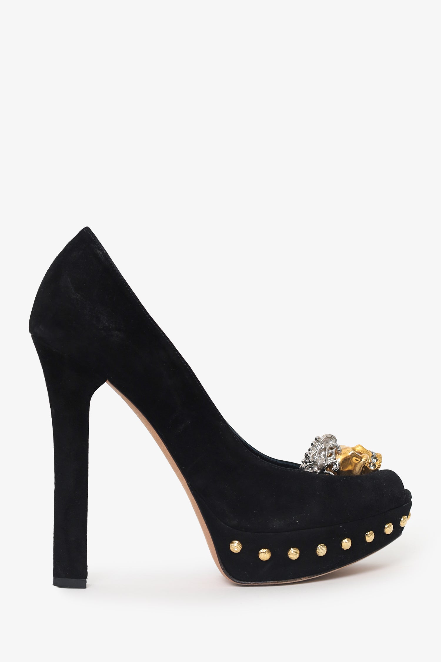 Alexander McQueen Black Suede Skull Studded Peep Toe Heels Size 37.5