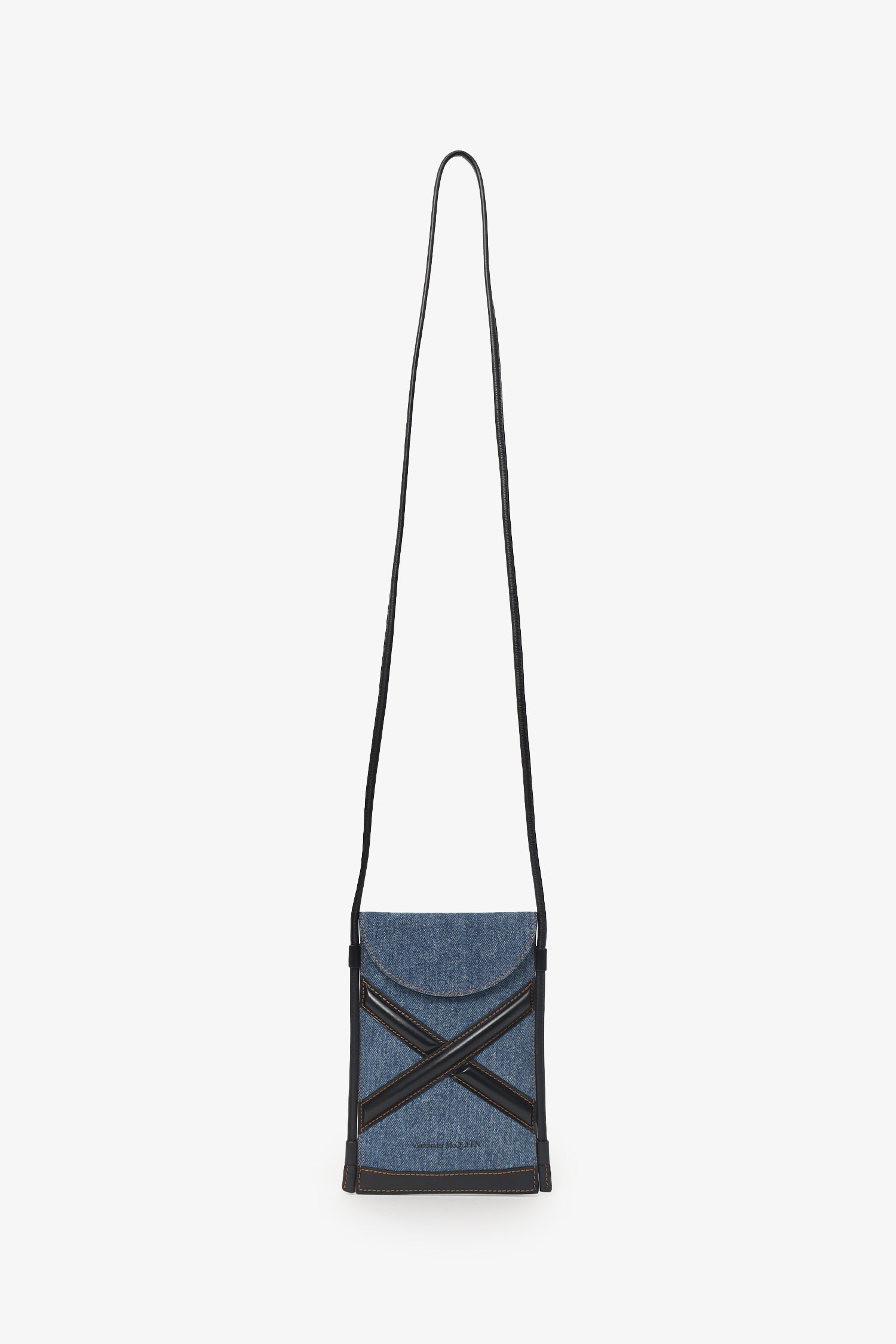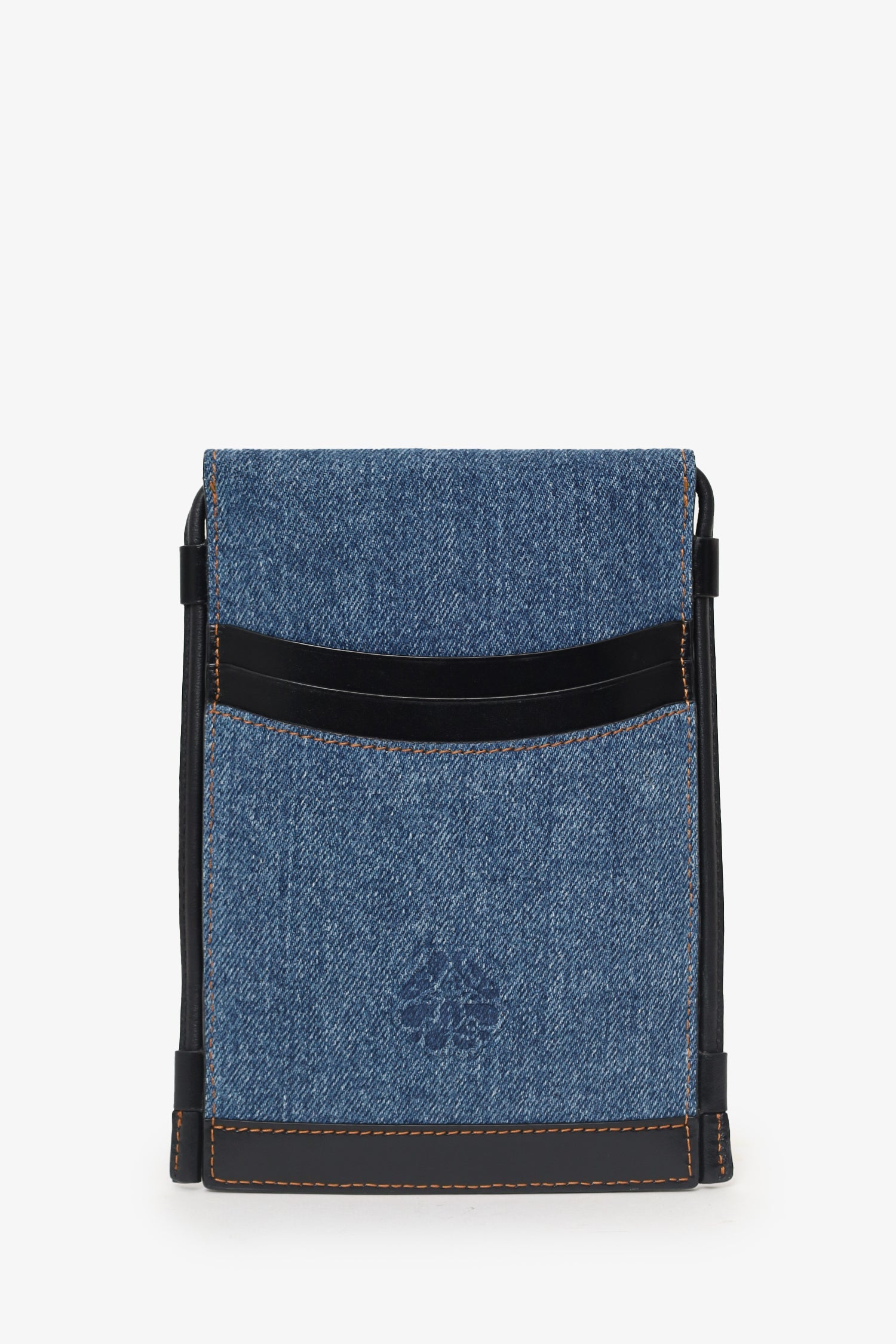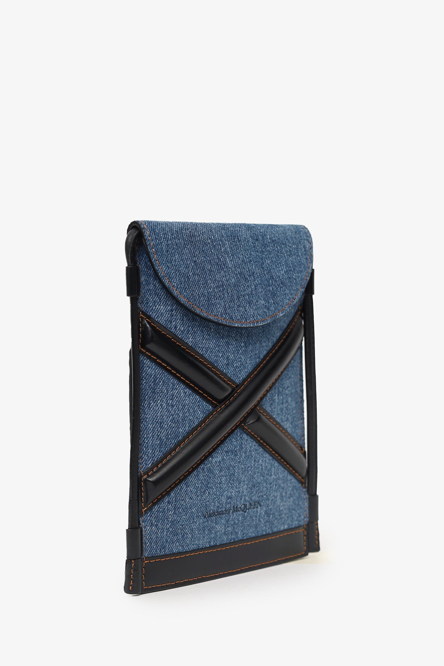 Alexander McQueen Denim Leather Crossbody Bag. Front-fold-over-flap with snap-button-up closure. Leather crossbody strap. 3 exterior rear slip pockets. Leather-lined interior. Silver-tone hardware. Contrast and tonal stitching.