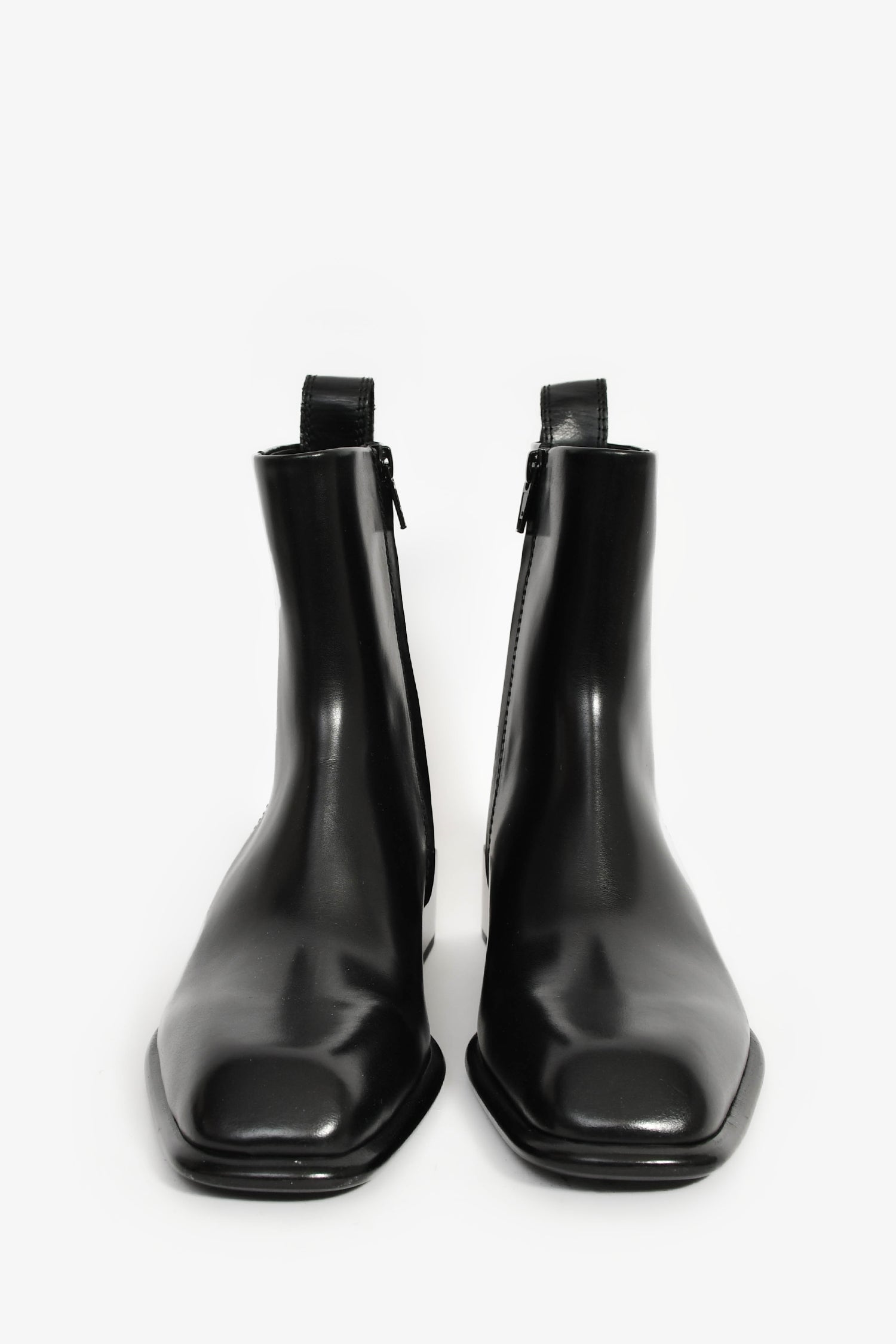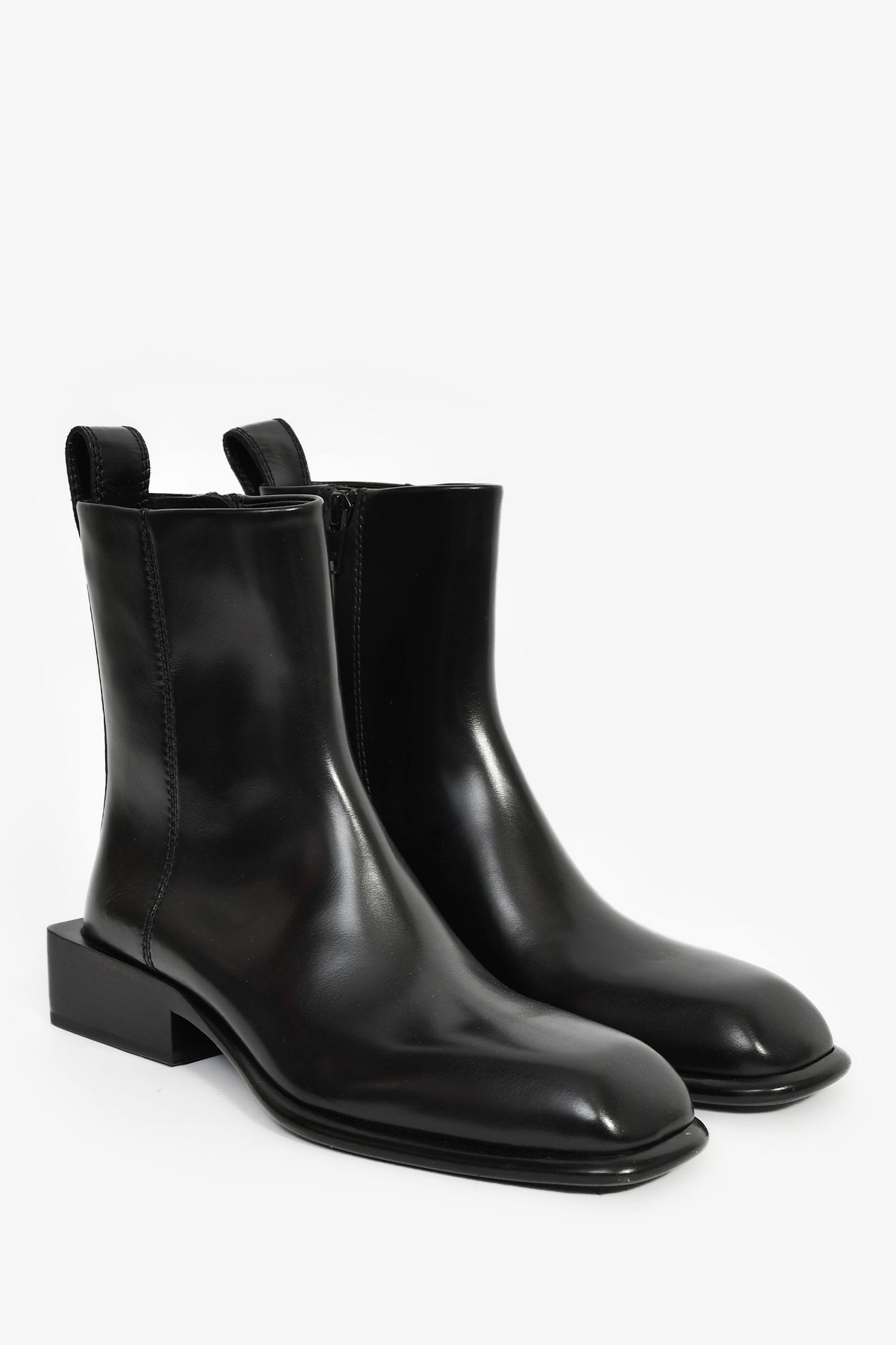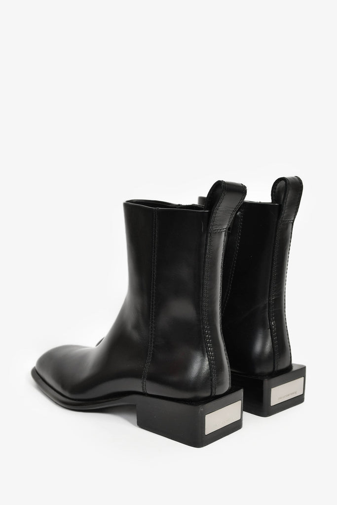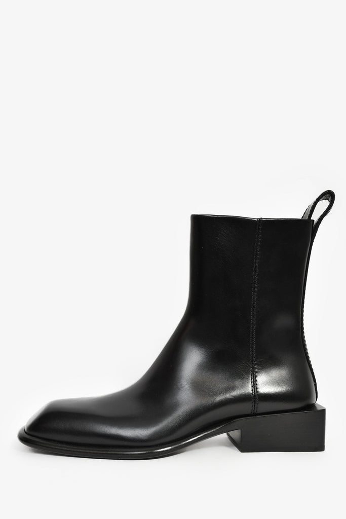 Alexander Wang Black Leather 'Throttie' Ankle Boot. Pull-on. Tapered square toe. Side zipper closure. Tonal stitching.