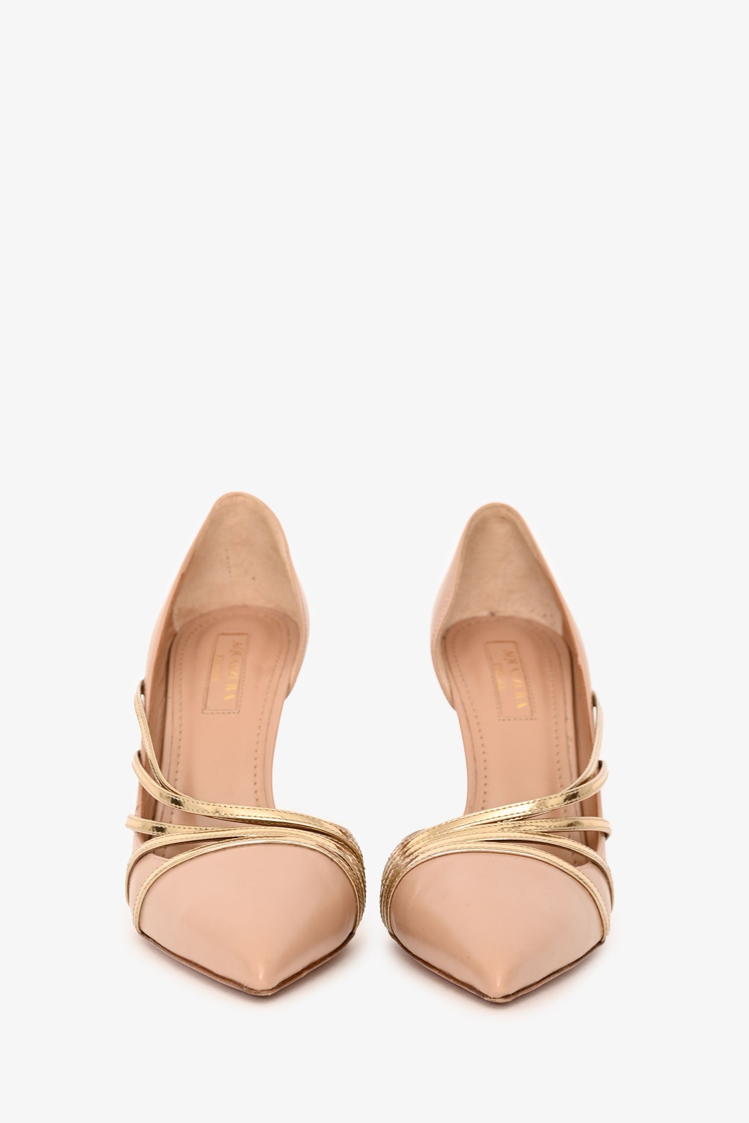 Aquazurra Beige/Gold Patent Leather Heels. Slip-on. Pointed toe. Leather insole. Tonal stitching.